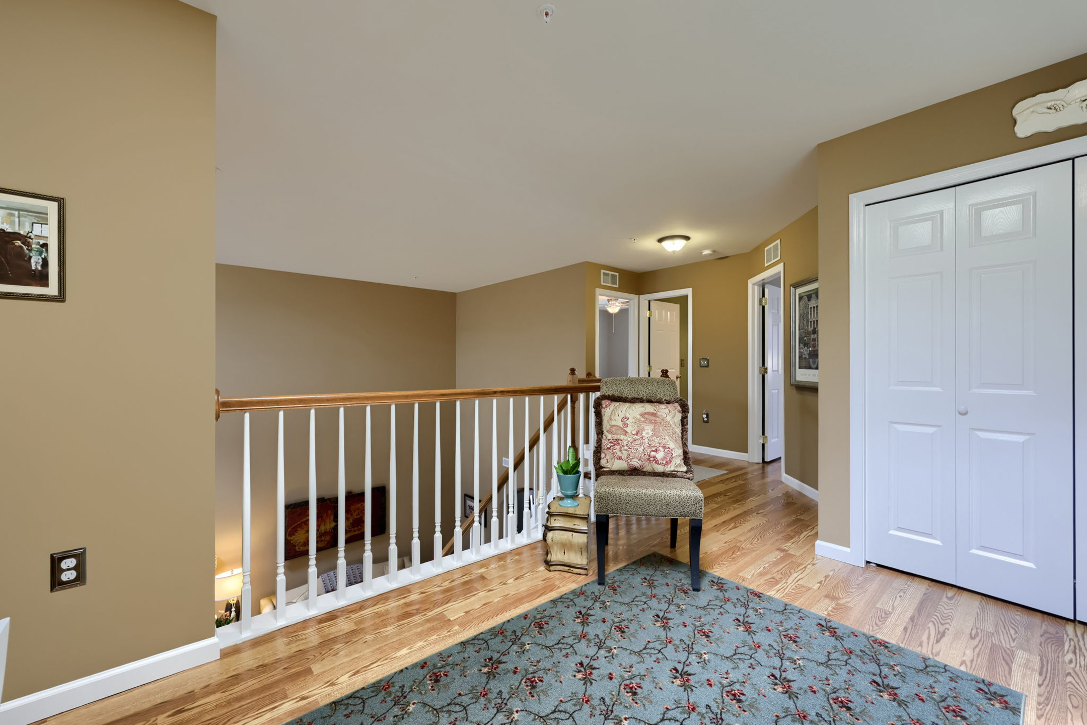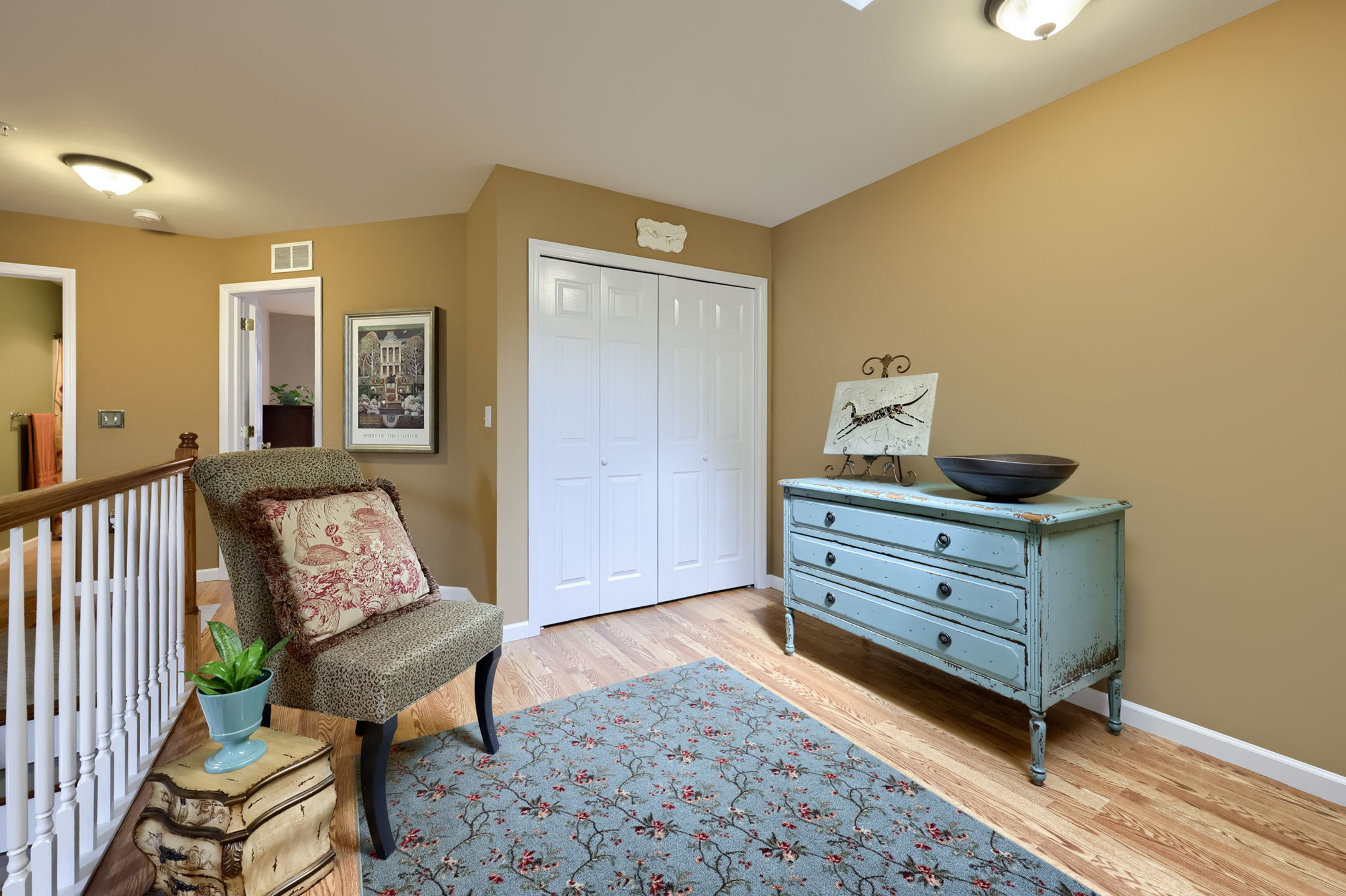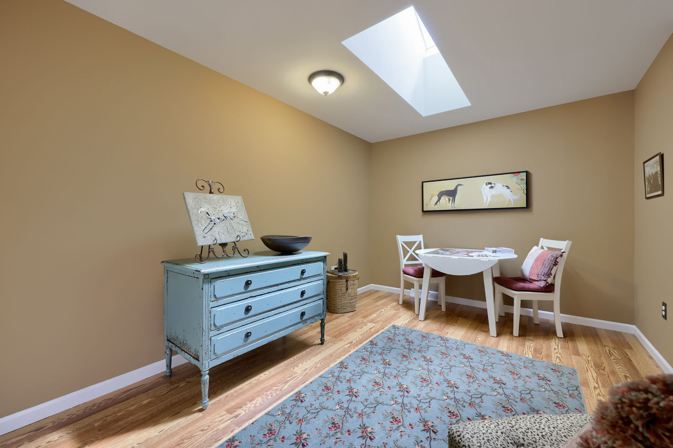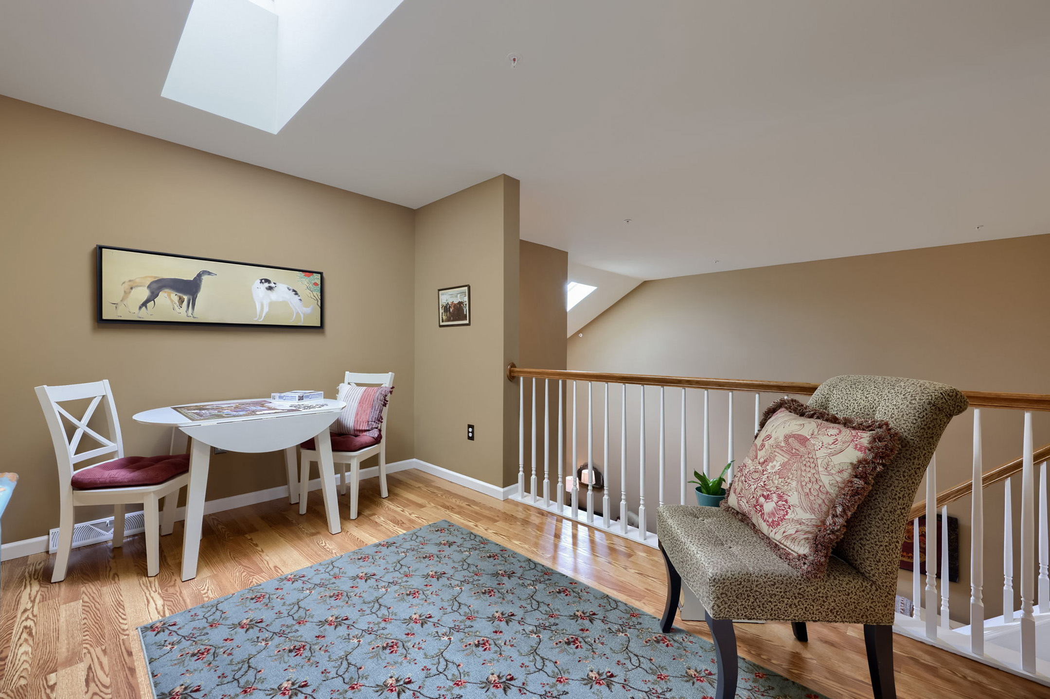 Upstairs, the home continues to open up with a loft with pergo flooring overlooking the living room below—perfect as a reading nook, sitting area, or flexible workspace, all enhanced by natural light from another skylight. Two additional bedrooms provide comfortable accommodations, each with a large closet, windows with window treatments, and pergo floors. The full bathroom features a walk-in tub/shower, built-in cabinetry, ceramic flooring, wall sconces, and recessed lighting.