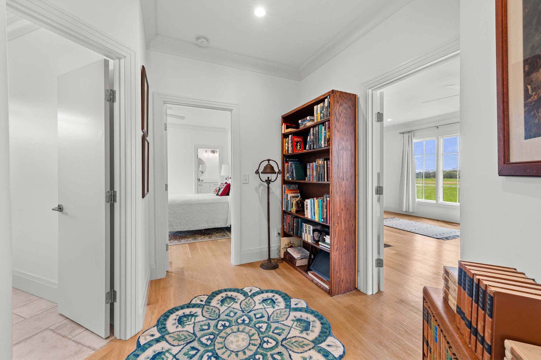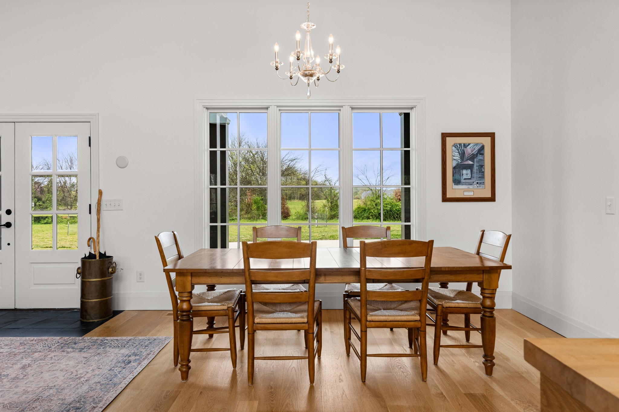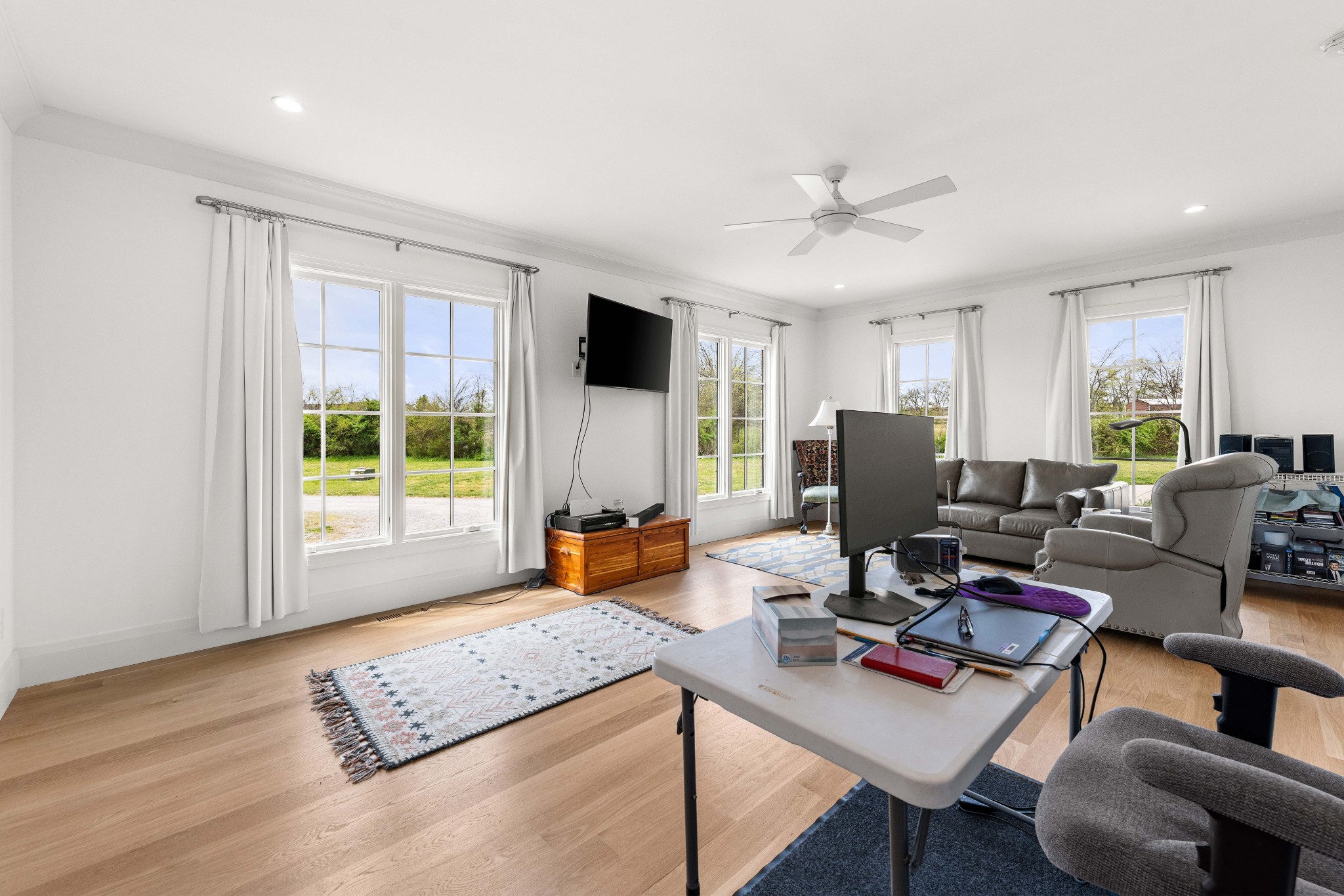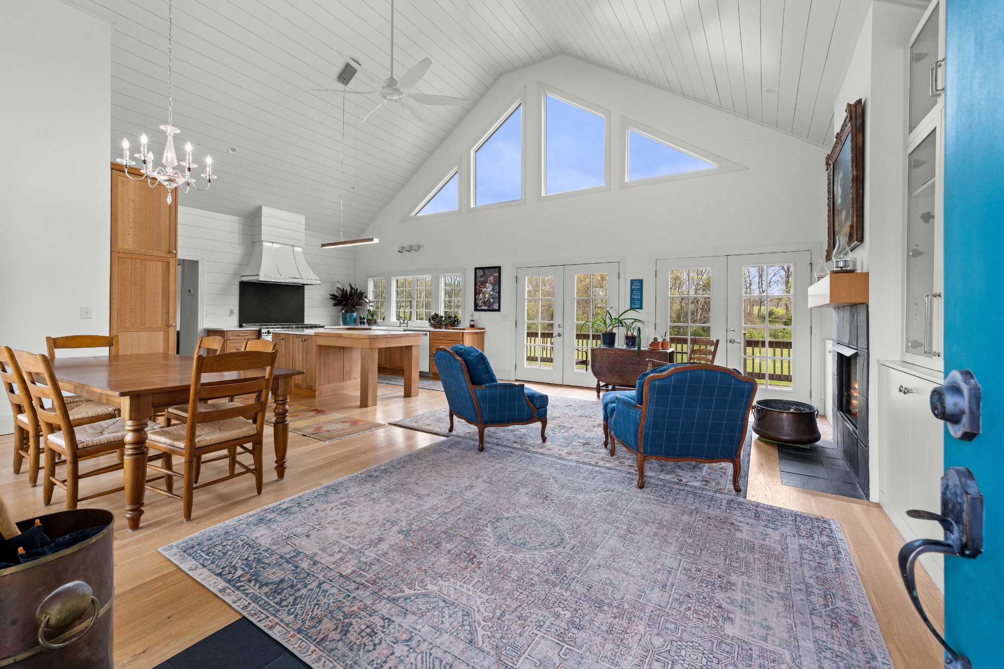Tucked behind a long private drive on 14± acres of rolling Sumner County countryside, this custom brick home delivers the privacy, land, and quality that are increasingly hard to find this close to Gallatin's amenities. The property features open pasture, established fencing, and a creek along the edge — ready for horses, livestock, or a hobby farm — all framed by wooded ridgelines and long pastoral views from the rear deck. Inside, the soaring shiplap cathedral ceiling anchors a grand open great room and kitchen that few custom builds in this price range can match. Wide-plank hardwood floors, clerestory windows flooding the space with natural light from above, a wood-burning fireplace flanked by built-in cabinetry, and French doors opening to the oversized rear deck make this a space built for both everyday living and large-scale entertaining. The kitchen is a serious cook's environment — custom white oak cabinetry, professional BlueStar range, designer range hood, farmhouse sink with pasture views, quartz countertops, butcher block prep island, and a large walk-in pantry. The primary suite is privately situated with direct deck access and open field views, and features a spa-quality ensuite with double vanity, quartz counters, and an oversized tile shower with frameless glass enclosure. An additional en-suite bedroom, a generously sized flex room with fourth bedroom potential, a dedicated laundry room with utility sink and full cabinetry, and an enlarged two-car garage complete the thoughtful one-level floorplan. Zoned for Liberty Creek Schools — one of Sumner County's most sought-after school assignments. Whether your vision is a private retreat, a working hobby farm, or simply a custom home with room to breathe, 989 Franklin Road checks every box without compromise. The home's east-to-west orientation maximizes natural light throughout the day, and the rear deck's sweeping pasture and tree line views remind you at every turn exactly why you chose this property.