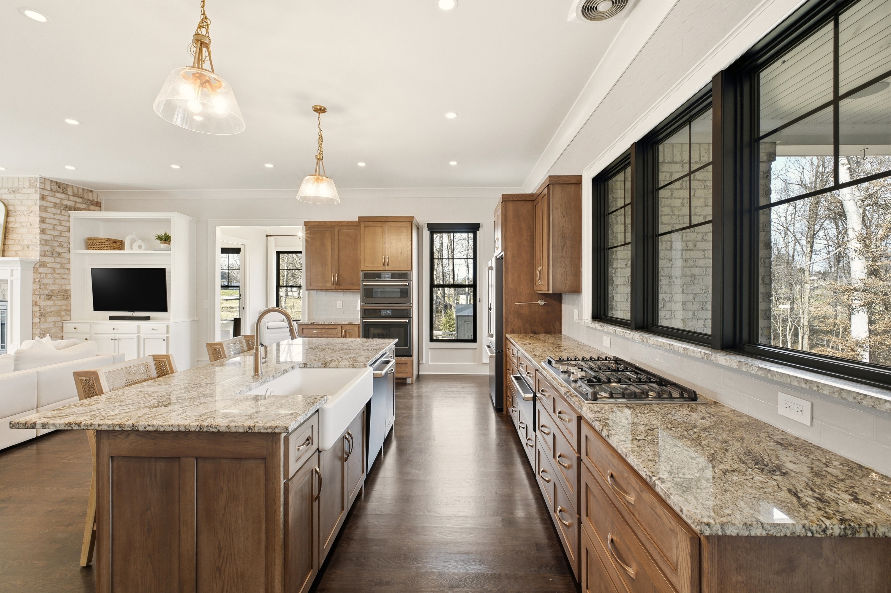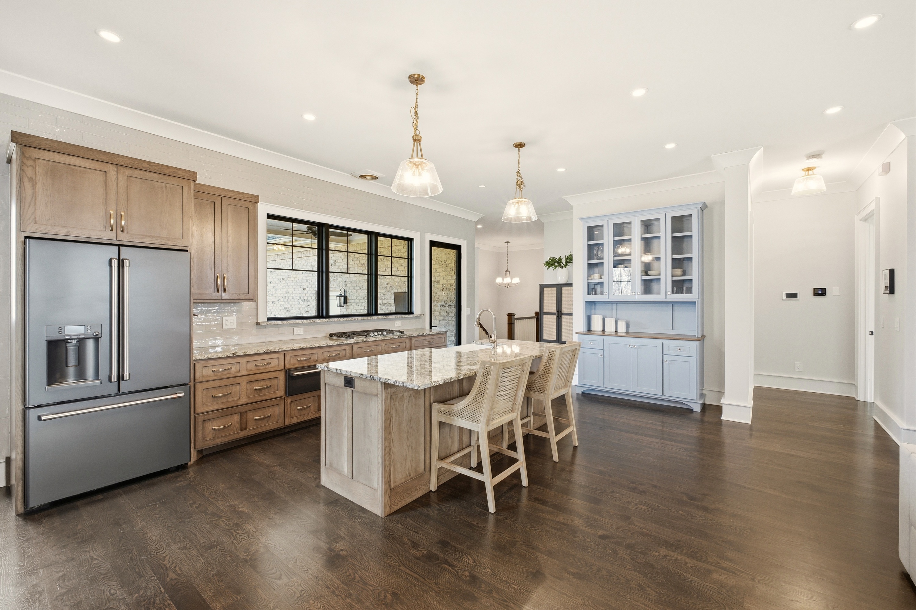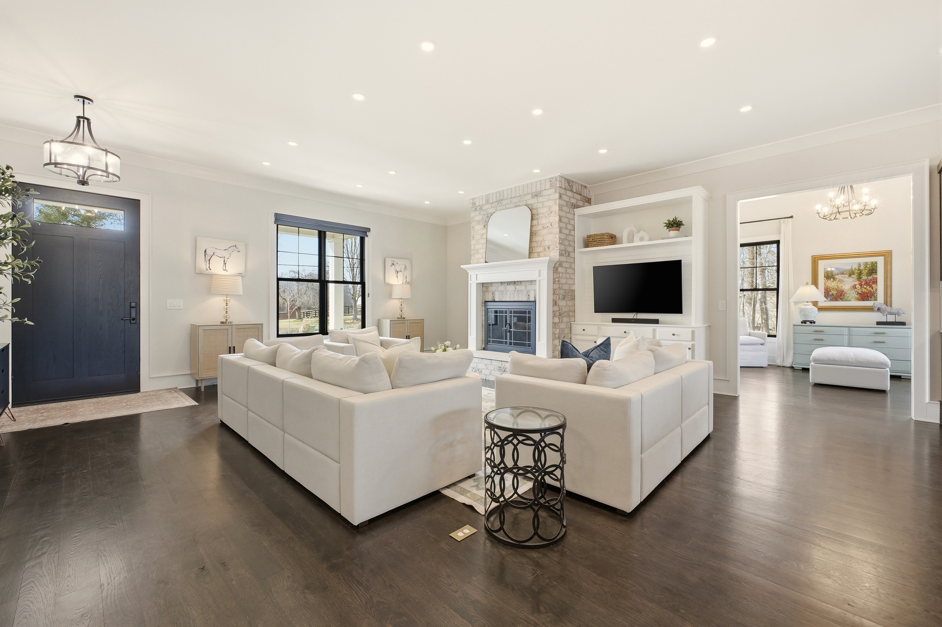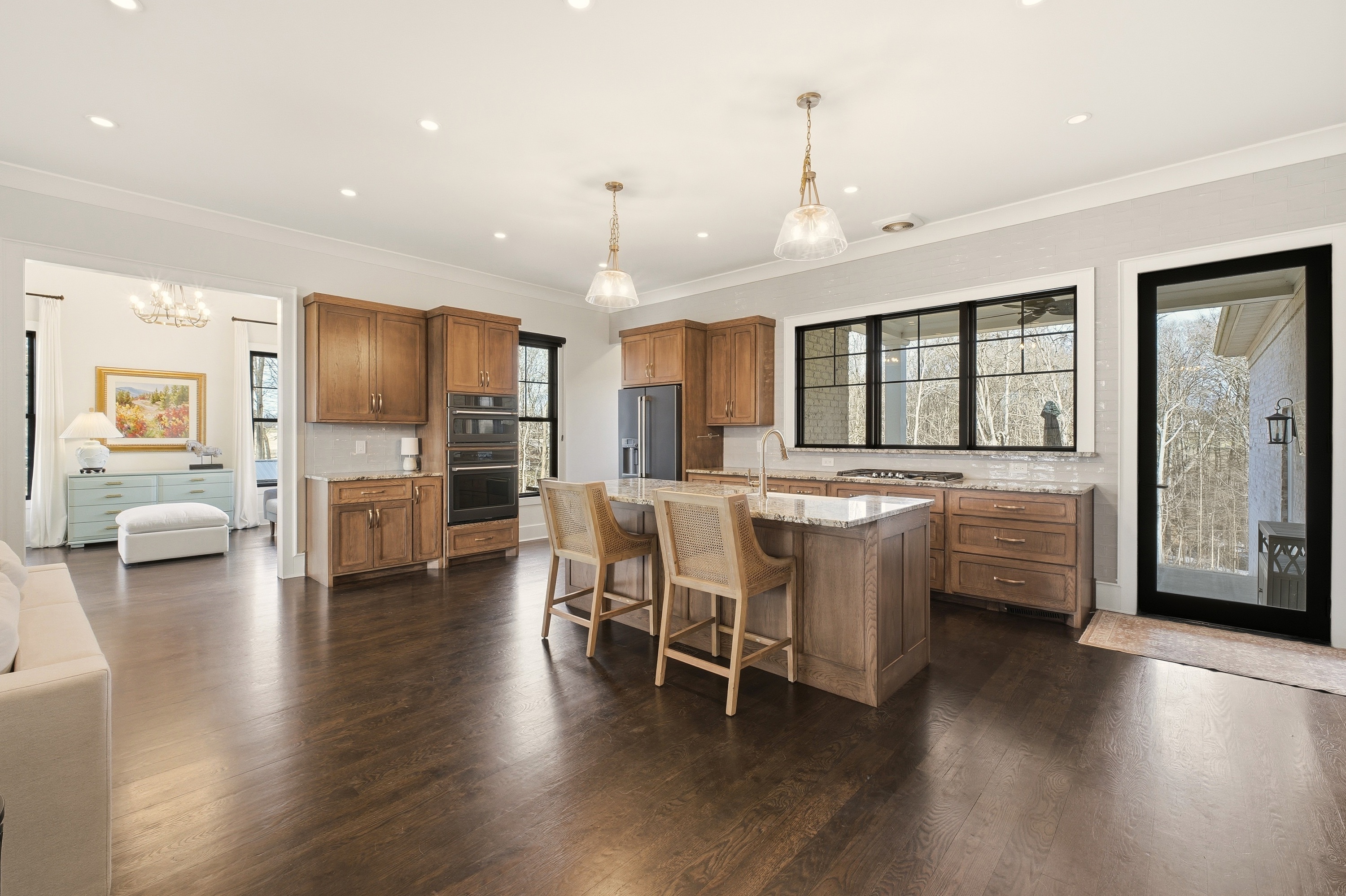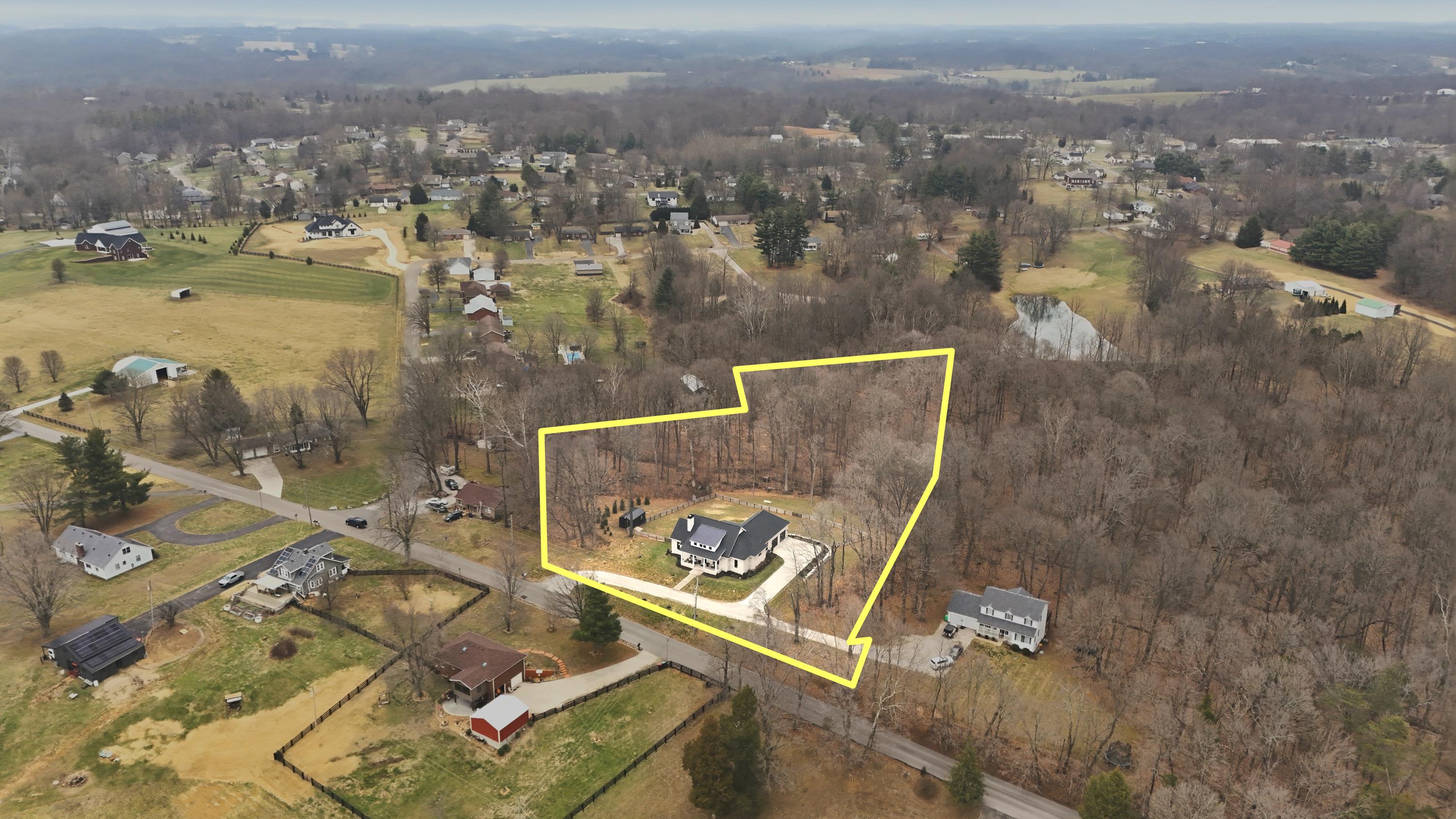 Situated on over 4 acres in Floyds Knobs, this custom built home offers the feel of new construction with the finishes and attention to detail today's buyers love. Enjoy picturesque land with no HOA, all while being just minutes from amenities and schools. An expansive covered front porch welcomes you inside, where abundant natural light, high ceilings, detailed trimwork, and hardwood flooring run throughout the first floor. The gourmet kitchen features a row of windows overlooking the park like backyard, custom cabinetry, granite countertops, a large center island, and top of the line appliances including a gas range and warming drawer. Tucked just off the kitchen is a walk in pantry with custom built ins. Just beyond the kitchen, a covered porch offers peaceful views, ideal for enjoying evenings at home. A recently added fence provides added convenience. The kitchen also opens to a bright morning room with a vaulted shiplap ceiling and attached office space with built ins. The private primary suite is a true retreat, featuring a spa like bathroom with dual sinks, soaking tub, large tiled walk in shower, and a custom closet. A second bedroom with its own en suite bath and walk in closet, large laundry room, and powder room complete the first floor. The walkout lower level offers 1,669 square feet of finished living space with stained concrete flooring, built in cabinetry, wet bar, second fireplace, bedroom with en suite bath, additional half bath, and a recently finished hidden safe room behind the bar area. Additional updates include a 12 x 20 outdoor garden shed, whole home water softener system, radon system, backyard fence, and new landscaping including green giants for added privacy. With over 4,000 finished square feet, an additional nearly 1,000 square feet of unfinished space, and 3 bedrooms with 5 bathrooms, this exceptional Floyds Knobs property offers the perfect blend of luxury, privacy, and convenience. Contact us to arrange your private viewing.