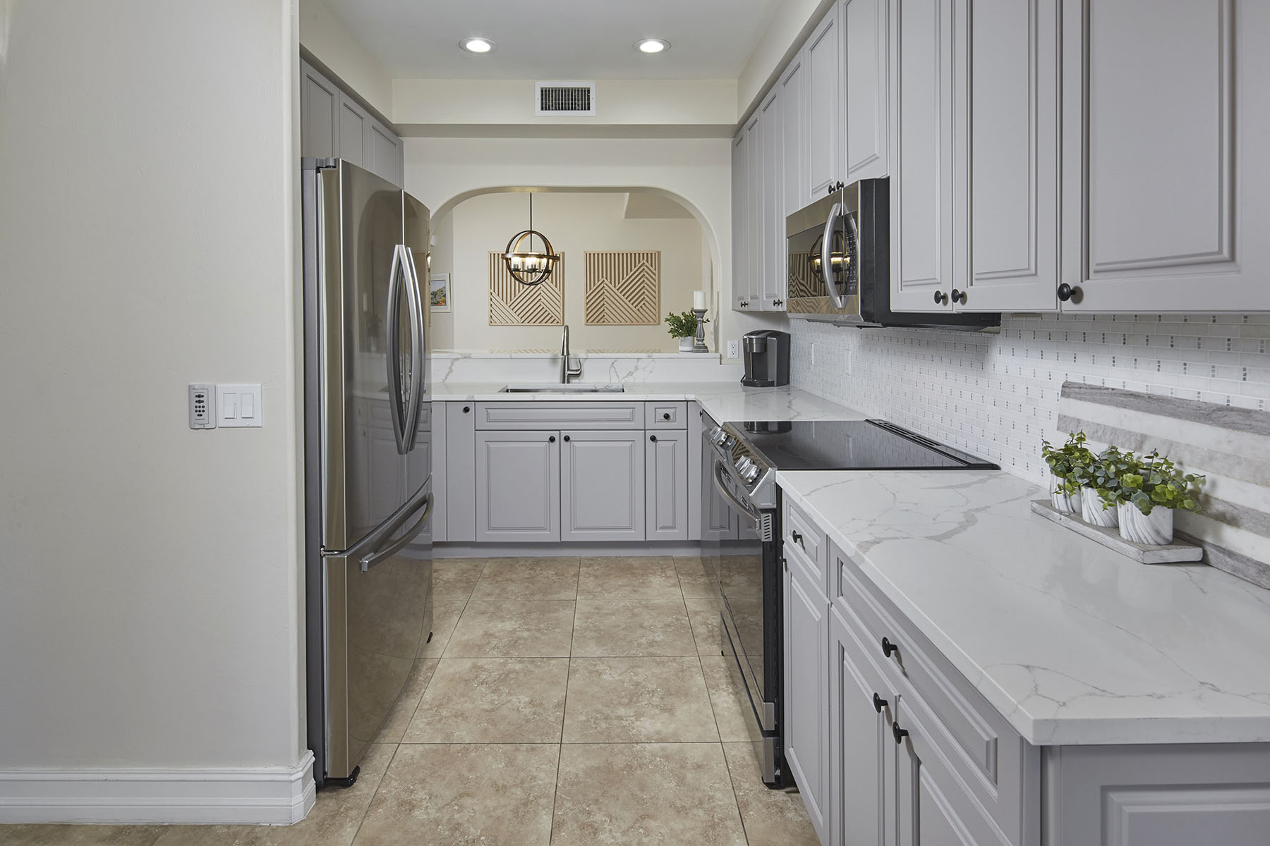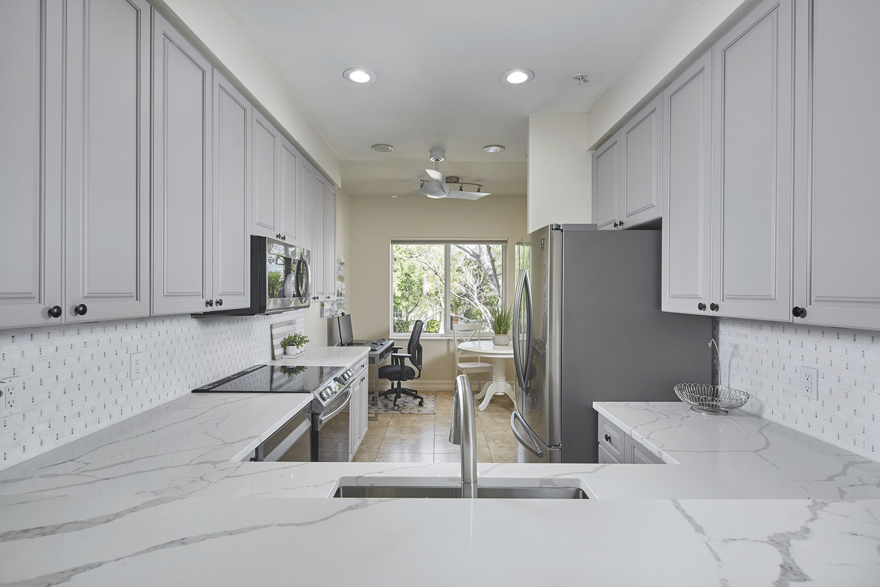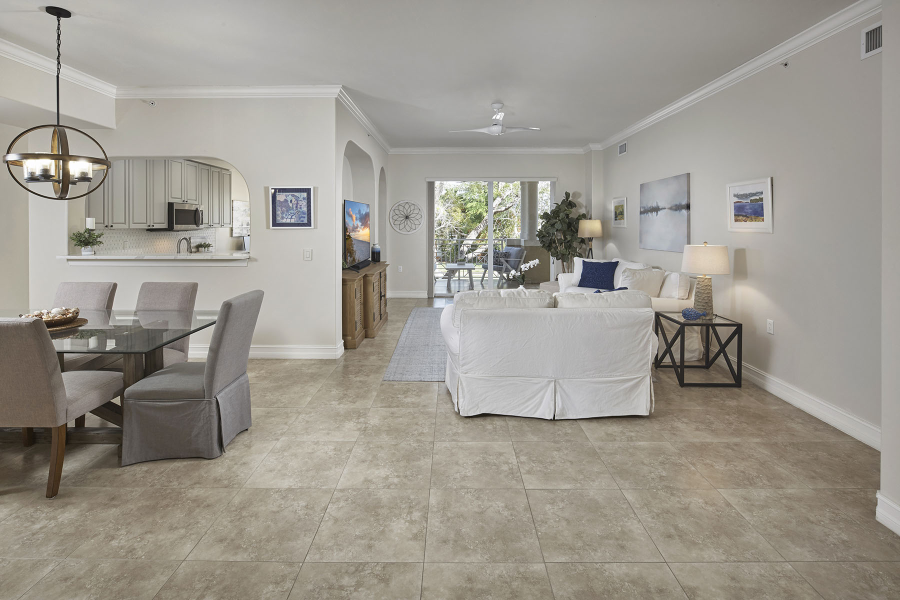 Welcome to this three-bedroom, two-bath condominium at The Residences at City Centre of Naples. Built in 2008, this residence offers 1,869 square feet of interior living space within a boutique building of only 12 residences, providing a more private ownership experience and accessible city living environment. The interior features hard surface flooring throughout the main living areas, with both guest bedrooms finished with carpet. The great room provides direct access to a private balcony, creating a seamless connection to outdoor living. A formal dining room is adjacent to the kitchen, which includes new countertops, newer appliances, a pass-through to the dining area and a breakfast nook used as a home office. The kitchen nook also offers additional balcony access. The primary suite includes dual walk-in closets and a bath with dual sinks, a separate tub and a walk-in shower. Both baths have been updated with upgraded finishes. Impact-resistant glass doors and windows are installed throughout the property. Residents have access to a private community pool and spa with baths on the south side of the building, plus an outdoor terrace and grill area. Parking includes a private single garage and additional under-building, secured enclosed parking. The location offers proximity to area beaches, medical facilities, and a variety of dining and shopping destinations, supporting a walkable lifestyle in Naples.