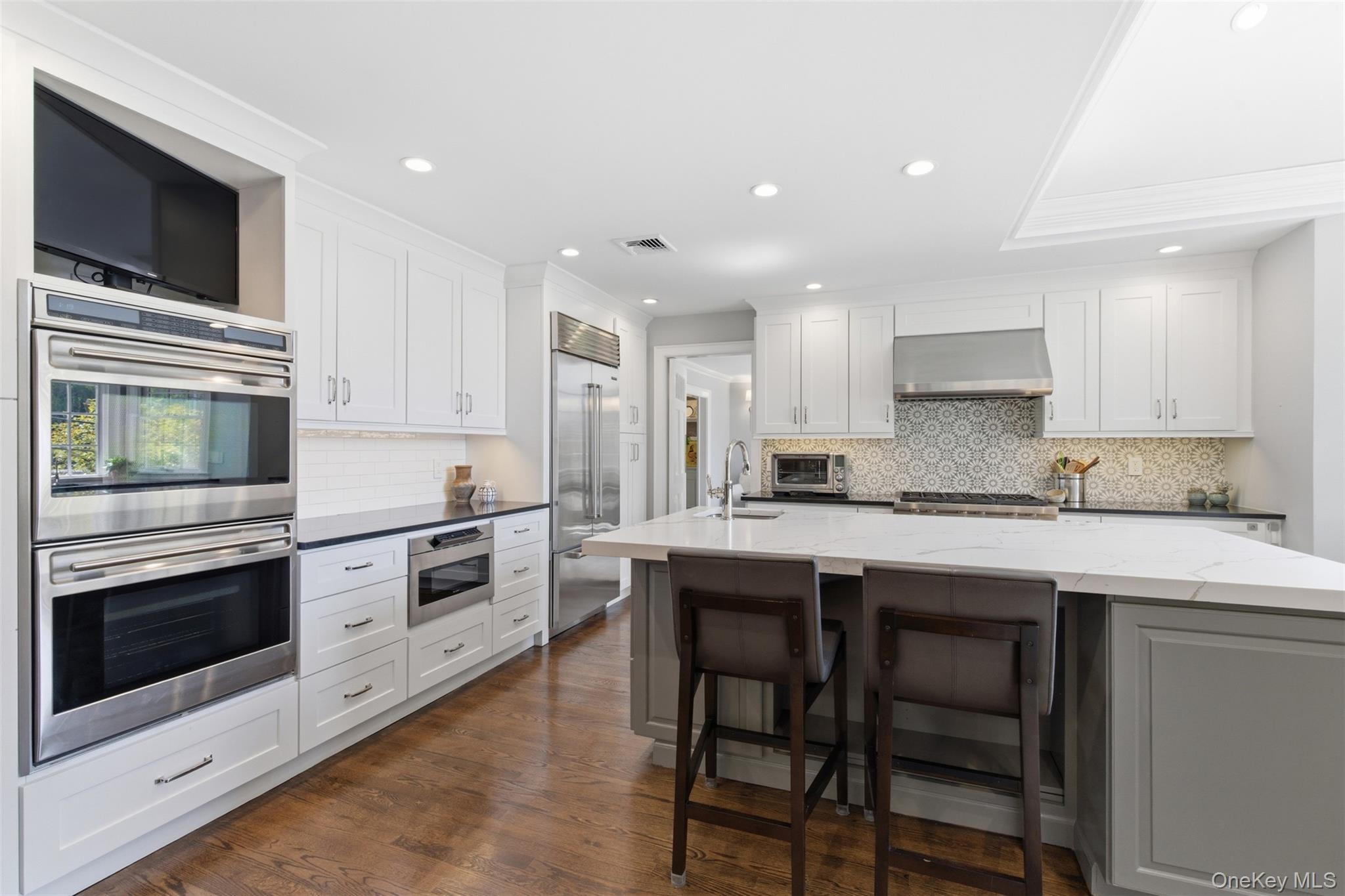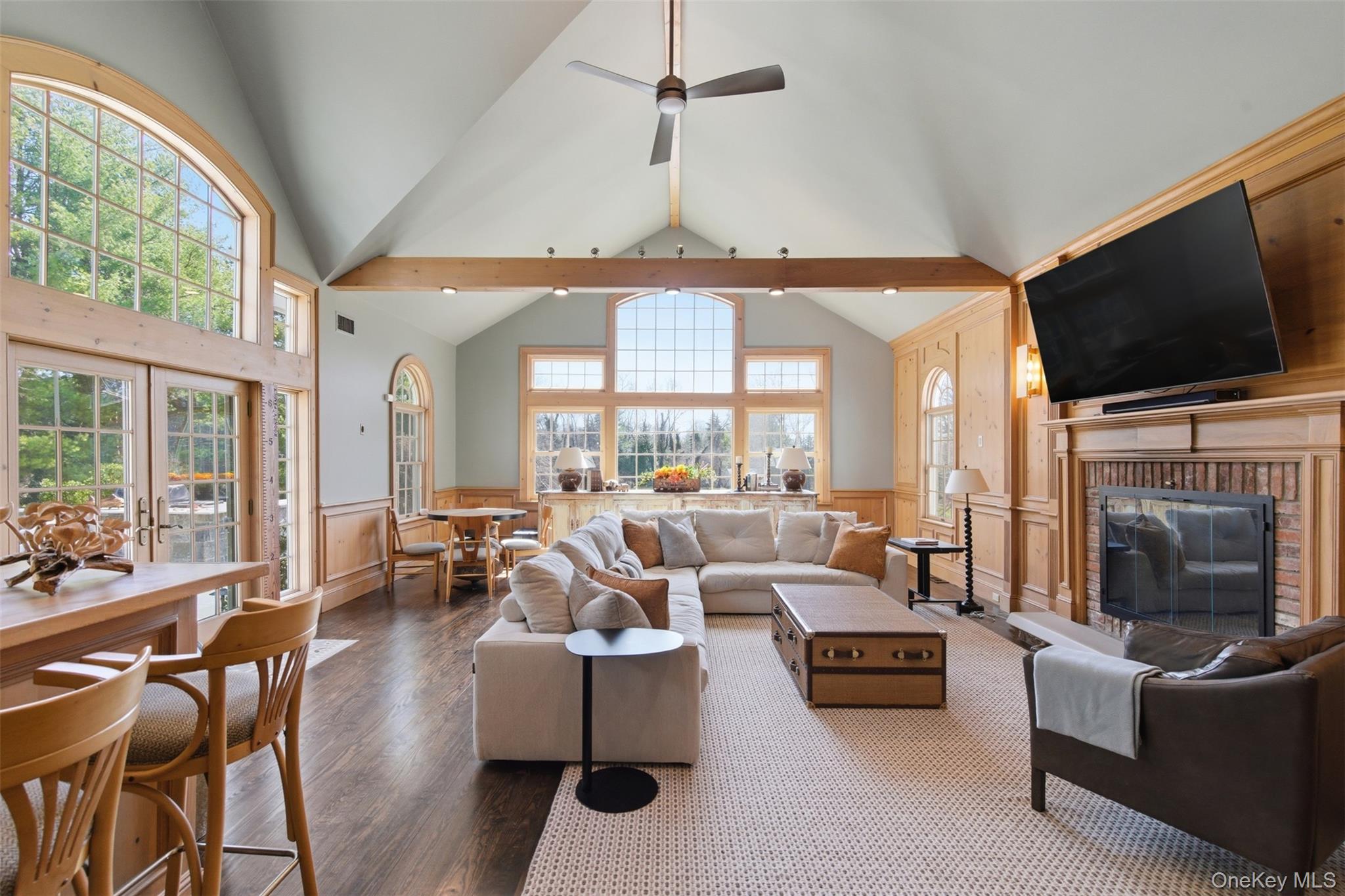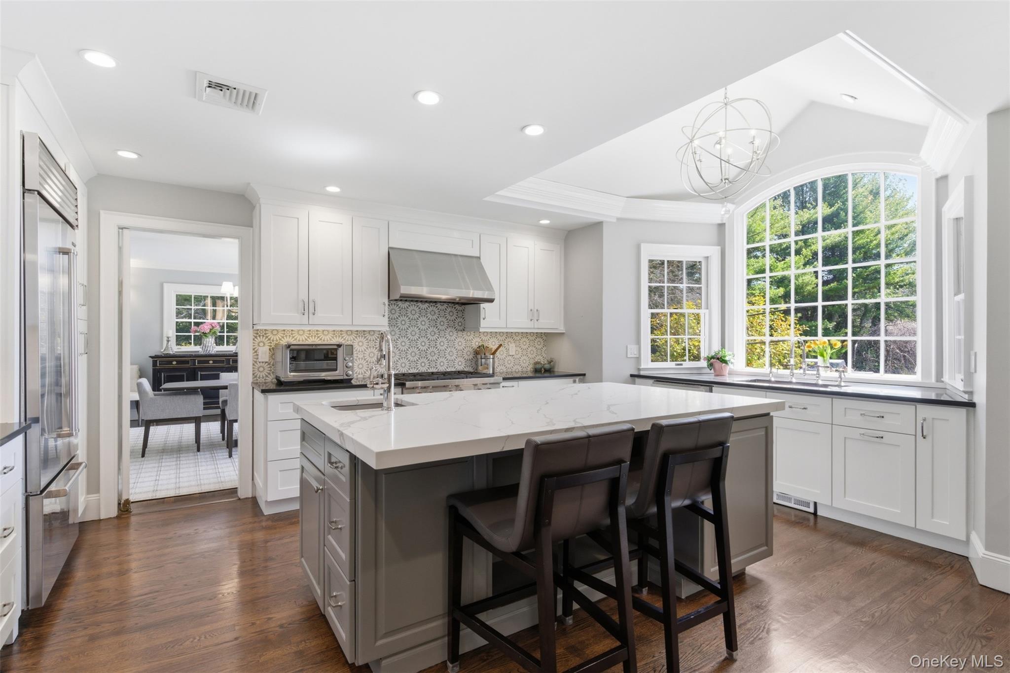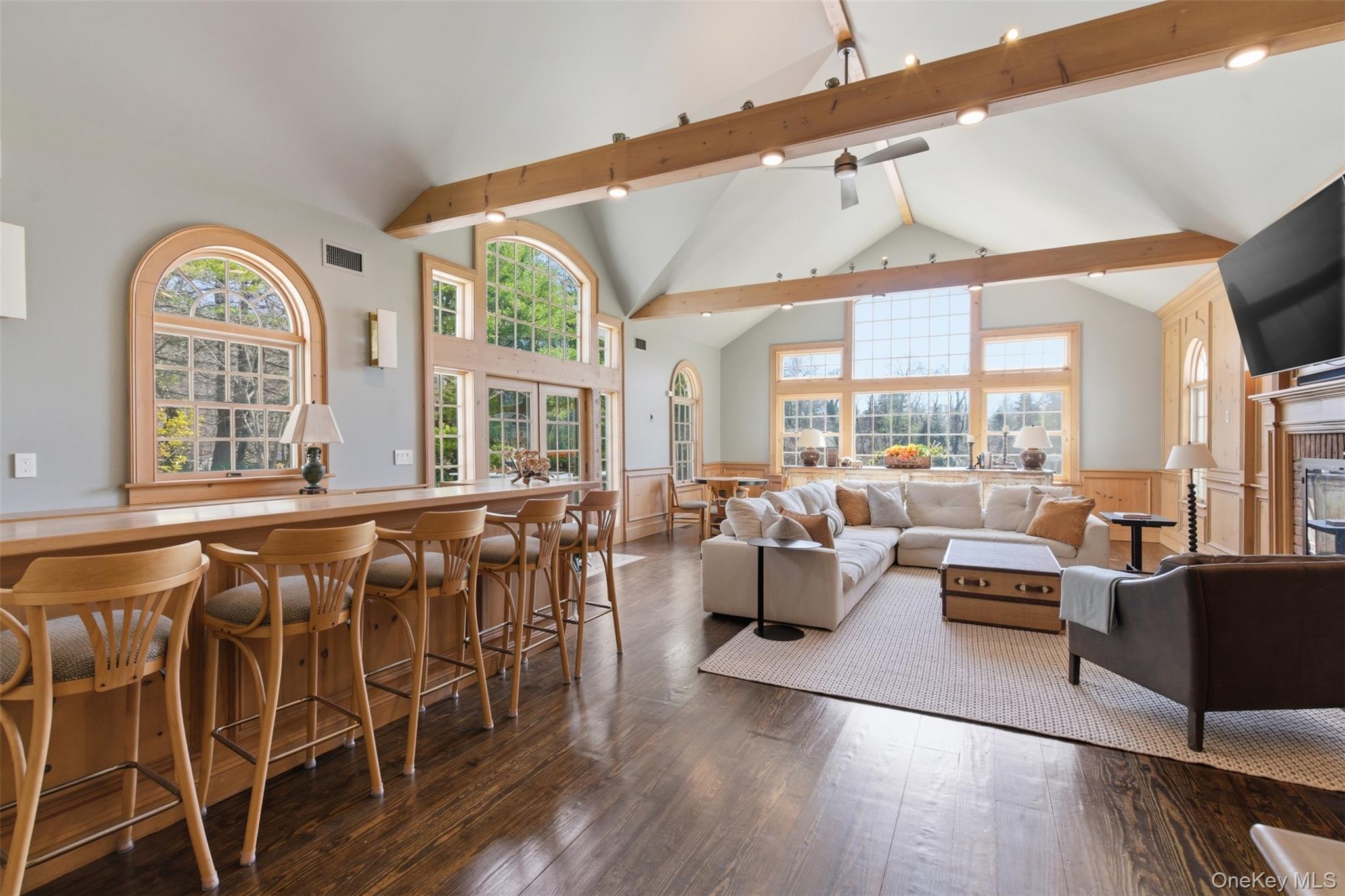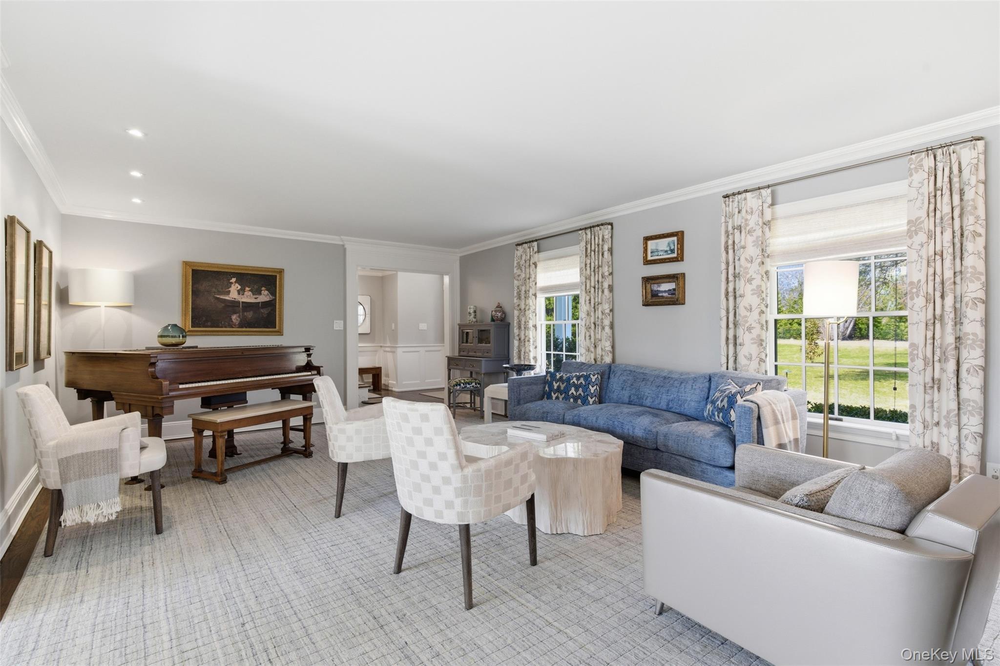 Perfectly set on a winding country lane, this charming colonial combines timeless craftsmanship with modern luxury on over two level, landscaped acres designed by Steven Dubner. The home showcases fine millwork and mouldings with hardwood flooring throughout the first floor. A welcoming entry leads to a gracious living room with a gas fireplace, dentil moulding surround, and built -in bookcases leading into a formal dining room. French doors open to a new bluestone terrace with flower beds, a full outdoor kitchen, views of the saltwater, and gunite pool with an electric cover and expansive grounds. The gourmet kitchen features black marble countertops, imported tile backsplash, a quartz center island with a prep sink and top -tier appliances, including a Wolf cooktop, double wall ovens, Subzero refrigerator/freezer, Miele dishwasher, Sharp microwave and wine refrigerator. A breakfast room with banquette flows into the spectacular great room with cathedral ceilings, exposed beams, a brick wood-burning fireplace, built-in bar, Palladium window and terrace access. An office, laundry/mudroom and guest room with en suite bath complete the first floor.Upstairs, the Primary suite offers a sunlit sitting room/office, spacious bedroom, a luxurious marble bath with radiant heat, dual sinks, vanity, and two fully fitted dressing rooms. Additional accomodations include an en suite bedroom, two additional bedrooms with a shared new bath, a second washer/dryer and ample storage.A finished basement provides a playroom, storage, and easy access to the mechanicals. This is an exceptional home blending the charm of classic Long Island living with every modern convenience.