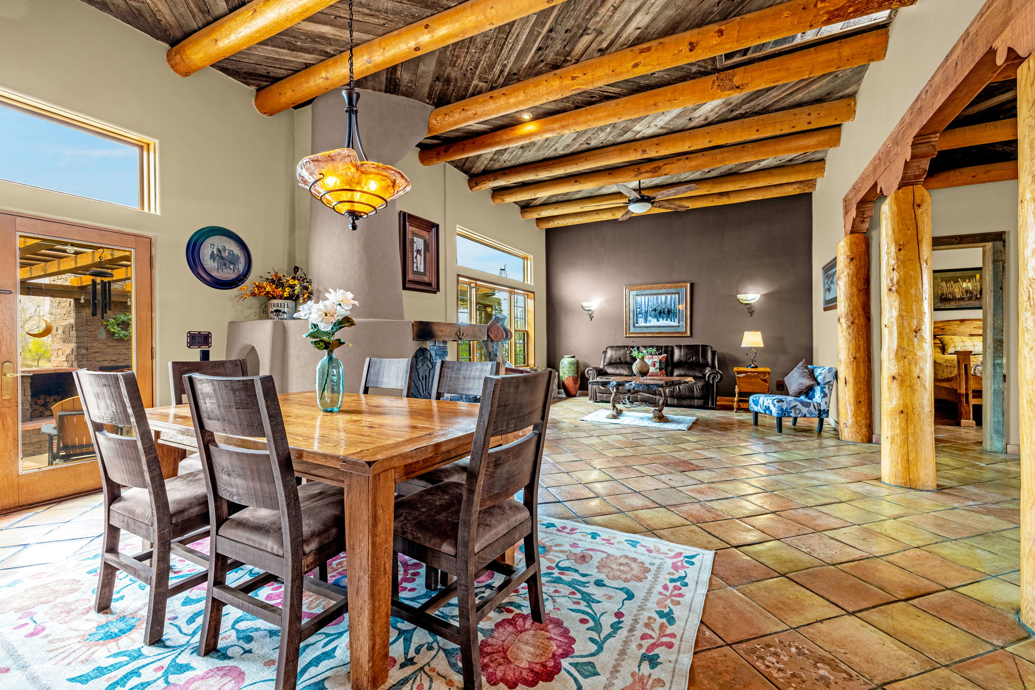 Rare creek side opportunity - 80 close-in acres with almost .75 of a mile of private year round Fountain Creek frontage with towering mature willow and cottonwood trees, wildlife trail corridors throughout the property, a 63x52 4 stall barn, a 90x60 shop and a gorgeous Santa Fe home. Amazing style with exposed wood beams throughout, vigas, antique doors throughout, in-floor radiant heat w/ newer boiler, hand forged gated entry, custom hard maple live edge counters and window seals, stone accent walls, Saltillo tile flooring, expansive high end architectural grade Pella windows. Fully remodeled gourmet kitchen w/ commercial Viking gas range and hood, Subzero refrigerator, antique integrated butcher block, bronze sink, high end cabinetry w/ soft close drawers, beautiful leathered granite counters, pantry, under cabinet lighting. Expansive great room open to the kitchen, Kiva fireplace w/ stone seating, towering ceilings, log beam supports. Main level primary suite w/ Kiva fireplace, walk-out to a large private covered courtyard, 5 piece bath w/ steam shower, jet tub w/ stone surround and a bidet. Phenomenal outdoor entertaining spaces w/ expansive stained patios w/ mature grape vine covered lighted pergolas, wood fireplace, outdoor kitchen, surrounded by lush landscaping, large lilacs, additional paver courtyard, large metal fenced backyard. Large 63x52 barn w/ 4 large stalls w/ runs (and room for additional stalls), rubber mats, metal dividers, tack room, large concrete alleyway, vet room, hay and tractor storage. Multiple fenced pastures w/ lush meadows, outdoor arena, round pen and scenic creek side trails throughout the property for riding. 90x60 insulated and heated workshop/RV garage w/ 16' walls, large vehicle storage area, walk-in cooler, separate workshop and finished room. This property is truly a wildlife haven w/ geese, turkey, fox, Whitetail deer, elk and a variety of birds. Amazing location w/ quick I-25 access and close to amenities.