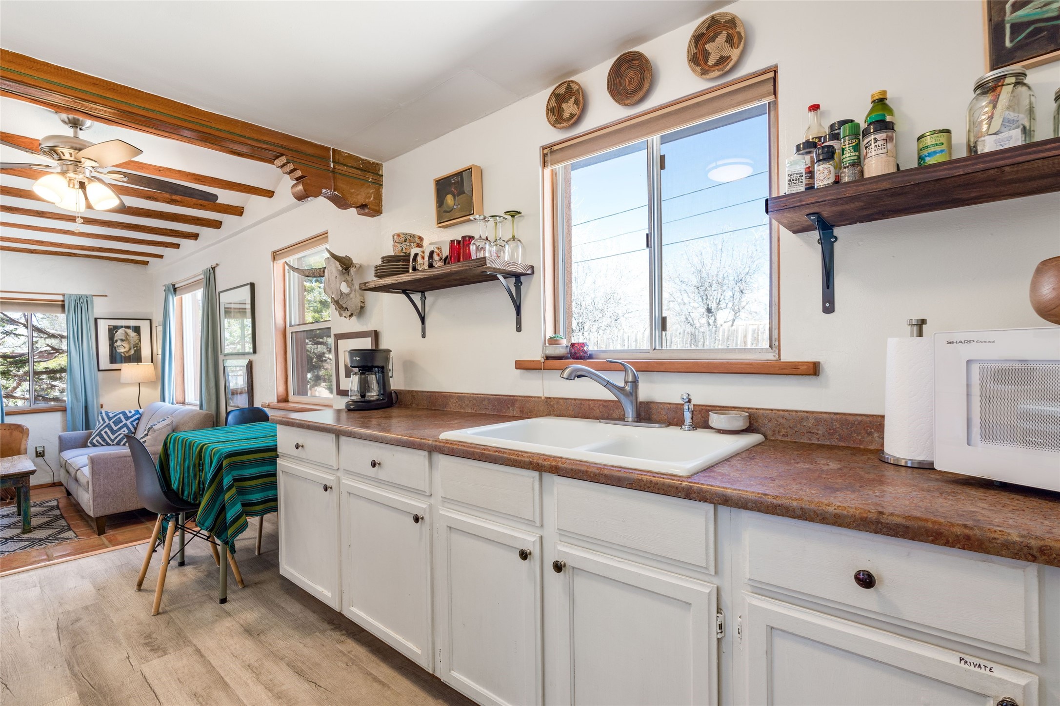 This South Capitol Territorial-style home charms with classic Santa Fe style, generous basement storage and a gorgeously remodeled bath. The rear courtyard, directly off the kitchen, is fully enclosed and fabulously private; the front portal faces a xeriscaped garden shaded by a mature Juniper. Recent upgrades include a new roof, newer furnace and A/C. Set in a wonderfully walkable location 1/2 mile from The Railyard and one mile from The Plaza, this easy lock-and-leave has been a popular rental and much loved second home offering abundant access to the magic of Santa Fe.