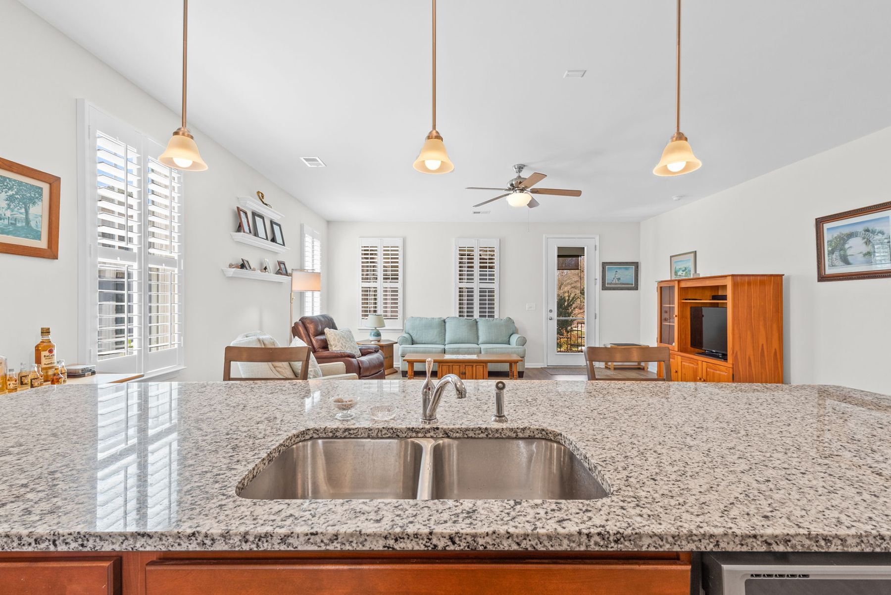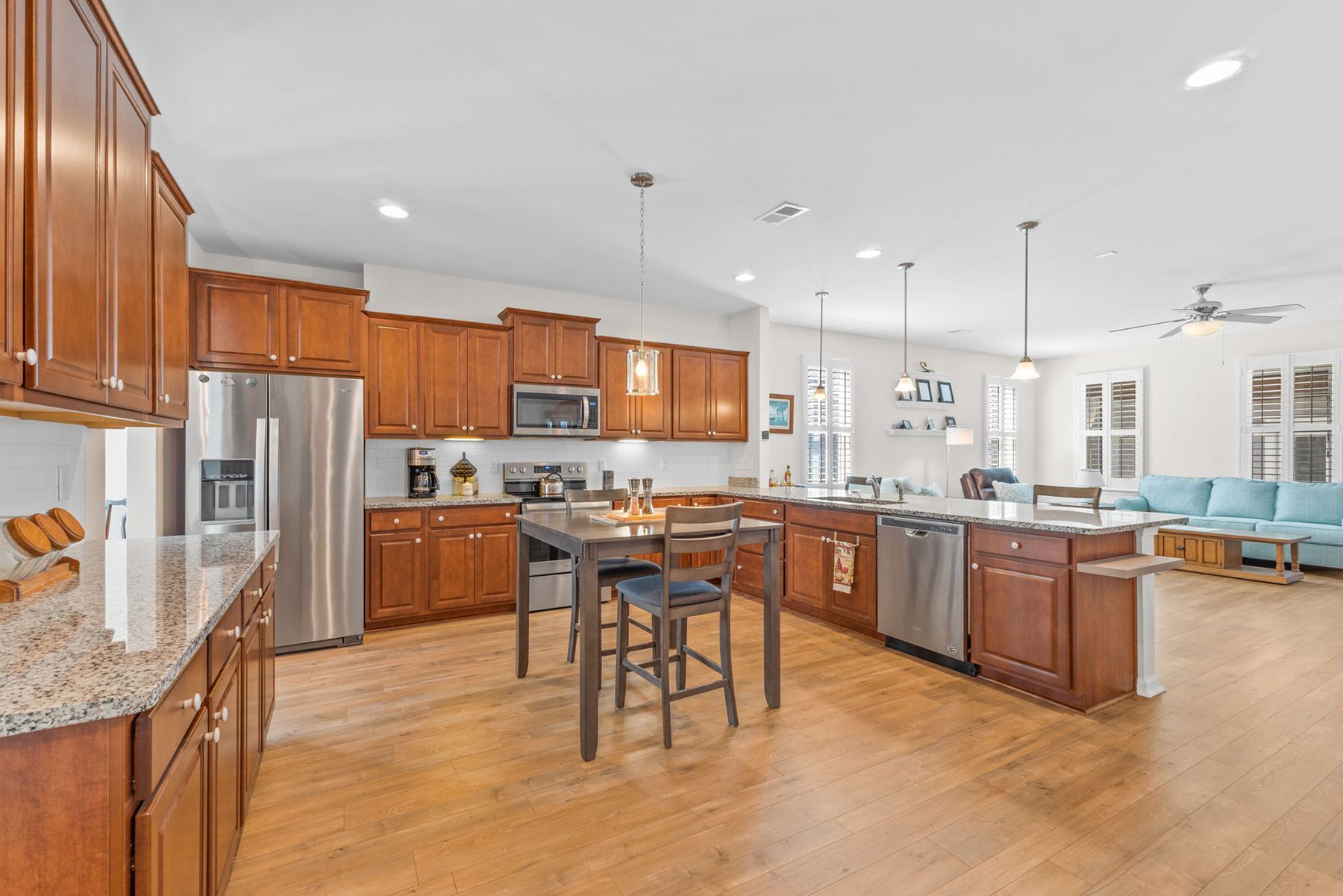 Thoughtful extras include plantation shutters on the first floor, a 220 EV charger in the garage, sun shades on the screened porch and a covered walkway from the detached garage.