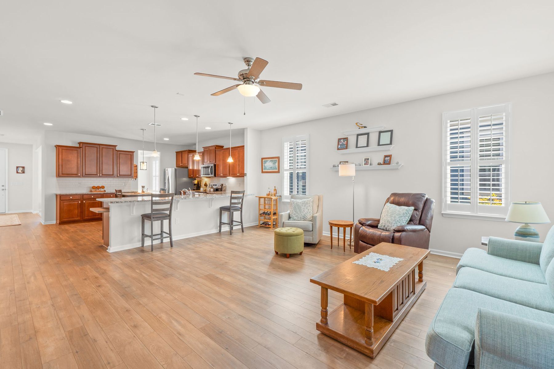 Inside, you'll find three bedrooms, two and a half bathrooms and a flex space that serves as a home office or hobby room. First-floor primary suite, generous living and dining areas, and two bedrooms upstairs that are ideal for guests.