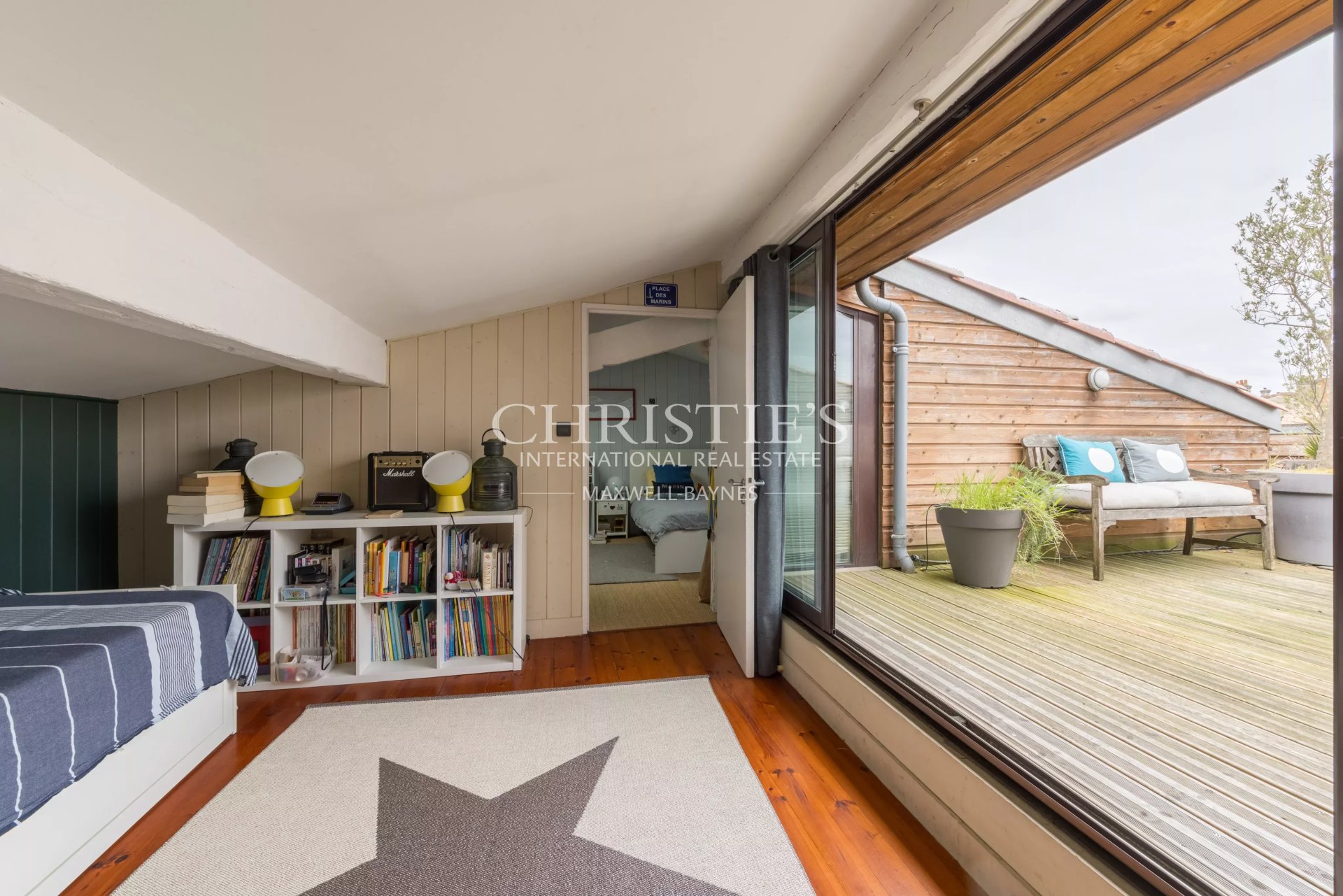 Upstairs, you'll find two air-conditioned bedrooms with sloped ceilings, a bathroom, and a pleasant playroom or relaxation area, all extending onto a magnificent 40 m² west-facing terrace.