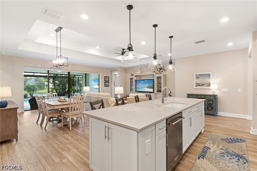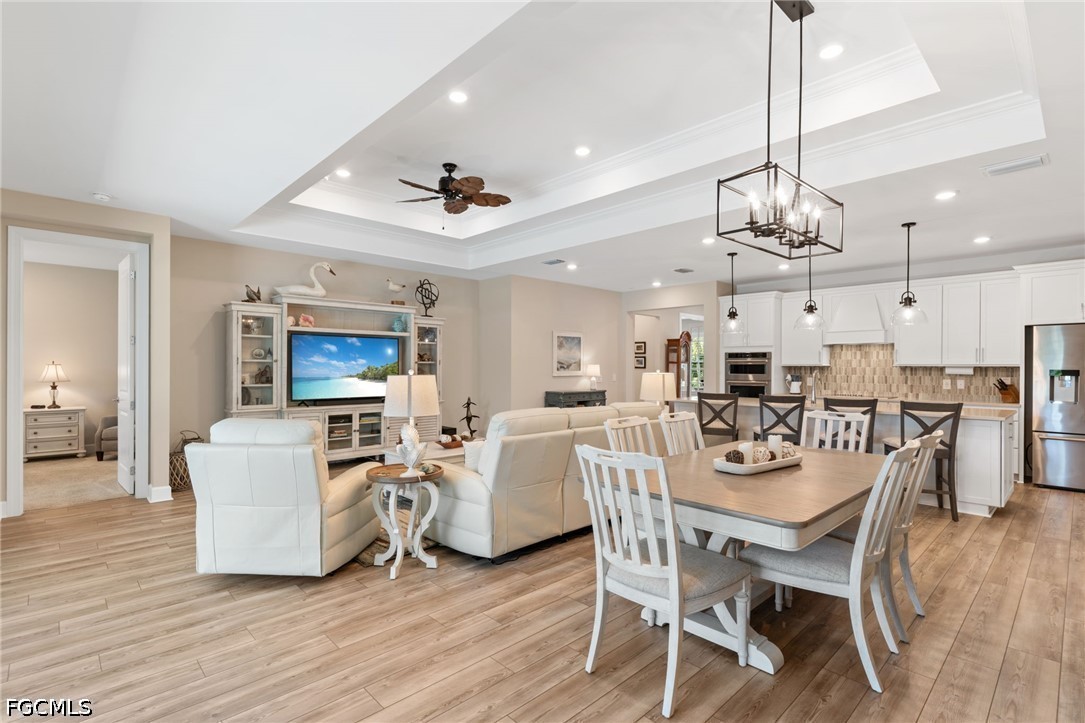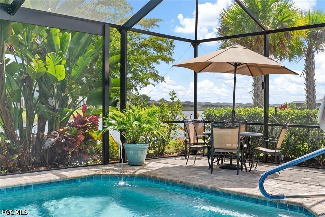 Welcome to your dream home in Hampton Lakes at River Hall! This stunning Single Family Home boasts 3 Bedrooms plus spacious den, 2.5 Bathrooms, and a 3 Car Garage, perfect for a growing family or those who love to entertain. The one-of-a-kind Ashby model features a large open floor plan, plantation shutters, and a built-in bar for hosting unforgettable gatherings. This stunning home boasts upgraded level of cabinets, countertops, large kitchen island and lighting setting it apart from any other home. The LVP flooring in the main living area and 3rd bedroom adds a modern touch, while the double tray ceilings and high baseboards elevate the overall design of the home. The owners have spared no expense in upgrading this home, adding IMPACT WINDOWS, Storm Smart lanai screen, and a mini-split AC in the extended garage. The beautiful large salt water heated pool with fountains, picture window pool cage and landscape lighting create a serene oasis in your backyard. LOW HOA offers amenities such as a resort style pool, pool, fitness center with exercise studio, pickleball, bocce and tennis courts, this gated community truly has it all. Don't miss out on the opportunity to make this your forever home!
