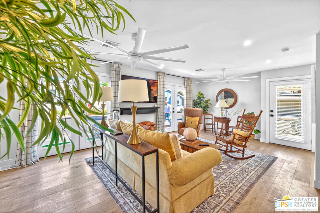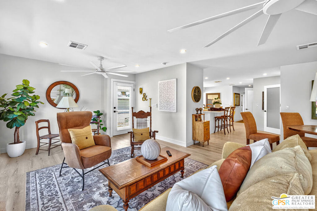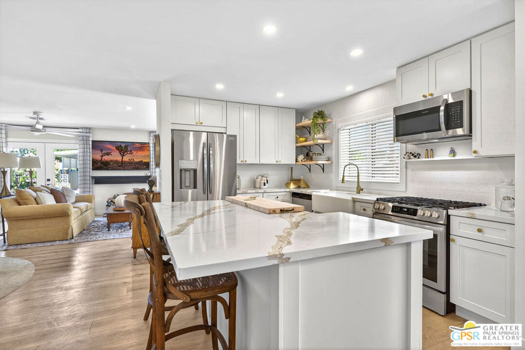 Stunning, fully renovated showpiece, better than new and the definition of modern luxury. This beautifully reimagined 2-bedroom, 2-bath home offers over 1,600 sq. ft. of stylish living space and is sold fully furnished. Located in a highly sought-after 55+ active adult, fee-simple community (you own the land) in South Palm Springs, you're just minutes from downtown, the airport, premier shopping, dining, and the arts. Completely rebuilt down to the studs, this home features a fully drywalled interior with high R-value insulation, all-new plumbing and electrical systems, recessed lighting, and waterproof laminate flooring throughout. Everything inside is brand new. The chef's kitchen is a standout, showcasing high-end cabinetry, stainless steel appliances, quartz counter tops, and a convenient breakfast bar. Adjacent is a spacious dining area with seating for up to 8, plus a dedicated walk-in pantry just steps away. The expansive primary suite impresses with double-door entry and a thoughtfully designed layout, including a sitting area complete with a water line for your morning coffee setup. Additional highlights include a large walk-in closet and a spa-inspired bathroom featuring a walk-in shower, freestanding soaking tub, dual-sink quartz vanity, and designer mirrors. The living room opens beautifully with two French doors leading to a private front patio finished with artificial turf, perfect for enjoying mountain views and al fresco dining during the cooler desert months. A generously sized guest bedroom offers ample closet space, while the guest bath includes a walk-in shower and single-sink vanity. The home also features a laundry area with a newer front-load washer and dryer. Exterior upgrades include energy-efficient double-pane windows, designer doors. There's a 2 or 3 car tandem carport, and a storage shed completing this move-in-ready gem. Located in the gated community of El Dorado Palms Estates, residents enjoy exceptional amenities including a clubhouse with on-site management, auditorium, card and billiards rooms, exercise room, and a main pool and spa. Additional features include two tennis/pickleball courts, a satellite pool with ADA lift, and close proximity to two 18-hole Arnold Palmer-designed golf courses. Palm Springs residents also benefit from reduced golf rates with a city golf card. Whether you're seeking a seasonal retreat or full-time residence, this home delivers the ultimate desert lifestyle. Everything you see is included. Why wait? Start living the good life today. Schedule your private showing and make your offer.