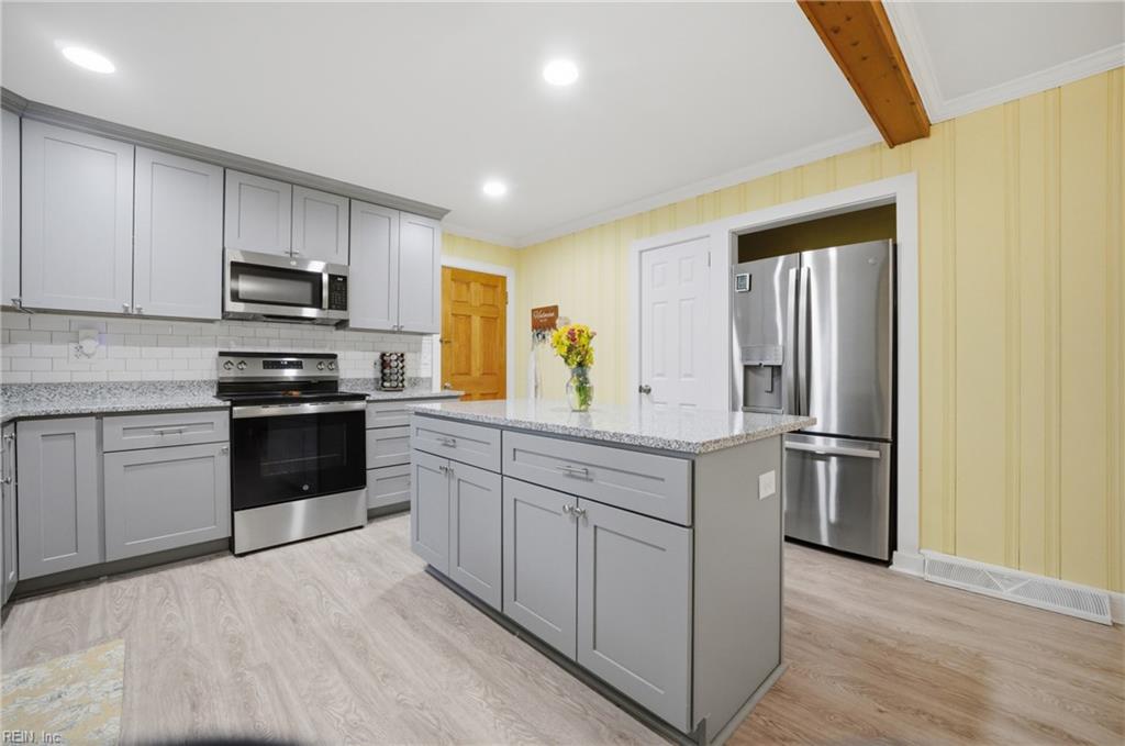 Beautifully updated all-brick ranch in the established Siesta Gardens neighborhood! The fully renovated kitchen (2025) features soft-close cabinets and drawers, granite countertops, modern lighting, a spacious island, and a walk-in pantry, plus stove, microwave, and dishwasher. Stylish LVP flooring flows through the kitchen, dining room, foyer, and hallway (2026). The hall bath showcases stunning new tile(2022). Enjoy two wood-burning fireplaces, one in the dining room and one in the family room. Relax or entertain on the large deck overlooking a generous backyard. New Roof (2024). Centrally located near Coast Guard Base Portsmouth, Norfolk Naval Shipyard, International Terminals, and just minutes to Route 164 with easy access to 664 and HII Newport News Shipbuilding.