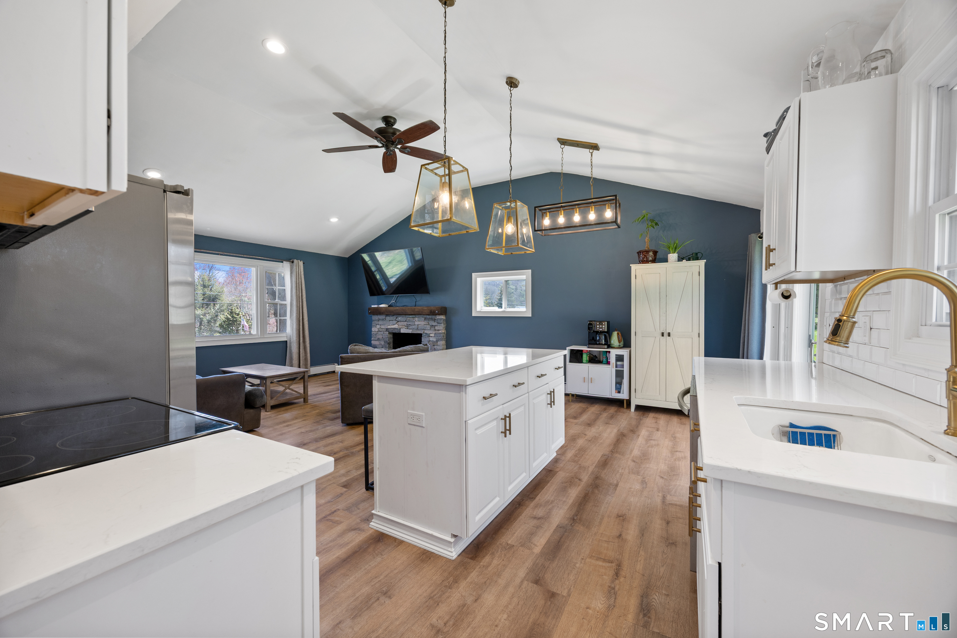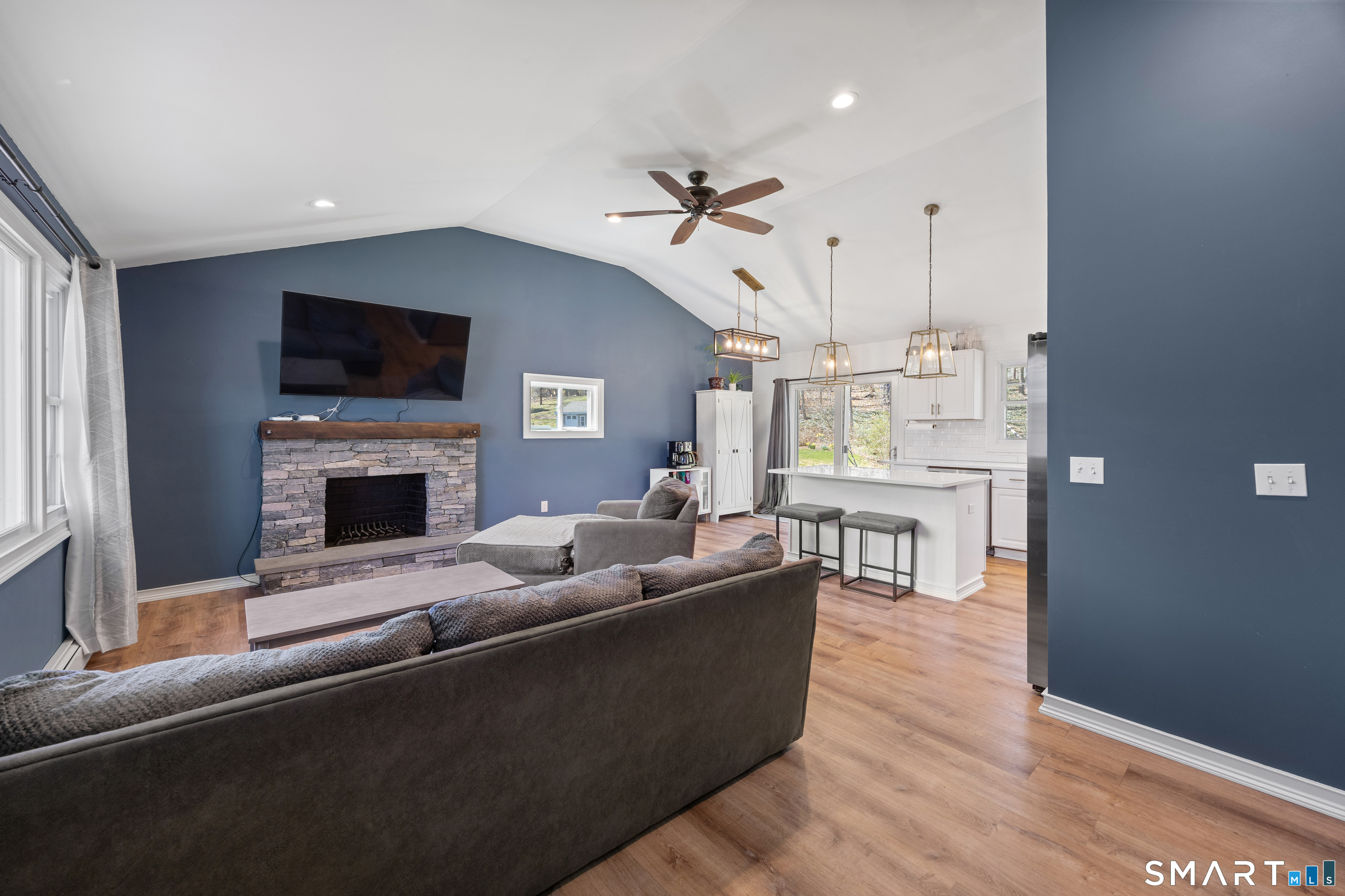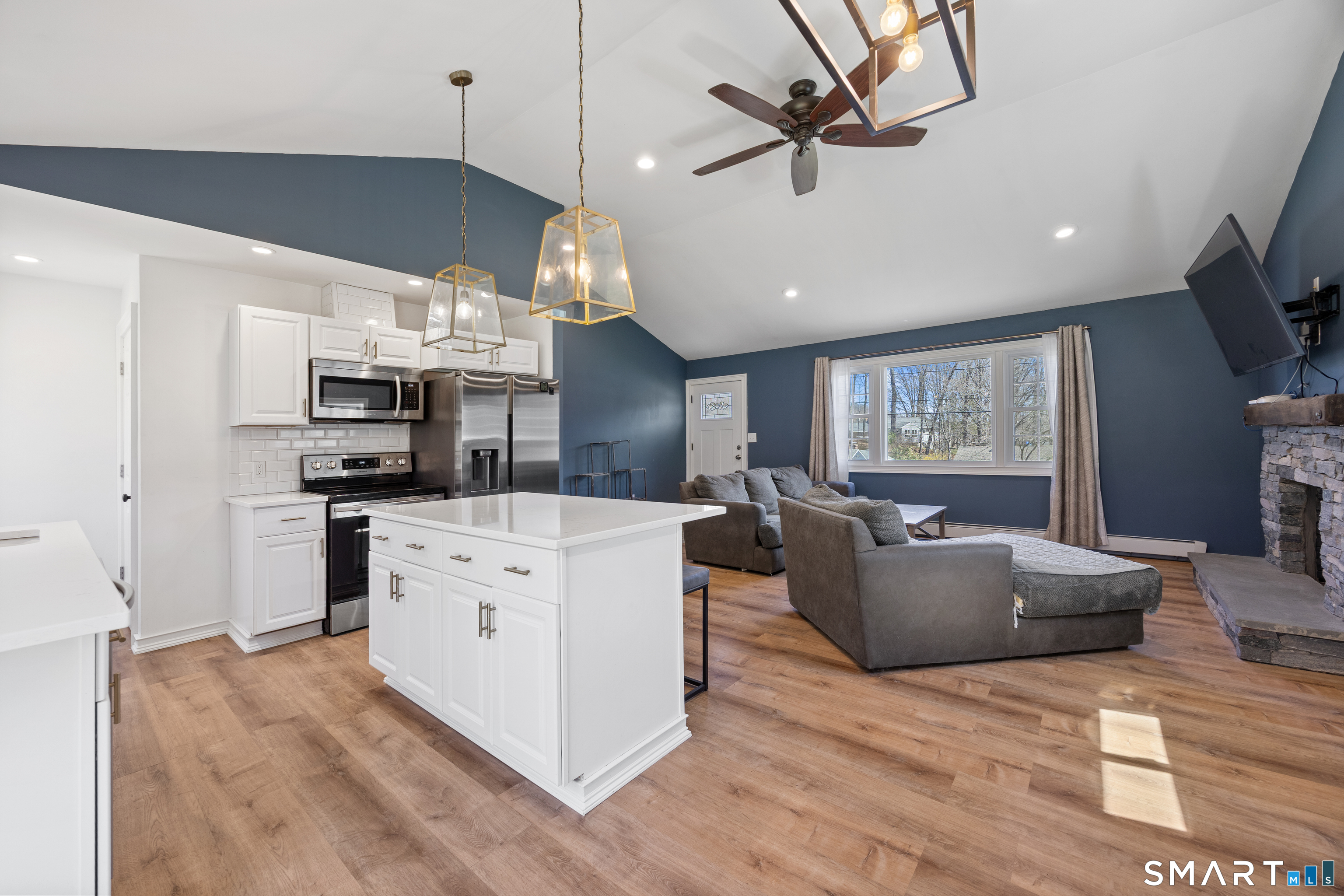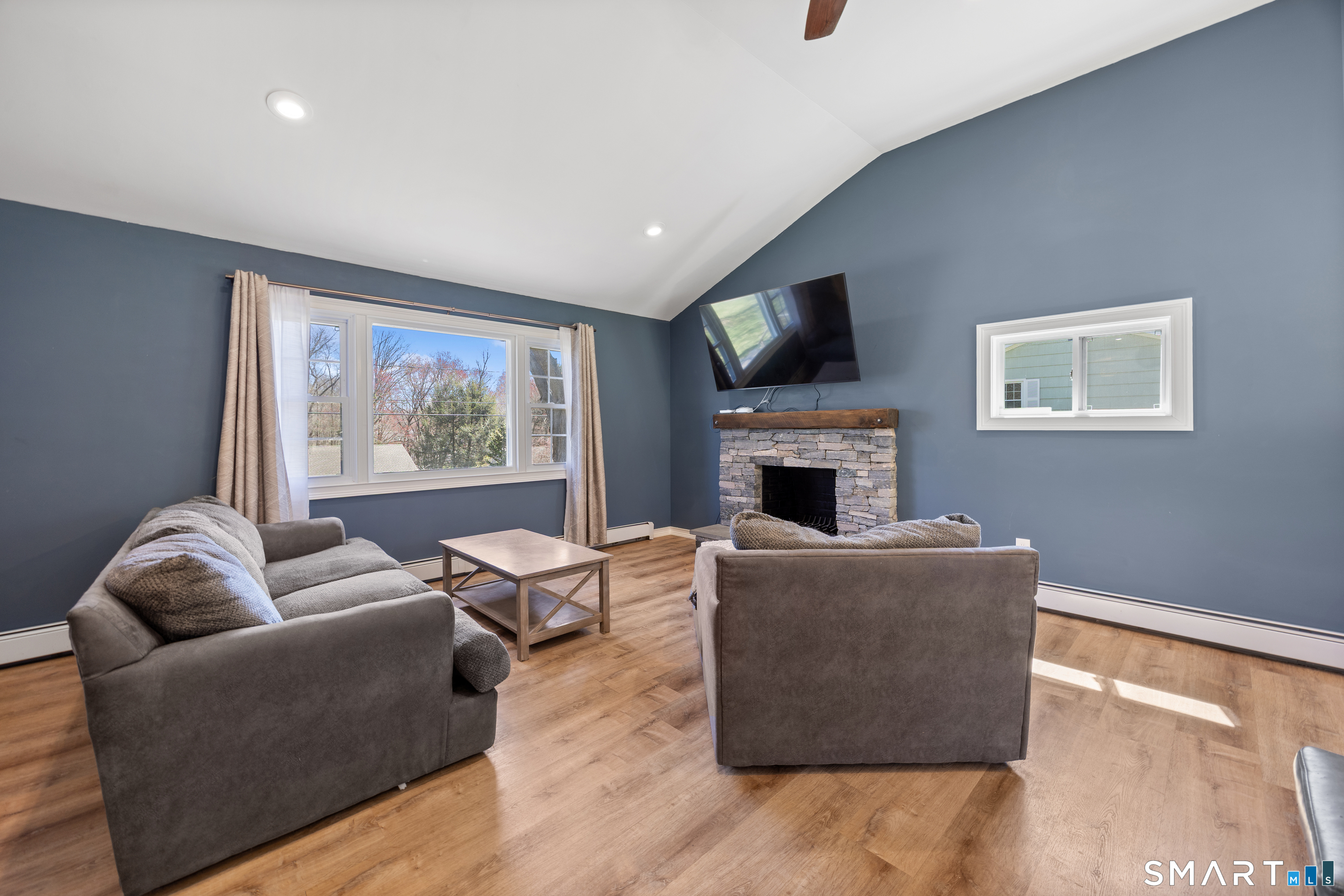 Beautifully maintained and fully updated 3-bedroom, 2 full bath ranch located in Cheshire. This move-in ready home features laminate flooring throughout the main level, with cathedral ceilings and an open-concept layout that allows for abundance of natural light. The eat-in kitchen is equipped with quartz countertops, stainless steel appliances, and a center island that provides additional prep space and seating-ideal for entertaining. A slider off the kitchen leads to a private, spacious backyard. The inviting family room showcases a cozy stone fireplace, creating a warm and welcoming atmosphere. The primary bedroom includes a private full bath, while two additional bedrooms offer flexibility, with one ideal for a nursery or home office. Laundry is conveniently located on the main level. The lower level offers great potential for future finishing to suit your needs .It is partially sheet rocked and heated. Additional updates include a new roof (2024), most windows have been replaced, with the exception of the living room picture window. Come see and make this your home. City water, City sewer.