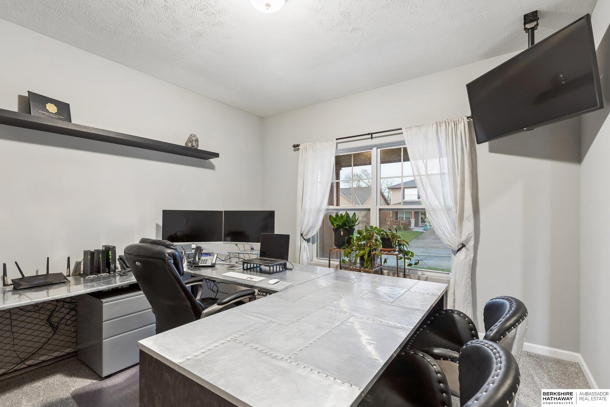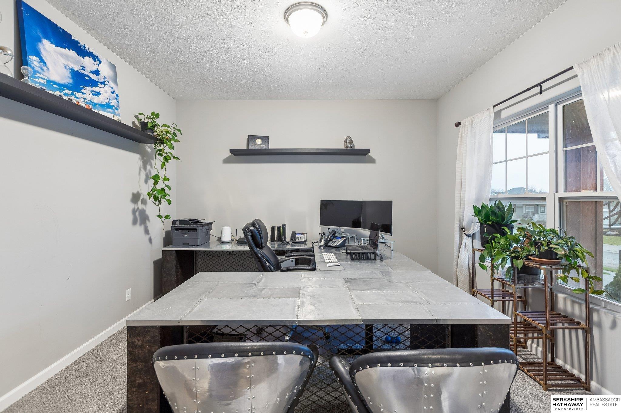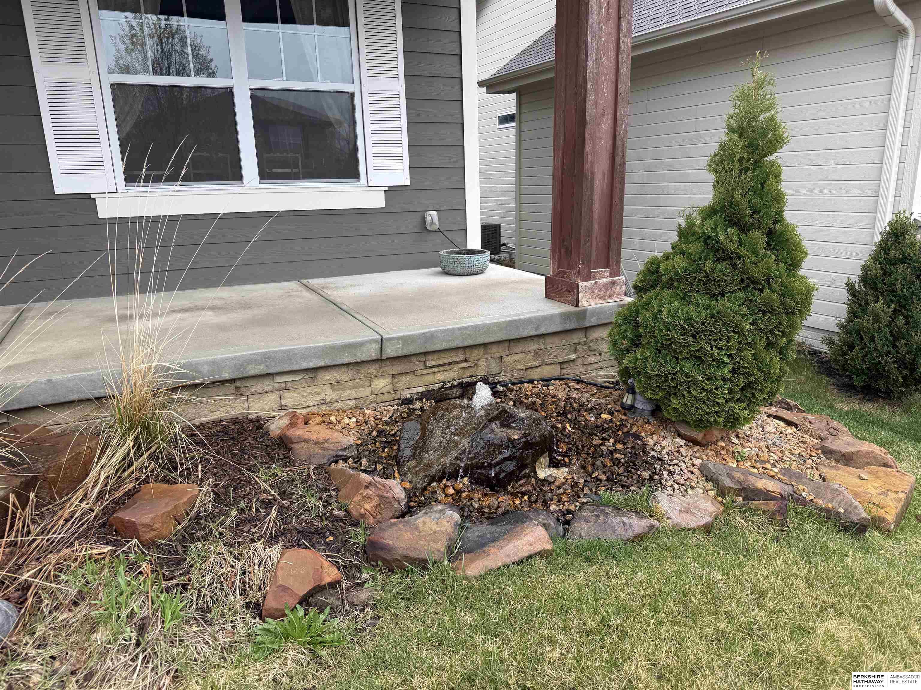Well-maintained, move-in ready 2-story in the Gretna School District with stunning curb appeal and a water feature! New carpet throughout! The main level has an open floor plan with seamless flow between the kitchen and living area. Kitchen features a large island, brushed nickel appliances, walk-in pantry, and ample cabinet and counter space. Enjoy the cozy living room with a fireplace, plus a convenient half bath, mudroom, and dedicated office. Upstairs, relax in the 6-person sauna and find three large bedrooms, including a spacious primary suite with sitting area, full en-suite bath with jetted tub, separate shower, dual vanities, and a huge walk-in closet. The unfinished basement provides over 1,000 sq ft with bathroom rough-ins - ideal for future expansion. Outside, enjoy a fully fenced backyard oasis with a covered deck, privacy wall, waterfall feature, and peaceful views backing to green space and a pond. 3-car garage with oversized third stall, tandem space, and transom windows.