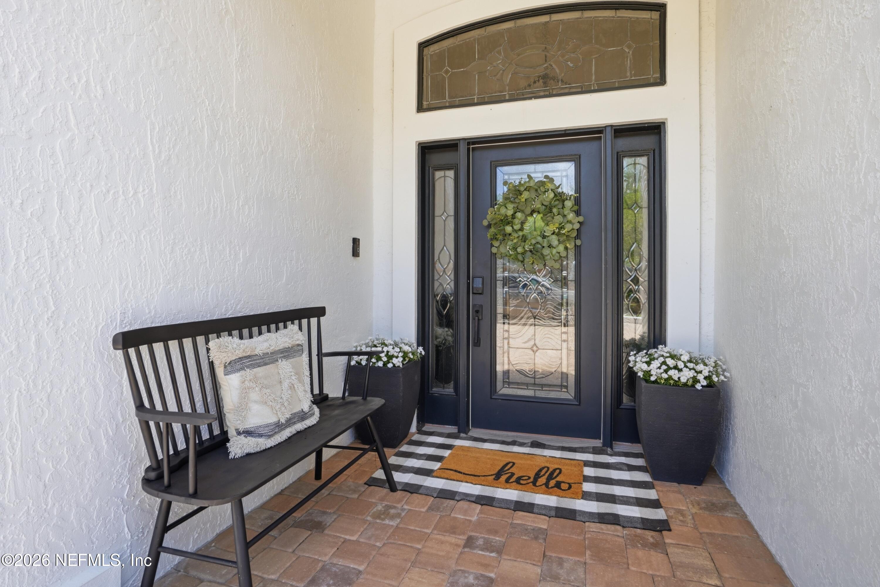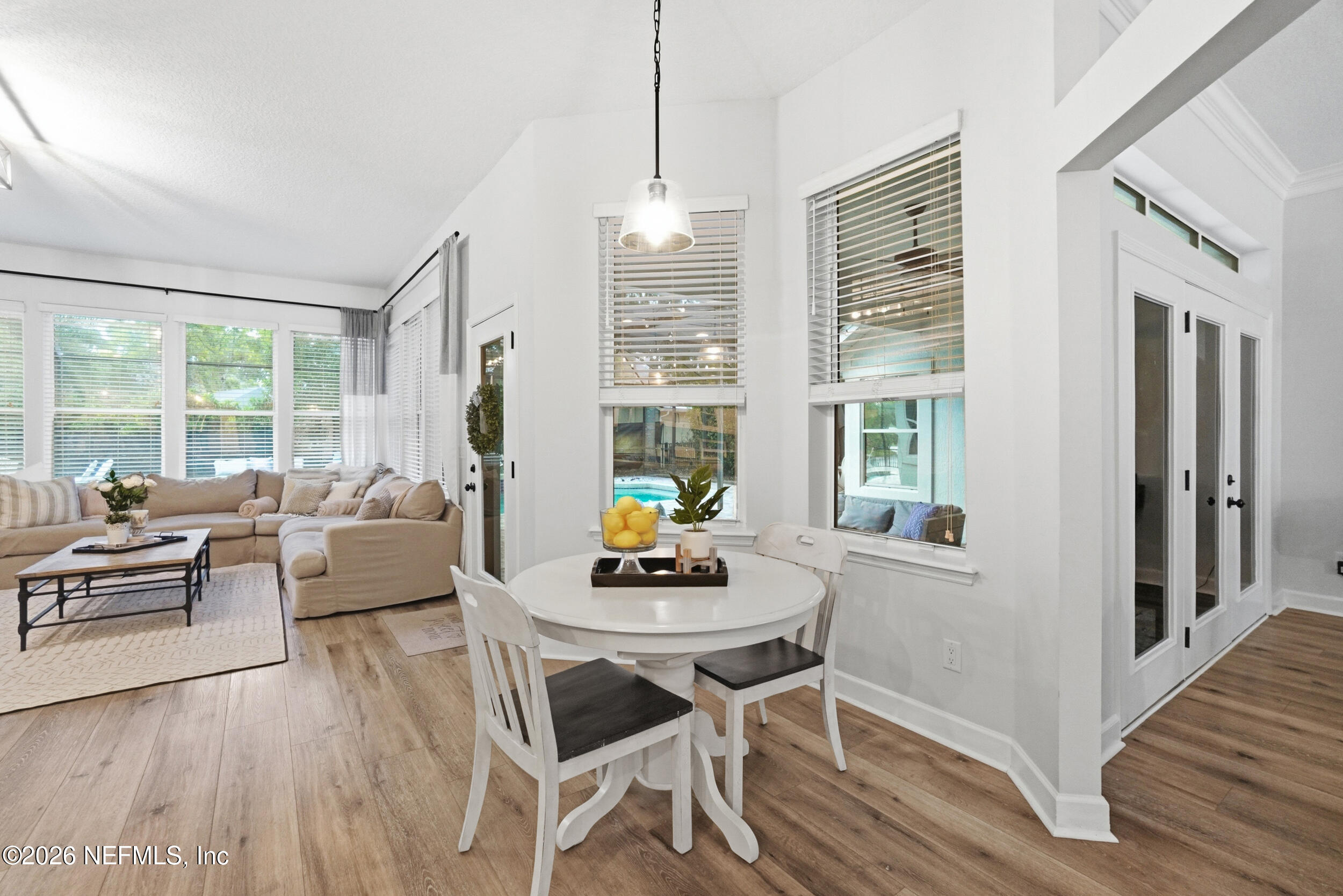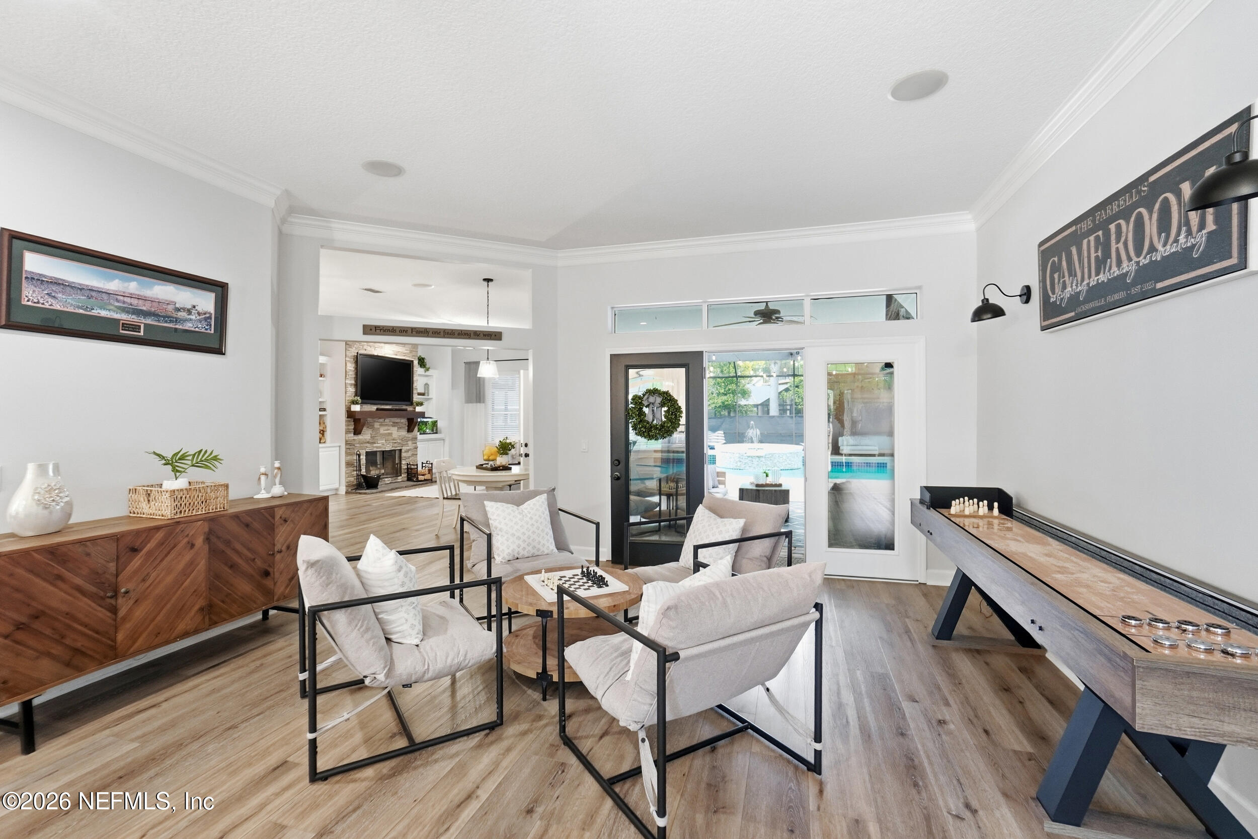 Located in Jacksonville Golf & Country Club, one of the area's premier gated communities, this beautiful 5 bedroom / 4.5 bathroom pool home offers a wonderful layout. Four bedrooms are located on the main level, including the primary suite and a dedicated office with custom built-ins. Wide plank flooring runs throughout (no carpet), and a fireplace anchors the main living area. The kitchen features updated stainless appliances, beautiful countertops, and opens easily to the living and dining spaces. Interior and exterior paint colors are fresh and neutral. A large upstairs bonus room with ensuite bath serves as the 5th bedroom - ideal for guests or a private retreat. Step outside to a screened pool and patio, along with a private backyard featuring lovely lake views. A circular paver driveway offers extra parking and great curb appeal. Enjoy this special home and the vibrant community, including pickleball, basketball, sports fields, and playground. Country Club Membership is optional.