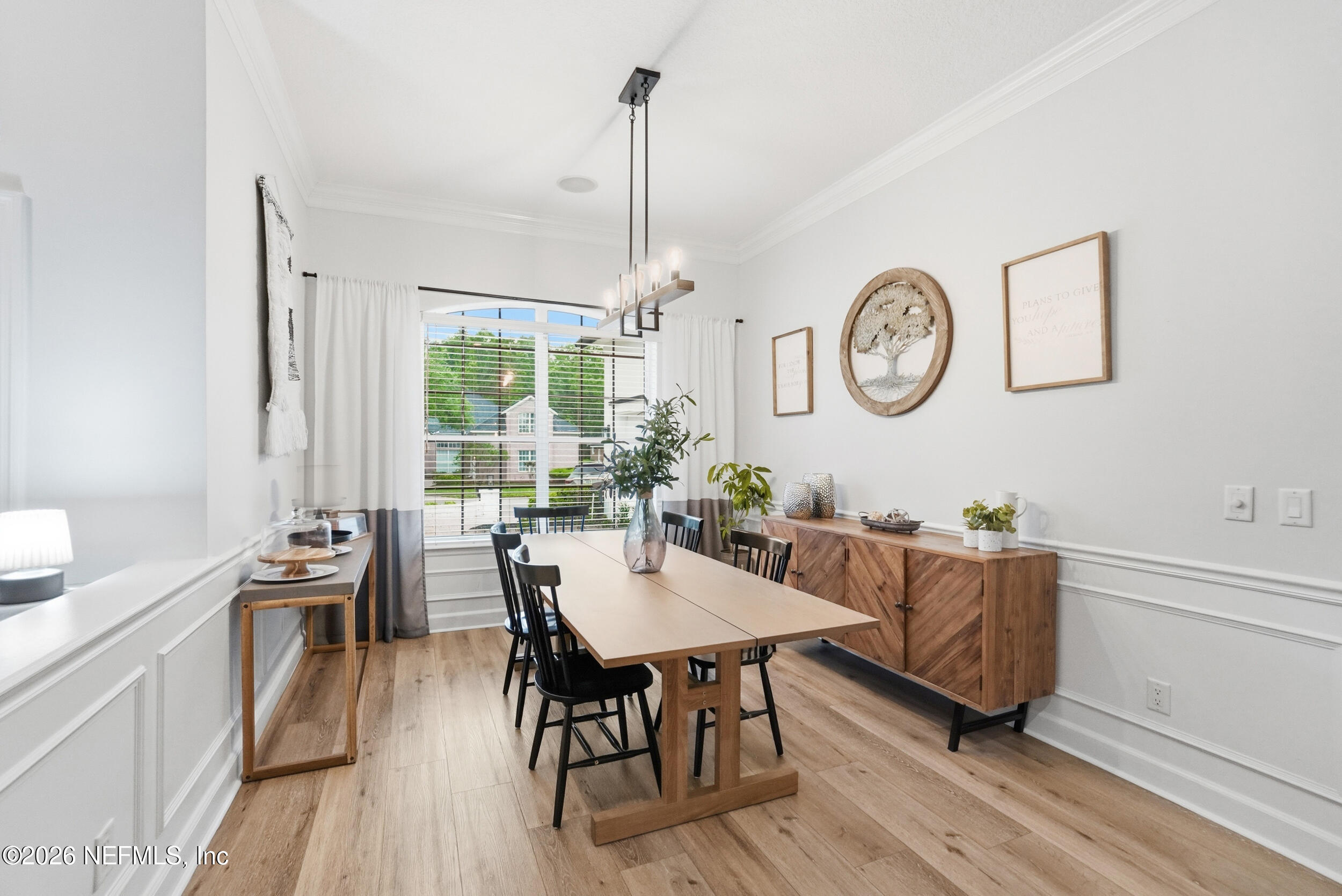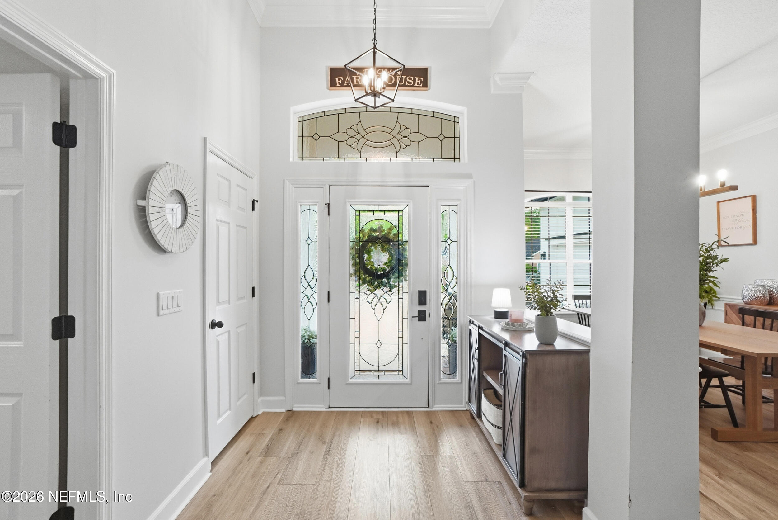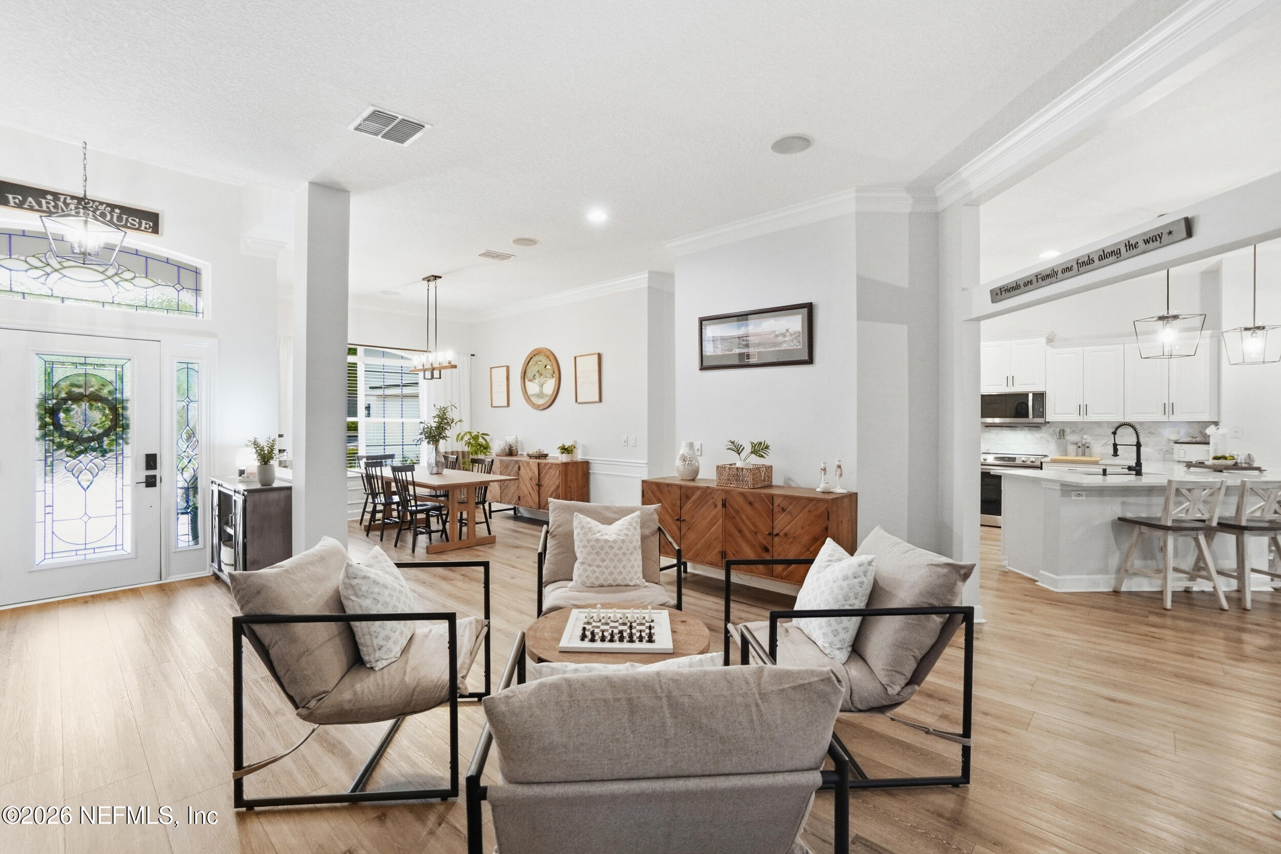 Located in Jacksonville Golf & Country Club, one of the area's premier gated communities, this beautiful 5 bedroom / 4.5 bathroom pool home offers a wonderful layout. Four bedrooms are located on the main level, including the primary suite and a dedicated office with custom built-ins. Wide plank flooring runs throughout (no carpet), and a fireplace anchors the main living area. The kitchen features updated stainless appliances, beautiful countertops, and opens easily to the living and dining spaces. Interior and exterior paint colors are fresh and neutral. A large upstairs bonus room with ensuite bath serves as the 5th bedroom - ideal for guests or a private retreat. Step outside to a screened pool and patio, along with a private backyard featuring lovely lake views. A circular paver driveway offers extra parking and great curb appeal. Enjoy this special home and the vibrant community, including pickleball, basketball, sports fields, and playground. Country Club Membership is optional.