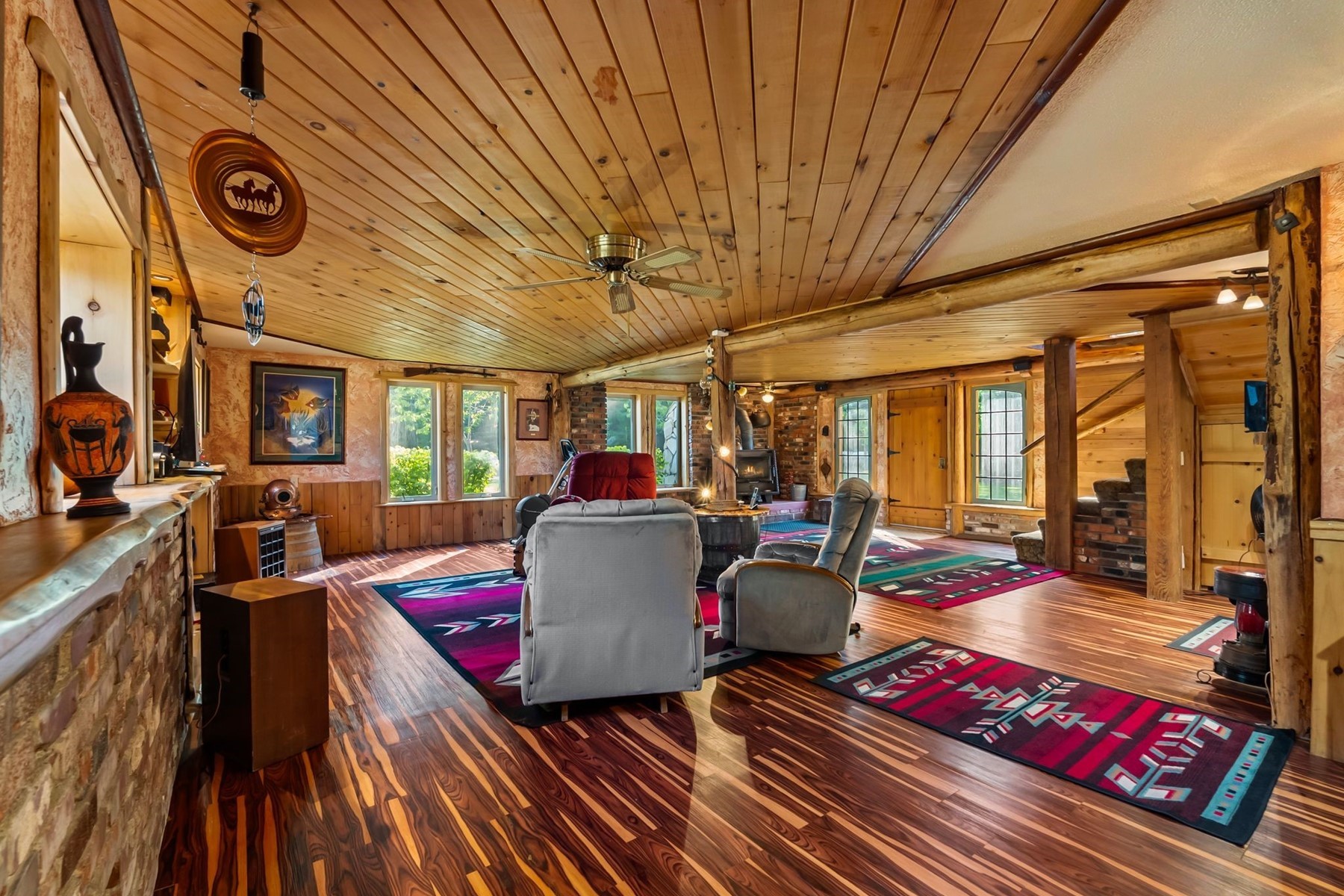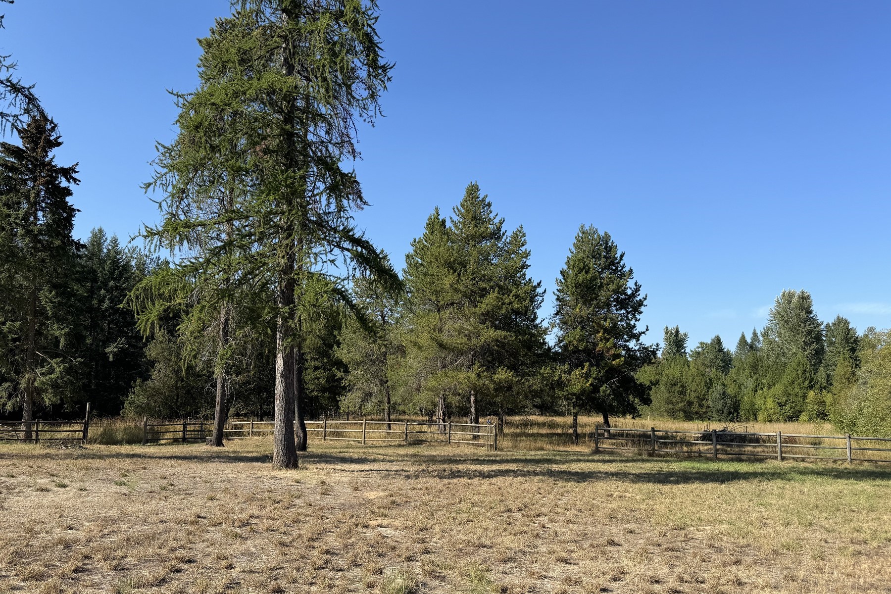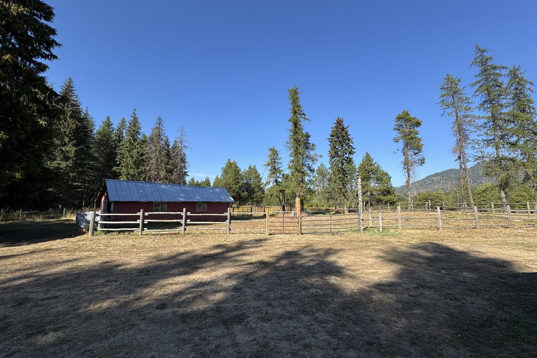 us timber-frame 2 story cowboy ranch-style home spans 3,008 square feet and is situated on 31.5 beautiful acres of land featuring a mix of Cedar, Tamarack, Spruce, Lodge Pole Pine, Birch, etc., and approximately 12 acres of open pasture and a pond. The home showcases custom woodwork, tongue-and-groove ceiling, and live-edge wood framing around the windows, complemented by brick accents, wood wainscoting, a vintage cook stove, a clawfoot tub, and hand-troweled plaster walls. These elements create an artistic, rustic cabin aesthetic. The residence includes three bedrooms and three bathrooms, along with a large great room, dining room, kitchen, and a sizable mudroom entry, and a second upstairs living area, or large office space. The property is adorned with various fruit trees--pears, apples, plums, and cherries. It is fenced for horses and has a 24 x 24 fenced dog kennel. Outbuildings on the property consist of two pole barns, one of which is large enough to accommodate a tall RV, or hay storage, along with a smaller barn and an attached spacious workshop.Additionally, there is a large breezeway designed for outdoor covered living space and extra covered parking. The property also features two wells. 2 separate parcels allow you to build additional homes if desired.