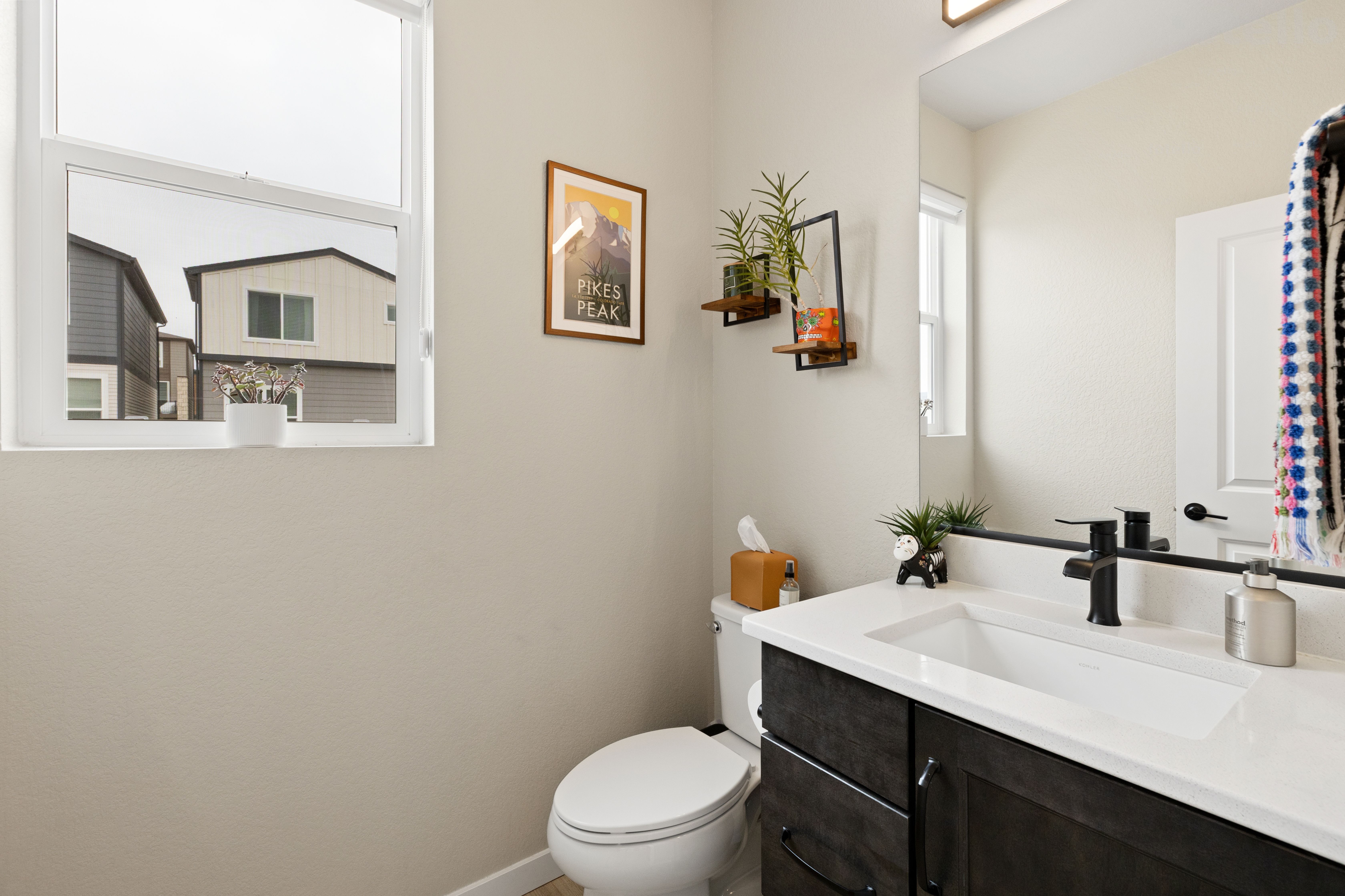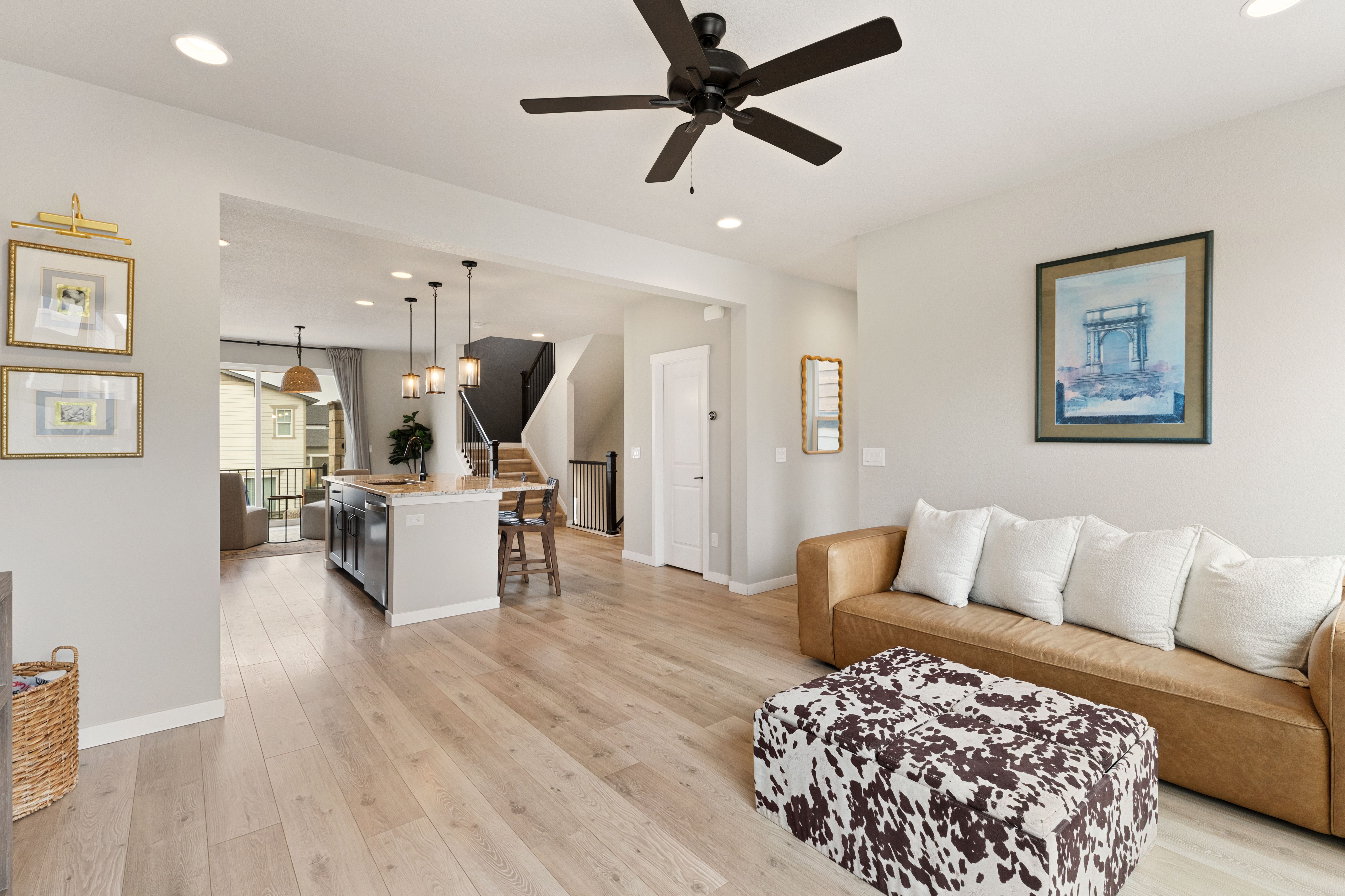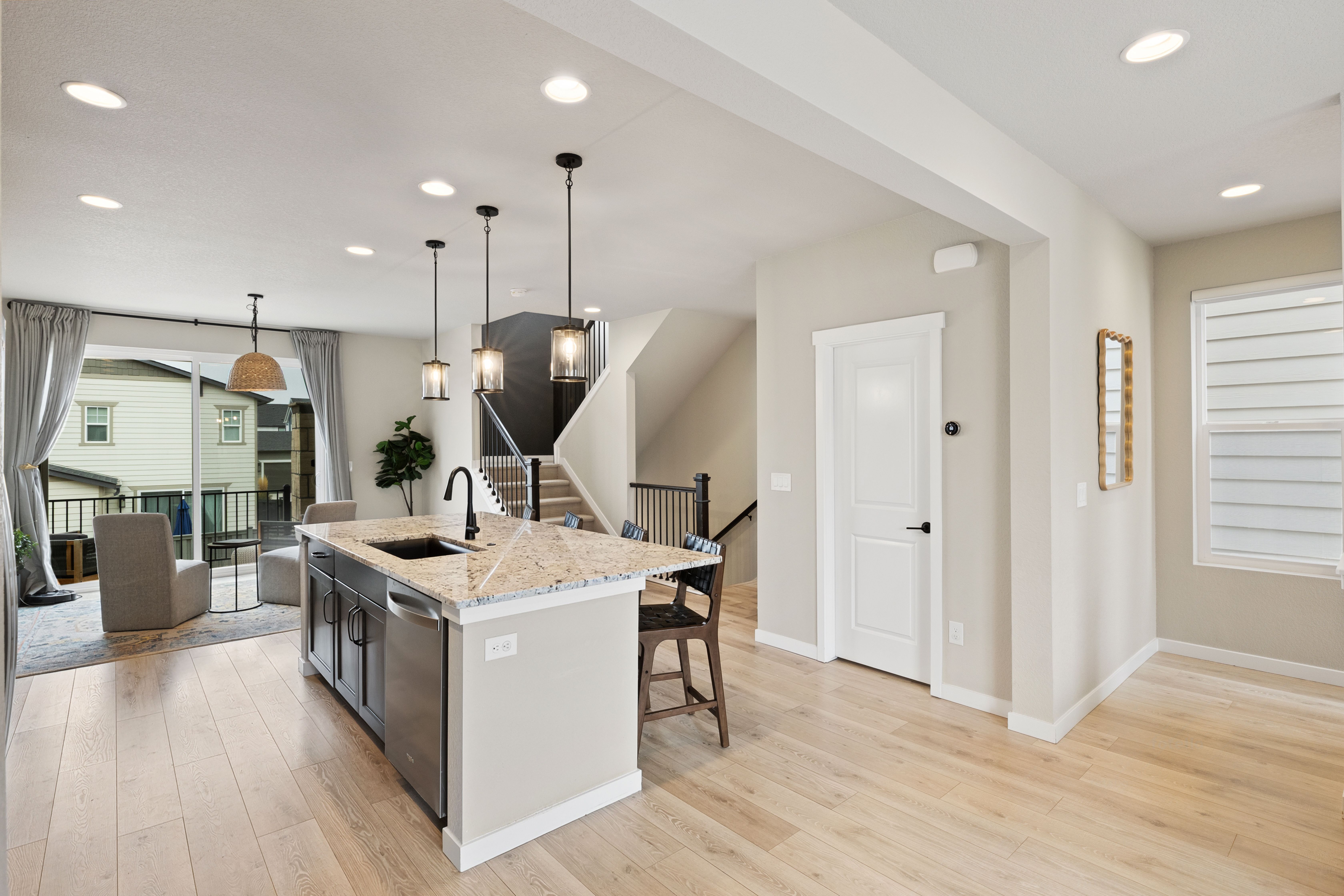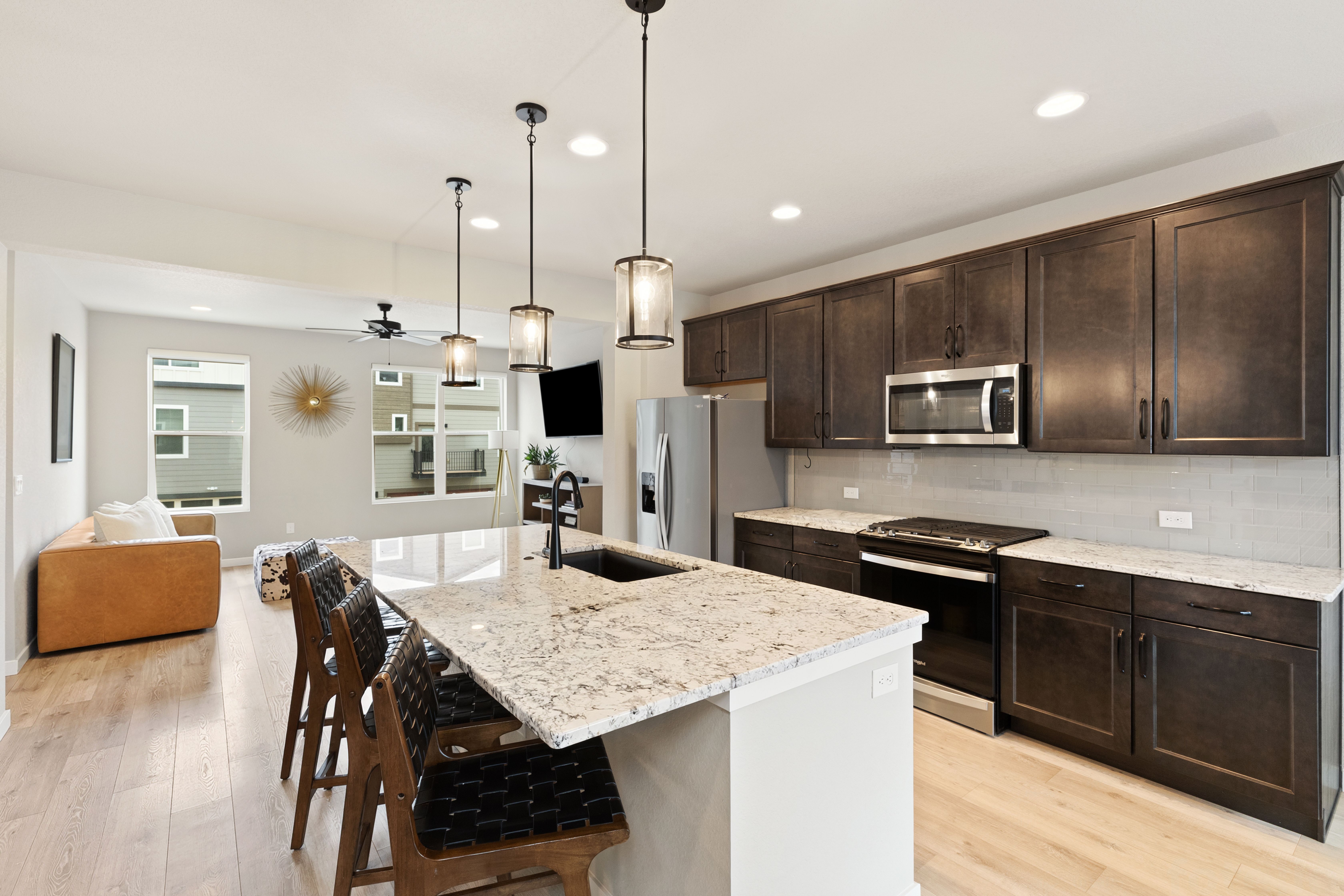Discover effortless living in this stunning, like-new three-story home, thoughtfully designed with both style and functionality in mind. Featuring 3 bedrooms, 3 bathrooms, and a spacious 2-car garage, this residence offers the perfect blend of modern elegance and everyday comfort. The heart of the home is the beautifully appointed kitchen, showcasing designer cabinetry with crown molding, sleek granite countertops, stainless steel appliances including a gas range and refrigerator, walk in pantry and an expansive center island accented by contemporary pendant lighting. The open-concept layout creates a seamless flow into the dining and family rooms, ideal for both entertaining and relaxed daily living. A versatile pocket office on the main level provides the perfect space for a home command center, remote work, or study. Upstairs, retreat to the luxurious primary suite featuring a spa-inspired private bath with a walk-in shower, frameless glass enclosure, and sophisticated tile finishes. Two additional bedrooms, a full bath, and a conveniently located laundry area complete the upper level. The lower level offers an additional living space, perfect for a media room, home office, or flex space to suit your lifestyle. Thoughtful upgrades continue throughout the home, including a fully finished, insulated, and painted garage, central air conditioning, custom window blinds, and striking black hardware and plumbing fixtures. Step outside to the deck just off the dining area and take in the breathtaking mountain views, an ideal setting for morning coffee or evening gatherings. Every detail has been carefully curated in this exceptional home. Move-in ready and truly turnkey, this is a rare opportunity to own a home that perfectly balances style, comfort, and convenience. Welcome home.