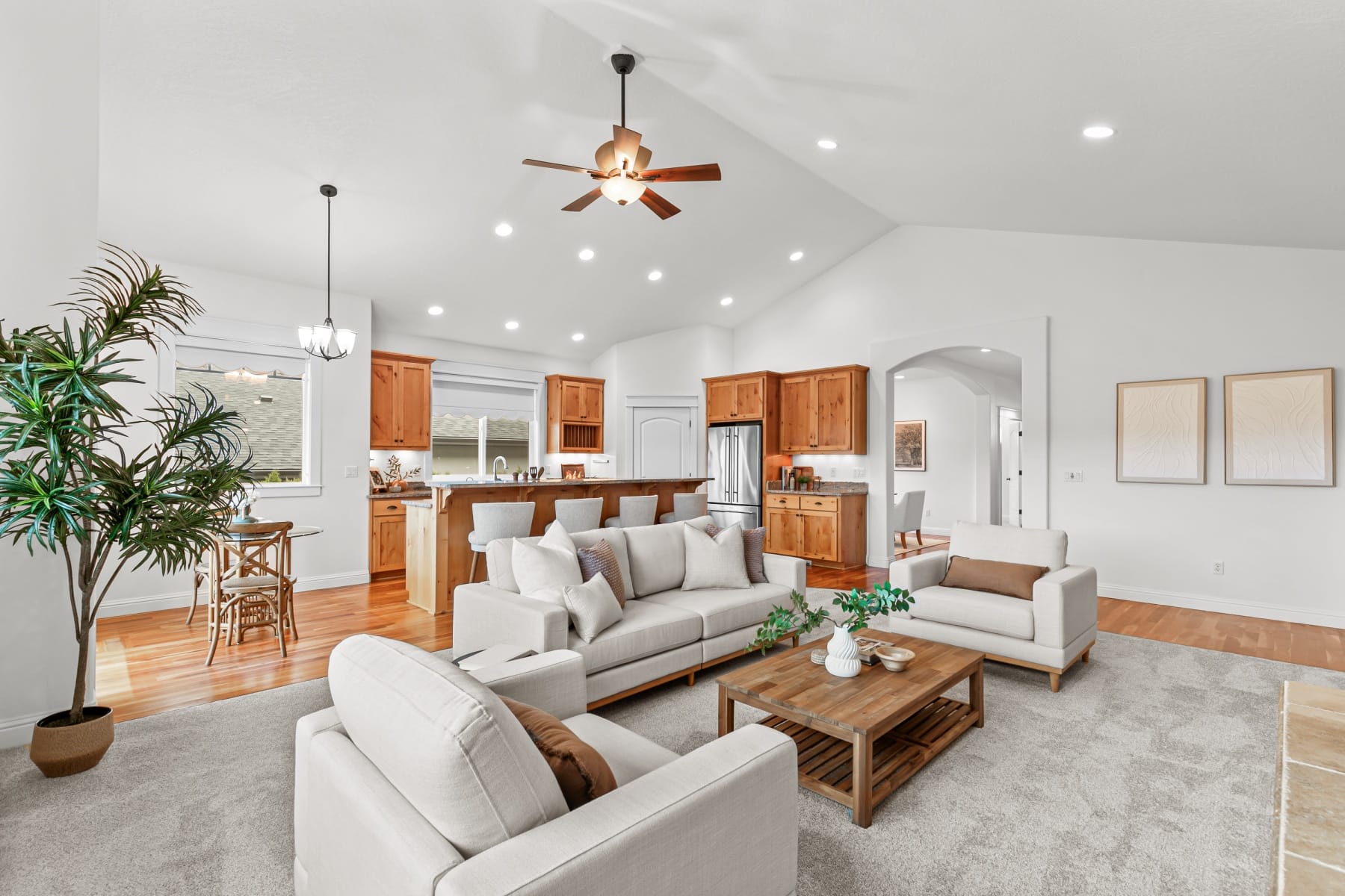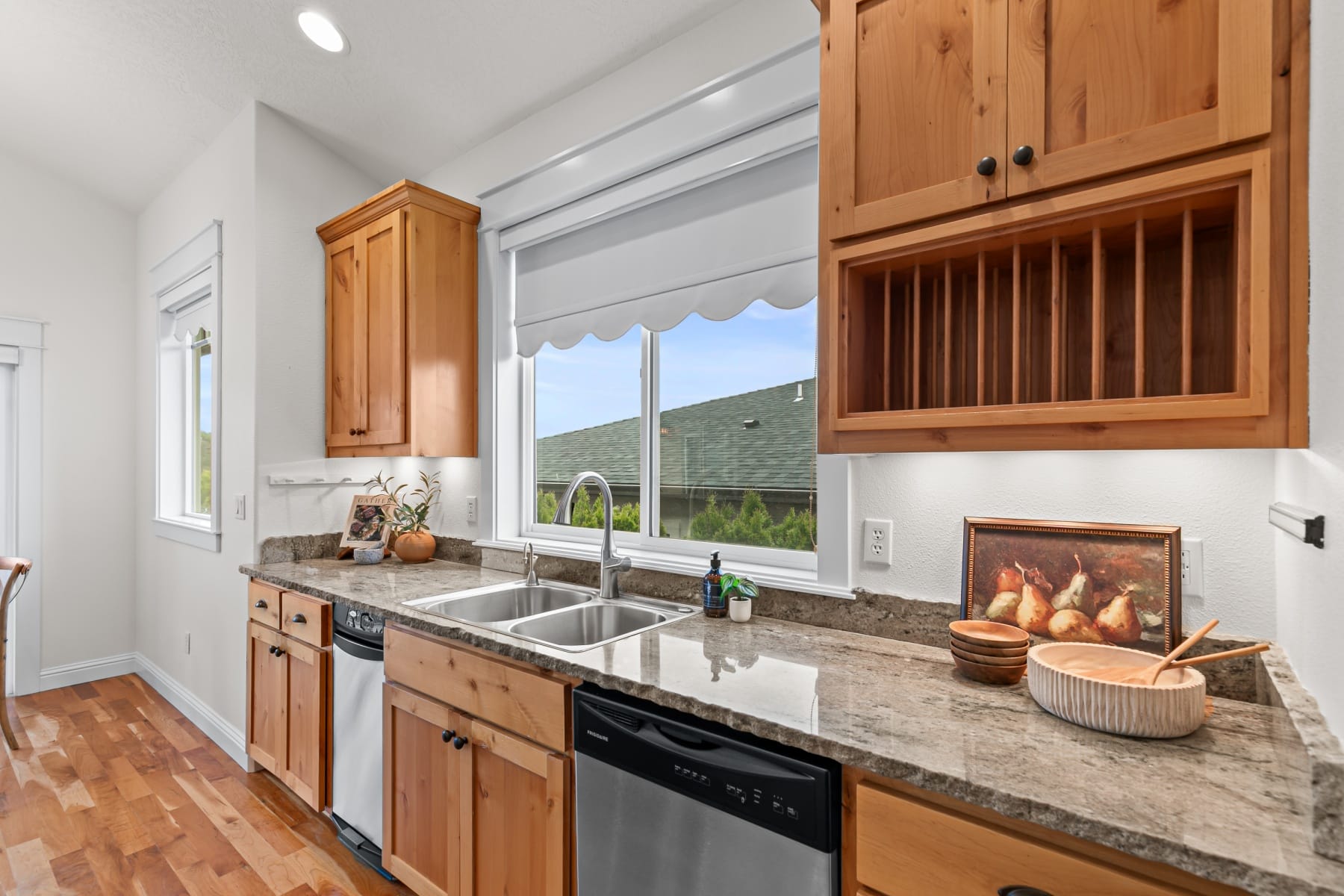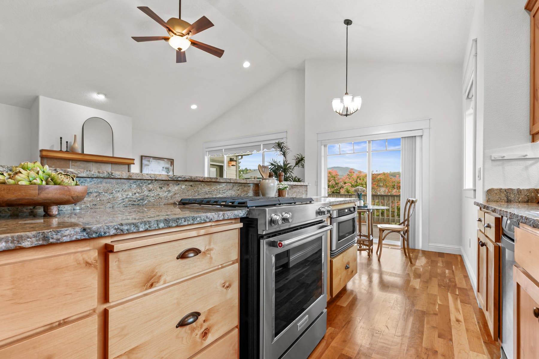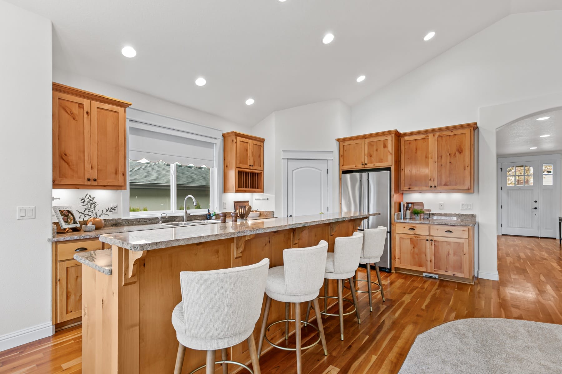 Vaulted ceilings, fresh updates, and sweeping views--this East Medford home truly checks all the boxes. All new interior paint and carpeting provide a clean, updated backdrop, while the expansive layout and soaring ceilings fill the home with natural light. The open kitchen is anchored by chiseled edge granite countertops and warm cabinetry, complemented by rich cherry wood flooring throughout the main living areas. The spacious primary suite is complete with a gas fireplace, dual closets, travertine tile shower, double vanity, and soaking tub. Two additional bedrooms plus a dedicated home office provide flexibility for a variety of lifestyles. Step outside to enjoy expansive valley views from the large deck, which overlooks a backyard filled with fruit trees. Designed for comfort, the home features dual water heaters, central vacuum, and a 3-car garage. Out front, a stamped concrete driveway with a distinctive water feature creates a memorable first impression.