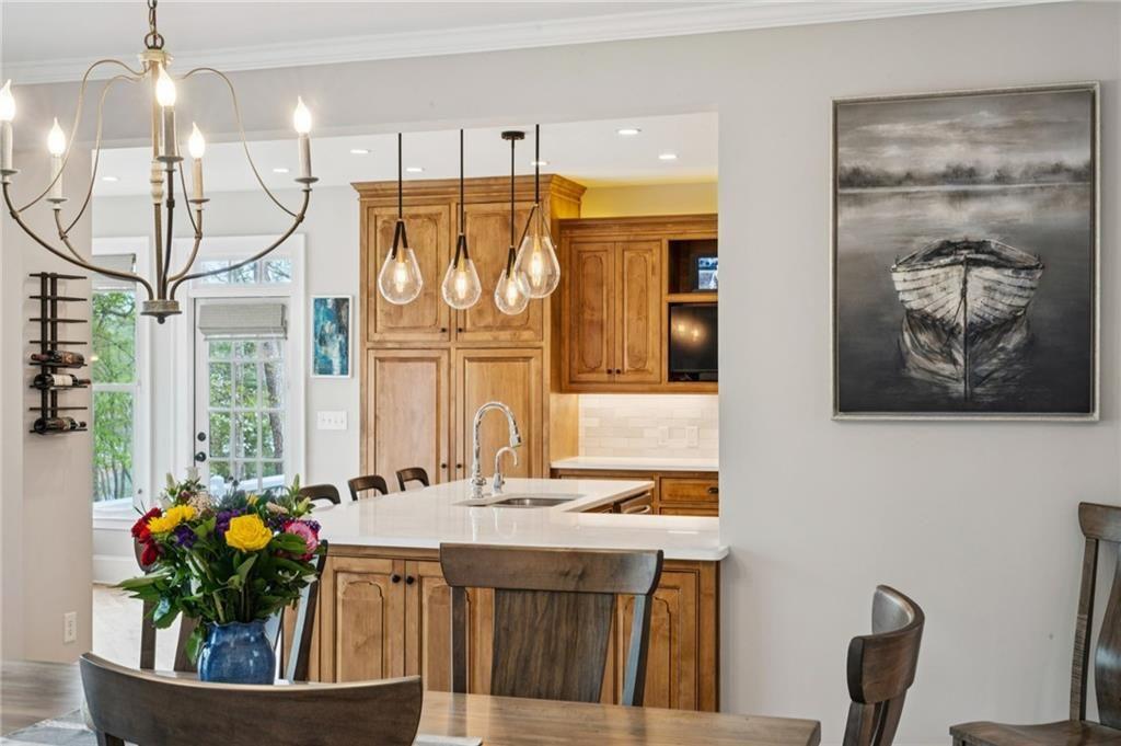 Experience luxury lake living in this one-of-a-kind home located in the highly sought after Waterfront enclave of Chestatee Golf Community on Lake Lanier. Perfectly situated on a peninsula overlooking the convergence of two rivers on the north end of Lake Lanier, this property offers water views and unforgettable sunset vistas. A rare and highly coveted feature, this property includes a transferable deep water boat slip with lift (B-15) in a private marina with 160 slips, ideal for enjoying the full lake lifestyle. Residents of Chestatee enjoy resort-style amenities, including a newly renovated 18-hole championship golf course, Junior Olympic-sized pool, lighted tennis courts, pickle ball and bocce courts, a basketball half-court, and children's playground. The lakeside pavilion with fireplace provides a setting for relaxation, while Nightfire Lodge and Heron Grill offer convenient options for dining and social gatherings. This beautifully updated 4 bedroom and 4.5 bathroom home is truly move-in ready, featuring a thoughtfully designed open floor plan with high-end finishes throughout. New expansive Marvin Infinity windows let in a tremendous amount of natural light. Refinished naturally colored oak hardwood floors on main level, upper level, and terrace level. Warm and inviting family room with wood burning fireplace, stone surround, and elegant wood mantle. French doors from family room lead out to a screened porch and French doors that lead out to multiple decks from kitchen overlooking beautifully landscaped spaces. Grill, entertain, and enjoy lake views from multi-level decks. The kitchen has been recently updated with a more open concept, including new Quartz counter tops and decorative backsplash, overlooking the dining area and family room. Separate laundry room off kitchen. Open staircase leads to upstairs primary bedroom and secondary bedroom with en-suite bath that offers flexibility as a guest suite or home office. Luxurious private primary suite with trey ceiling, sitting area, and private deck that overlooks a perfect oasis. The totally updated spa like primary bath offers Cambria Quartz countertops, slow close cabinets, stylish tiled shower, soaking tub, lovely mirrors and light fixtures, huge walk-in closet with built-in drawers. Open staircase leads to fully finished terrace level that includes an entertainment room with wet bar, and two large bedrooms with en-suite baths. French doors lead out to lower patio with beautifully landscaped spaces designed to maximize the serene like setting. Enjoy the wood burning fire pit with chairs, perfect for entertaining. You are ten steps from a walkway that leads to the Chestatee boats slips and your boat that is ready for a sunset cruise. Additional highlights include new carpet in the terrace bedrooms, bonus room, and primary closet, freshly painted inside and outside, 4 and 1/2 inch wooden shutters on front of the home, Levolor woven shades on the back of the home, new HVAC in bonus room, new water heater, well maintained cedar shake roof, and two car garage with rear stair access. Conveniently located near North Georgia Premium Outlets and the scenic Amicalola Falls State Park, with easy access to dining and outdoor adventures of North Georgia.