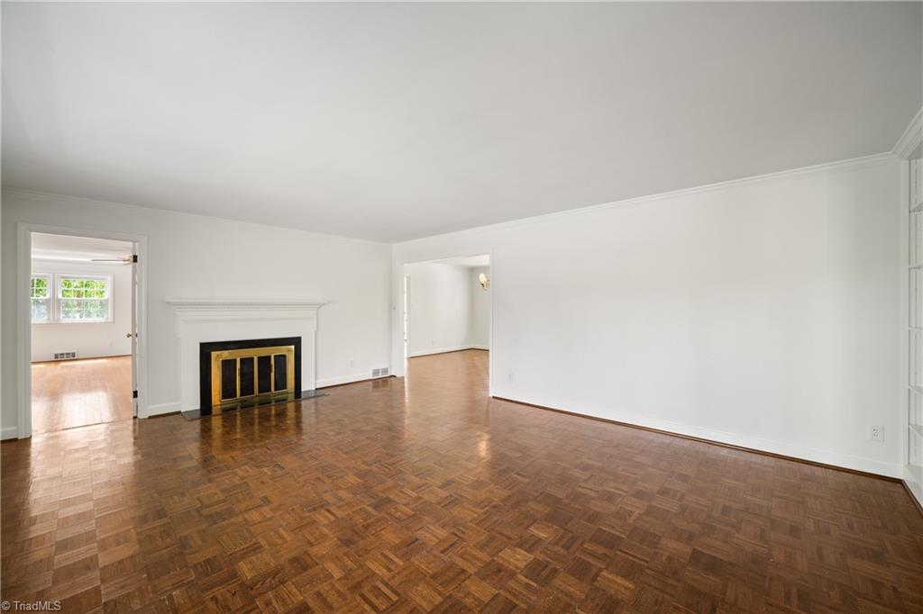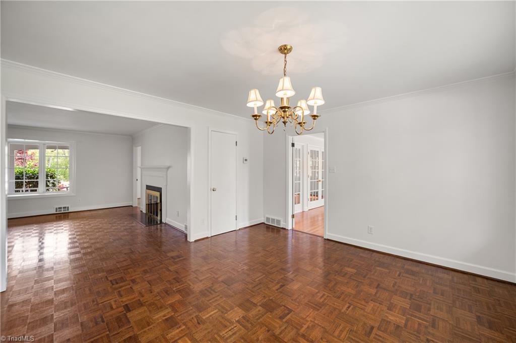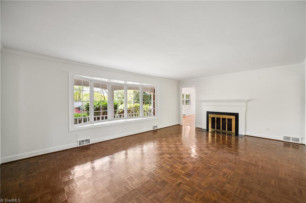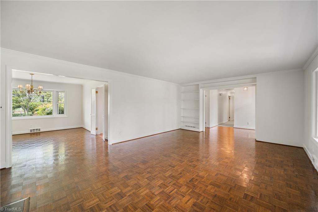 Charming ranch in Sherwood Forest on a flat, usable lot with circular driveway and mature landscaping. Covered front porch offers a welcoming spot to relax. Inside, natural light fills the spacious living room with large windows and a fireplace. Hardwood floors continue to run through the dining room, den with built-ins and fireplace, and office. Kitchen features ample counter space, breakfast nook, and adjacent laundry/drop zone off the carport. All four bedrooms include hardwood floors and fresh interior paint throughout home. Additional features include a screened porch, workshop with electricity, and storage shed. Single-level living with convenient access to Sherwood Plaza and Silas Creek Parkway.
