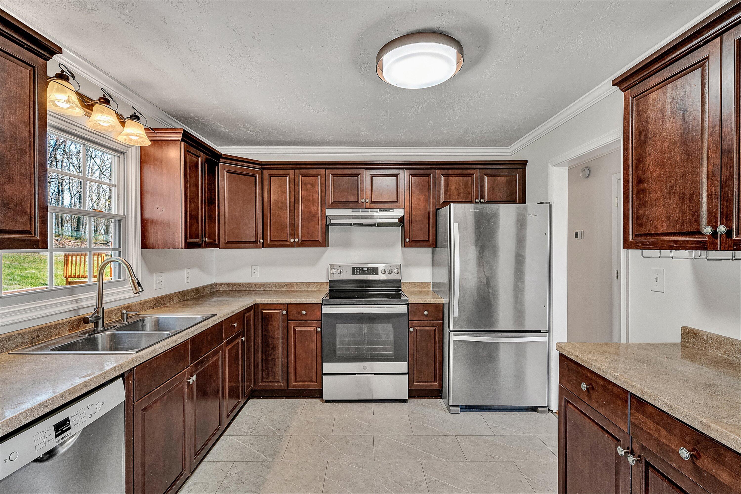 Well-maintained home w/stunning views & thoughtful upgrades throughout! 4 Bedroom, 3 full baths. Enjoy a private, fenced backyard (backs up to woodland) complete w/a shed-Perfect for storage, pets, or outdoor living. Durable tile flooring offers long-term use & easy cleanup! The versatile lower-level bedroom can also serve as a cozy den, featuring a wood stove for added warmth & charm. Bonus rm in basement can be office, game rm, mudroom, or another living area. Major updates include HVAC replaced in 2023, in 2021 they updated the kitchen w/new appliances, flooring (2023), light fixtures & pull-out storage organizers in cabinet. Recently refinished/replaced deck boards-making this home move-in ready & a MUST SEE! Fiber Internet speeds are greater than 1GBPS for those who work from home.