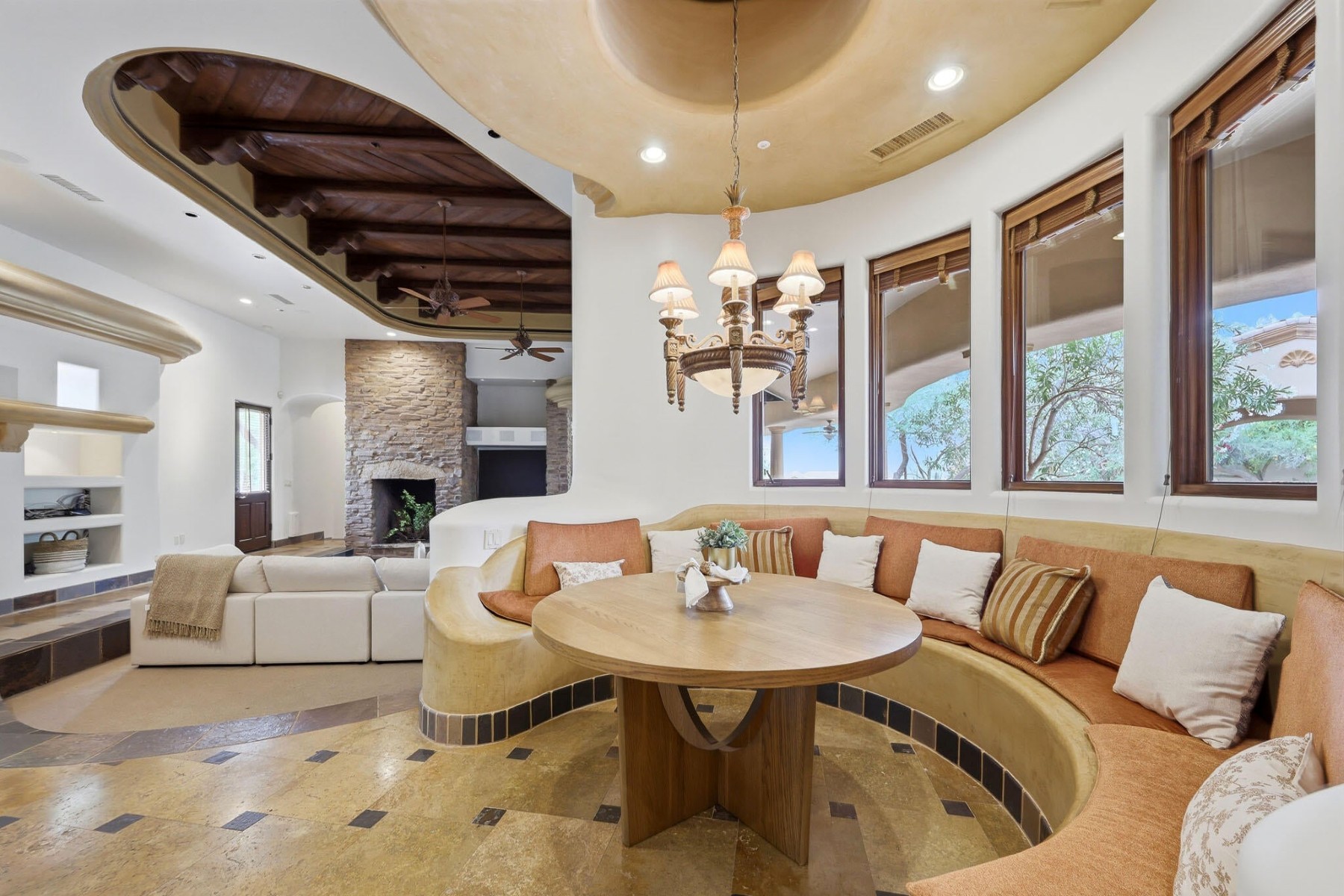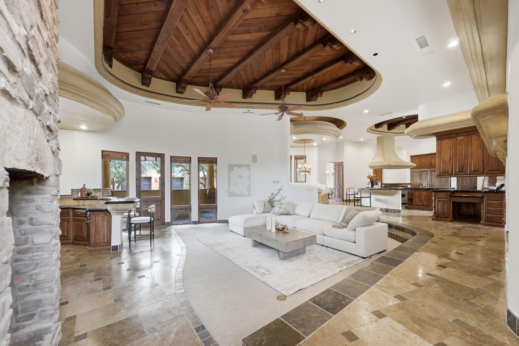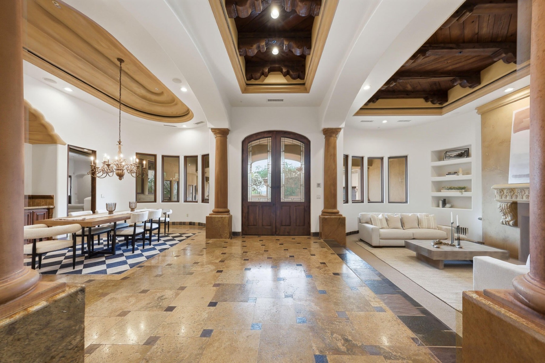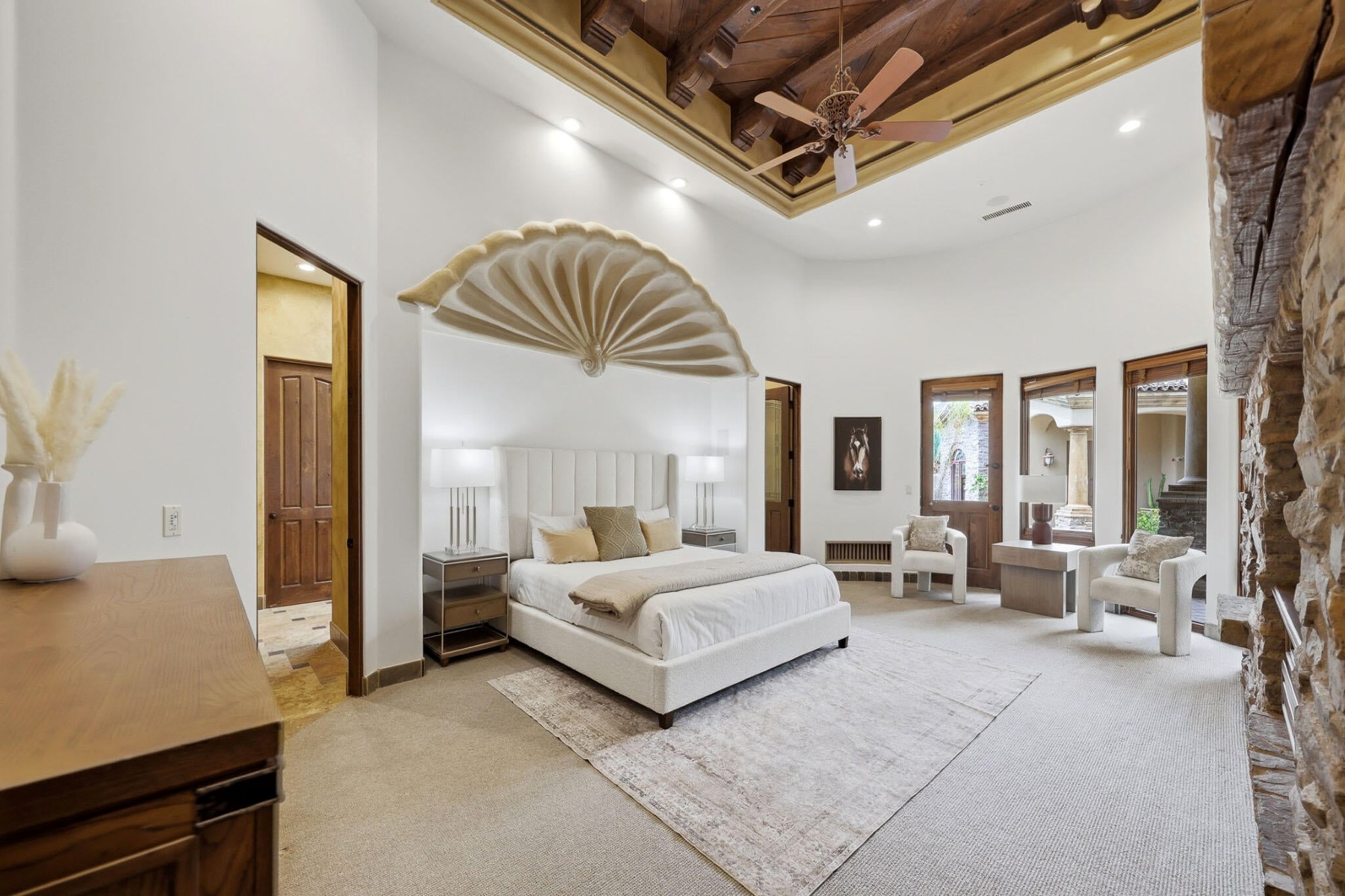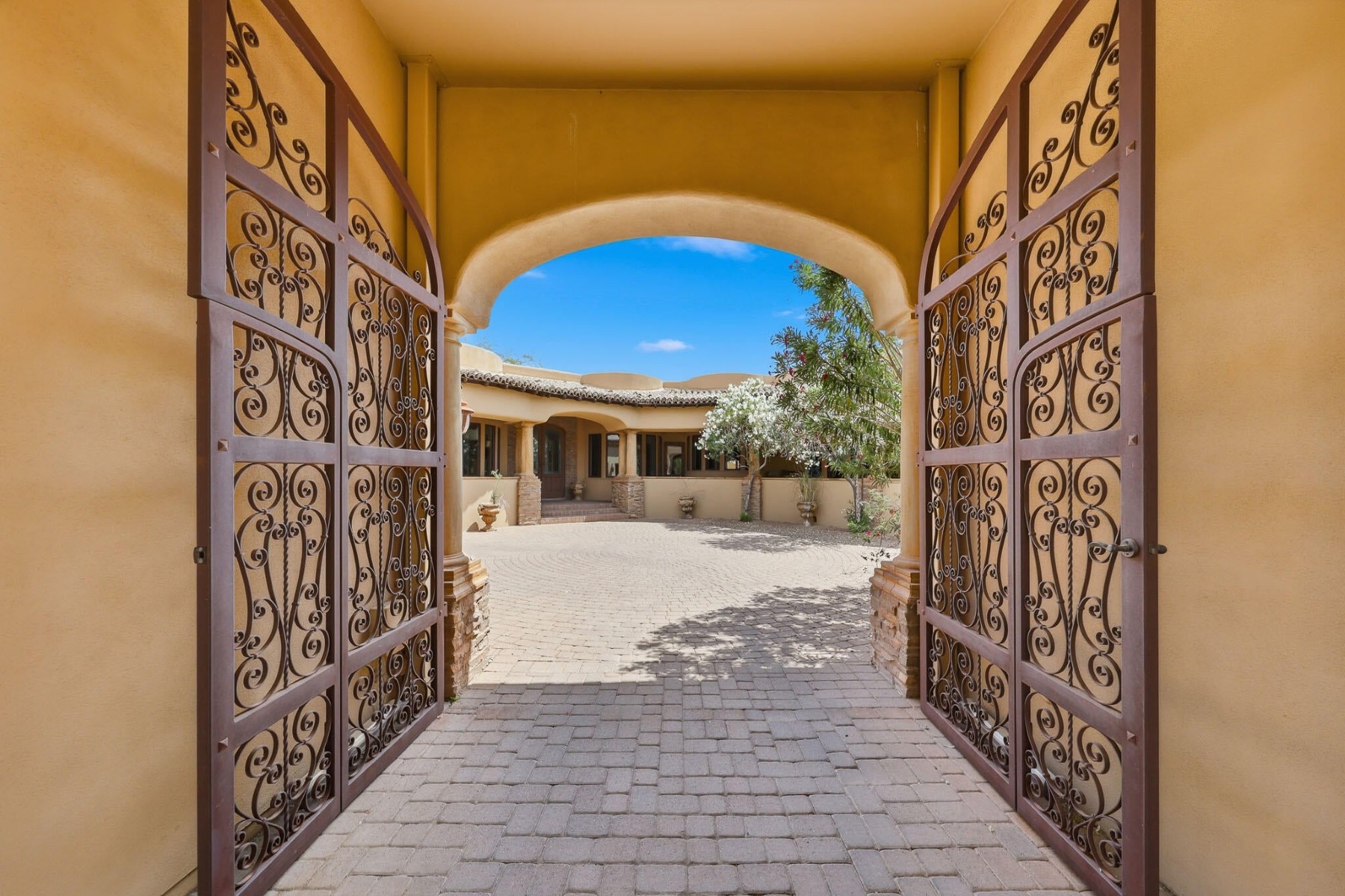 Rare opportunity to own within the guard-gated community of Ancala Country Club. Privately tucked on a quiet cul-de-sac, this exceptional Randy Cozins custom estate captures breathtaking city light and mountain views, with a private gated entry and expansive circular stone driveway setting the tone for the privacy and scale found throughout. Inside, soaring ceilings, hand-applied plaster finishes, and thoughtful custom details create a warm, refined atmosphere. The split floor plan is both functional and well-designed, featuring a dedicated guest wing with three ensuite bedrooms and a private sitting area for added separation. The chefs kitchen serves as the heart of the home, complete with premium appliances, generous workspace, and a large island, all opening seamlessly to the great room. The primary suite offers a true retreat with dual closets, private laundry, a fireplace, and direct access to the outdoor living spaces. Outdoors, the front-facing pool and spa, built-in BBQ, and multiple seating areas are perfectly positioned to take in both city light and mountain views. An oversized garage with double-height ceilings provides flexibility for additional vehicle storage with lifts. Come experience the privacy, thoughtful design, and timeless quality that define this exceptional Ancala residence.