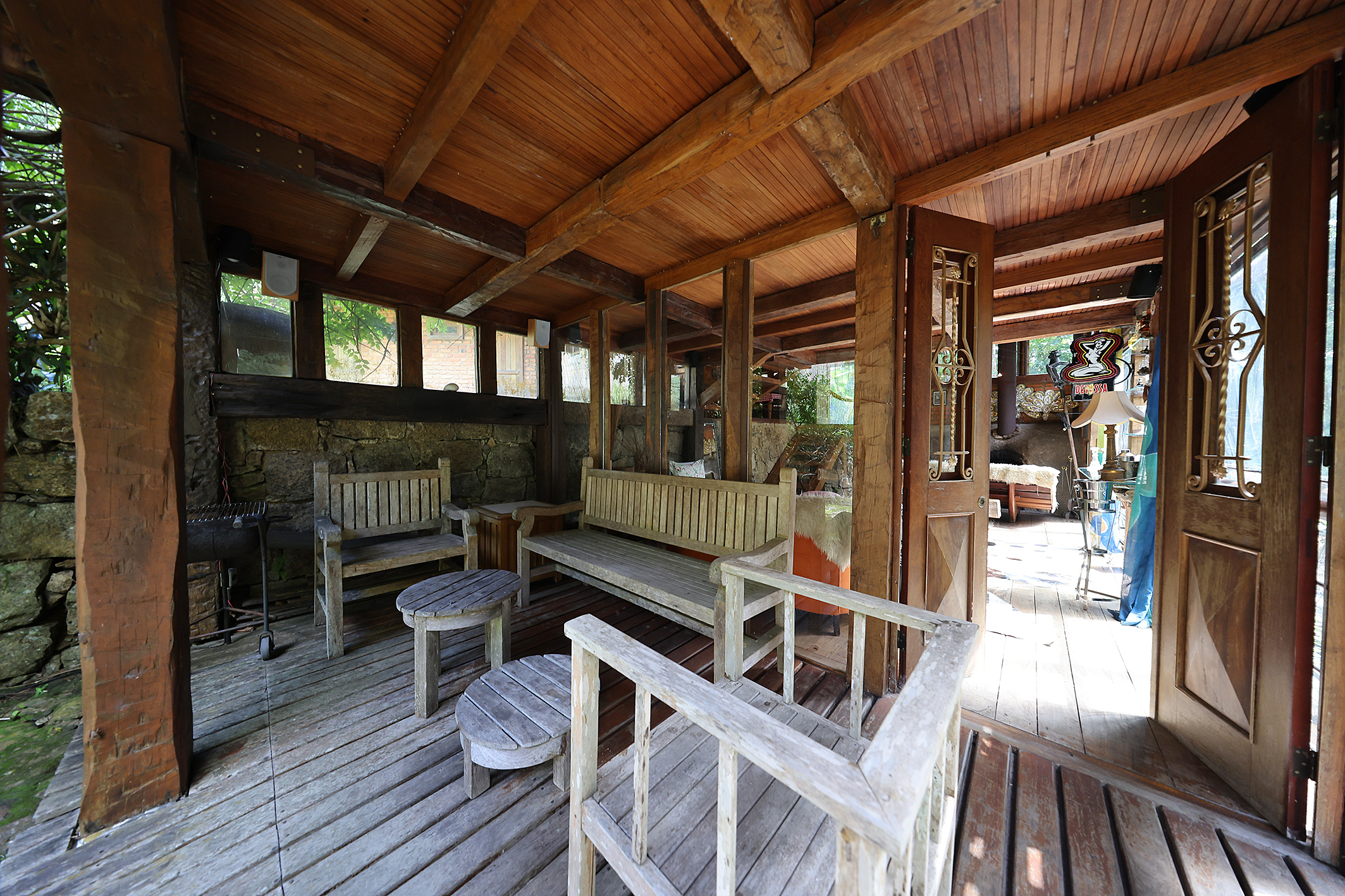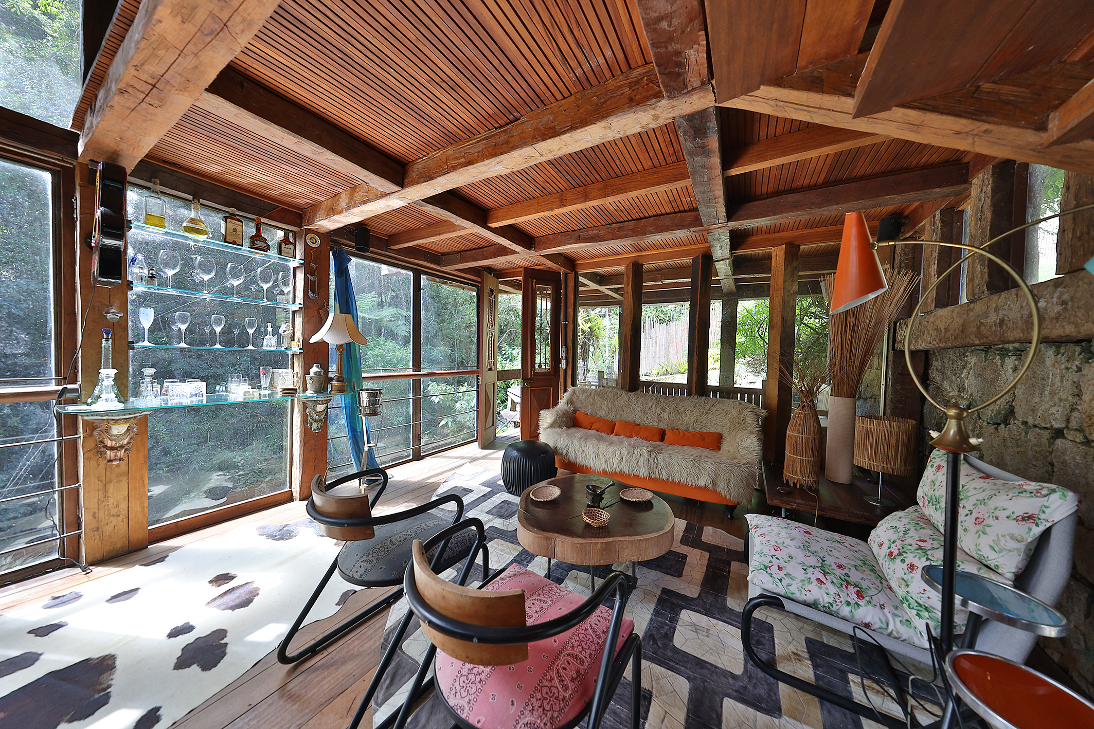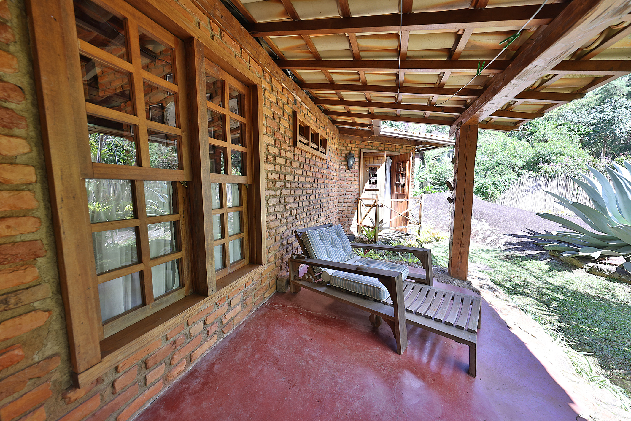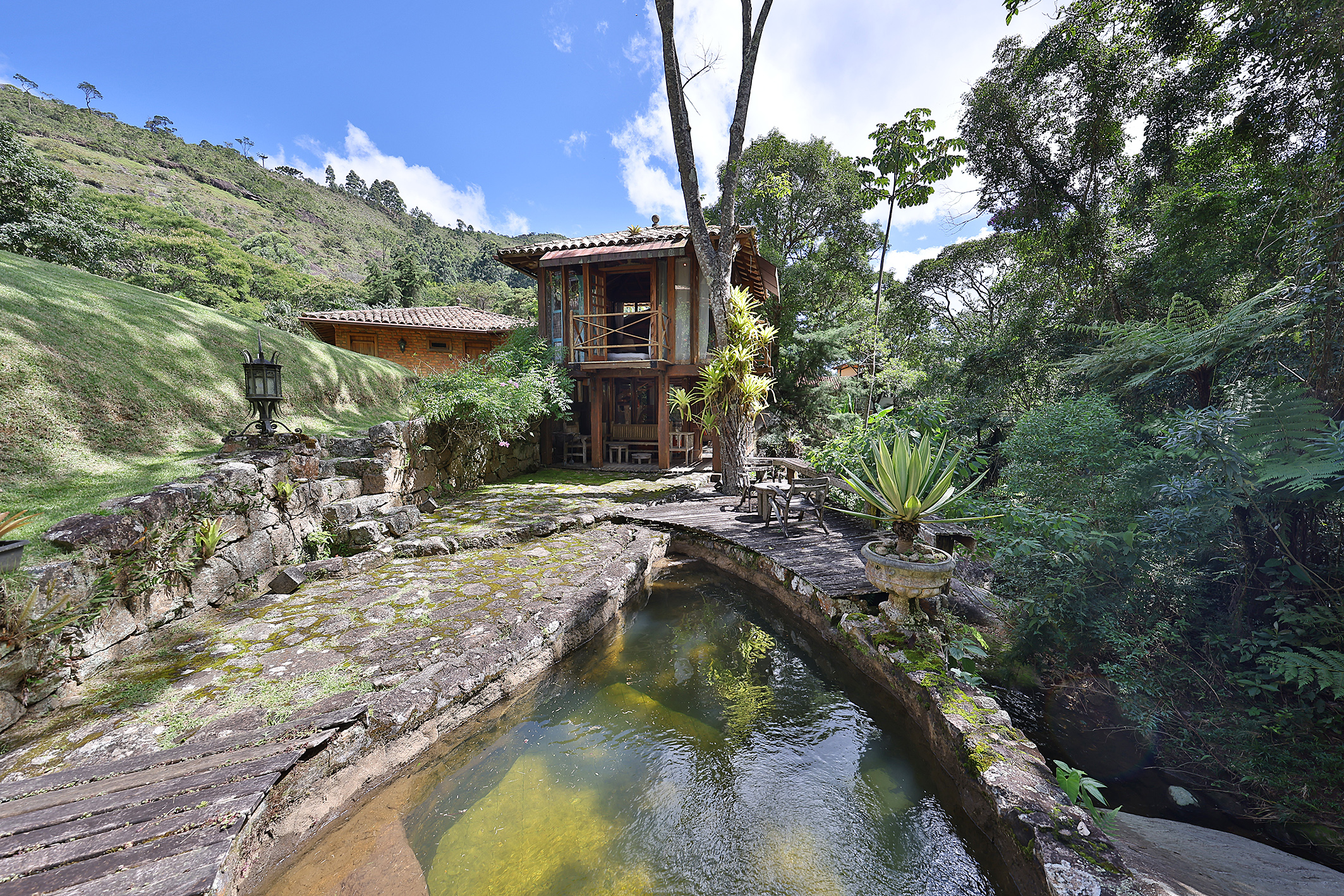 Set on a plot bordering a river, this residence is immersed in a nature-surrounded setting, defined by its connection to the landscape. Built entirely in wood, the architecture reinforces this relationship, while large windows frame constant views and allow natural light to flow throughout the interiors. The social area includes a living room connected to the entrance veranda, as well as a second lounge with a stone-carved fireplace, creating a warm and inviting atmosphere. A mezzanine level features an additional terrace overlooking the river, extending the experience of the surroundings. The private quarters comprise two bedrooms, including one suite, along with an additional bathroom. The property also includes a kitchen and a landscaped garden with an outdoor shower and a pond with fish, complementing the outdoor experience. The residence offers two parking spaces, completing a setting defined by privacy, natural elements, and a slower pace of living.