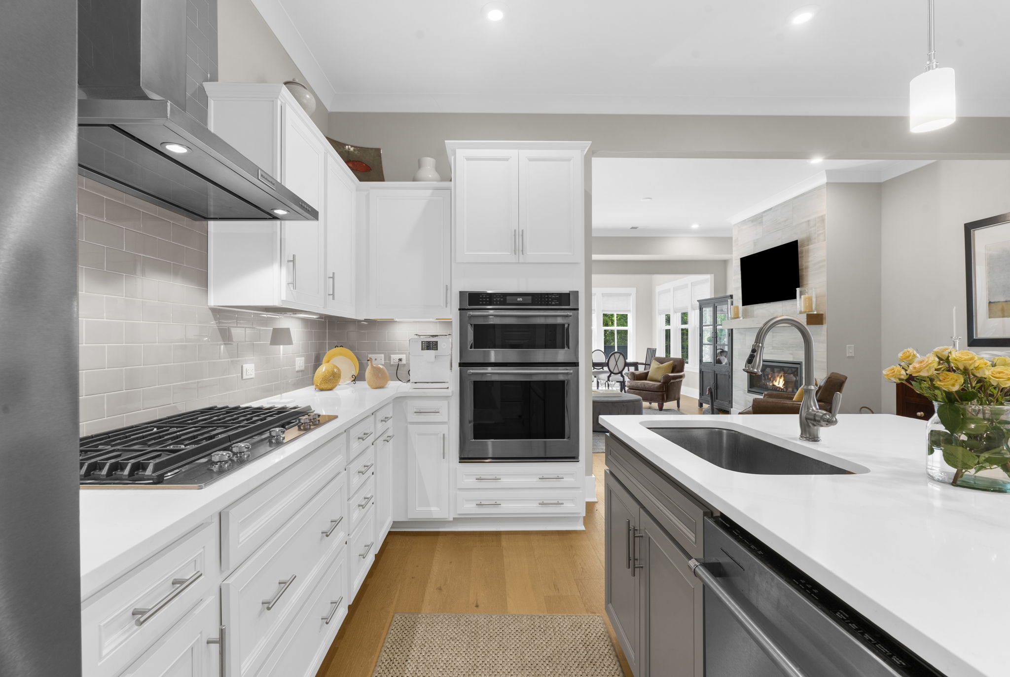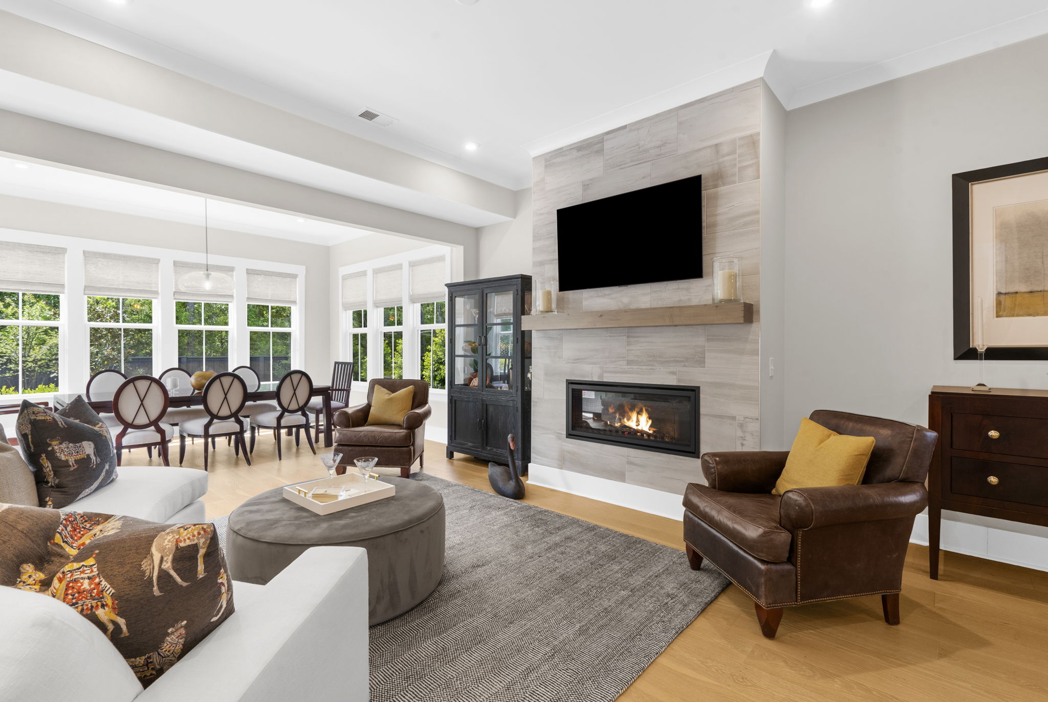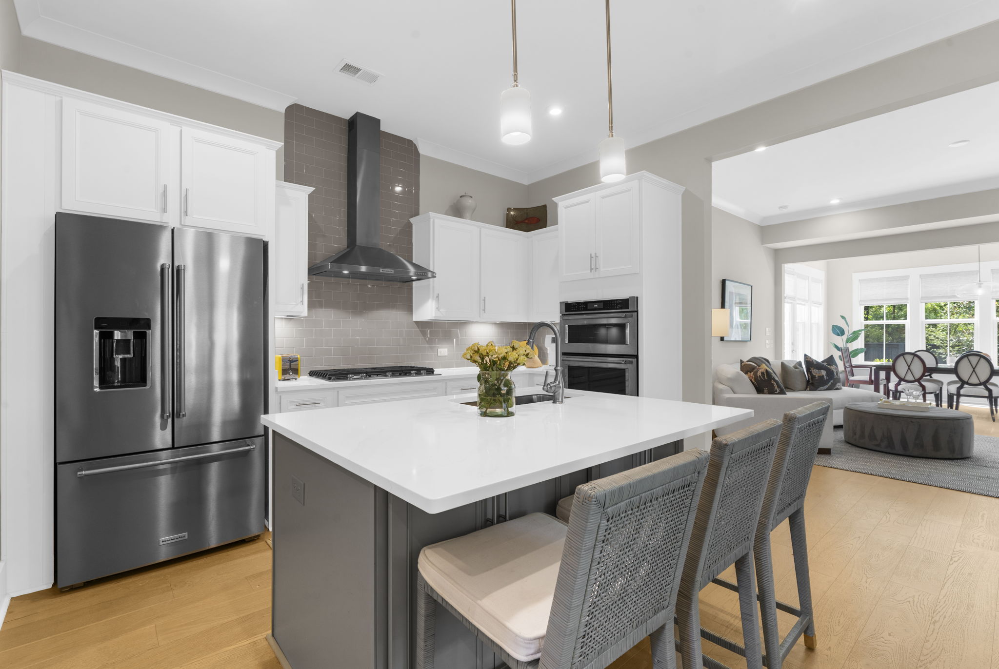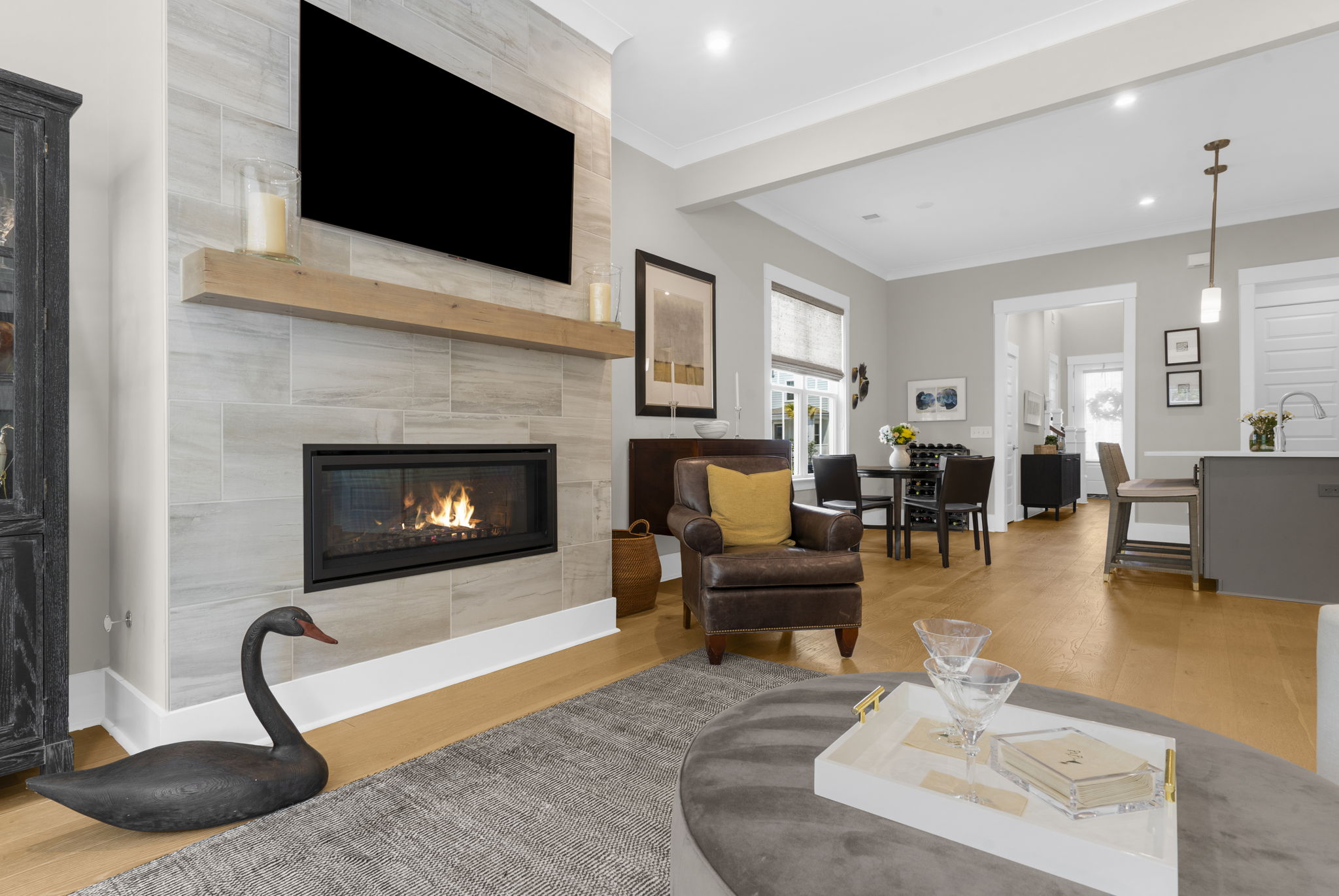 A central loft-style living area offers the perfect space for a media room, playroom, or generous home office. Thoughtfully curated builder upgrades elevate every inch of the home. The chef's kitchen is outfitted with KitchenAid appliances, including a gas cooktop, wall oven, and French door refrigerator, complemented by Calacatta Gold quartz countertops, upgraded cabinetry with soft-close features, under-cabinet lighting, and a designer backsplash. The main living area is anchored by a linear fireplace with an alder oak mantel and tile surround. Light oak hardwood flooring extends throughout the main level and continues into the upstairs loft and hallway, while crown molding and refined finishes add a cohesive, polished feel throughout. Additional enhancements include a frameless glass shower in the primary bath, Silestone quartz surfaces in all bathrooms, upgraded tile work, framed mirrors, and brushed nickel hardware throughout. The staircase features oak treads with an open rail and iron spindles, creating a striking architectural focal point. A spacious two-car garage includes an electric vehicle charging station, offering both convenience and forward-thinking functionality. Exterior upgrades such as a gas lantern, full-house gutters, upgraded garage door with windows, and an enhanced HVAC system (15 SEER, 96%) further contribute to the home's quality and efficiency. Hunter Douglas woven wood shades and custom blinds complete the interior. Amenities include access to miles of paved multi-purpose paths and sidewalks, the Riverview Pavilion, a dock, a playground, crab docks, and ponds. *Buyer/Buyer agent to verify all pertinent information.