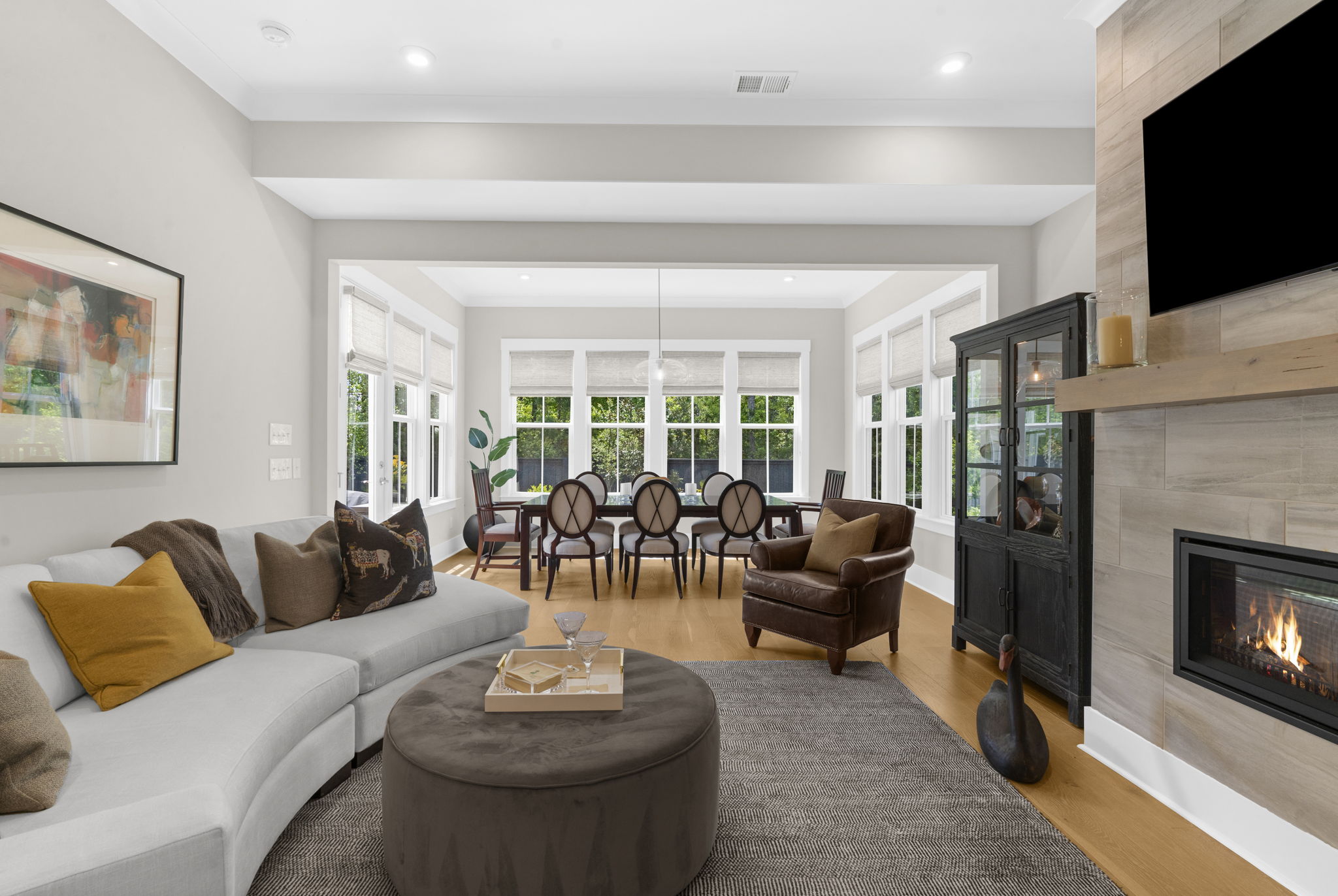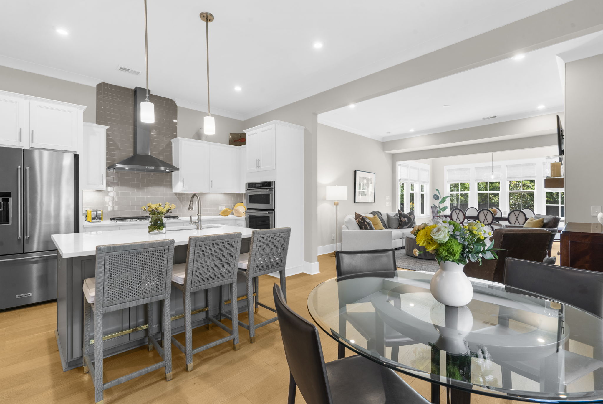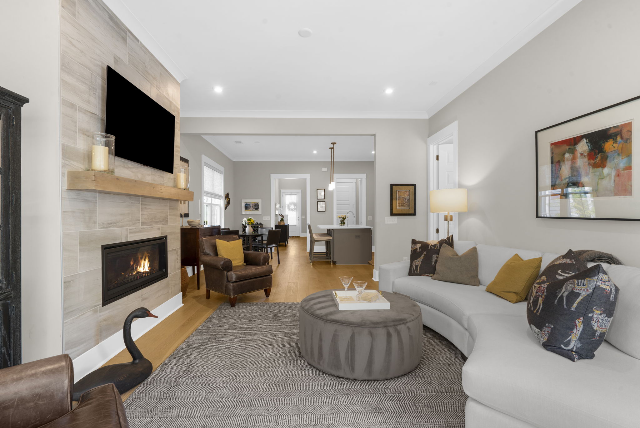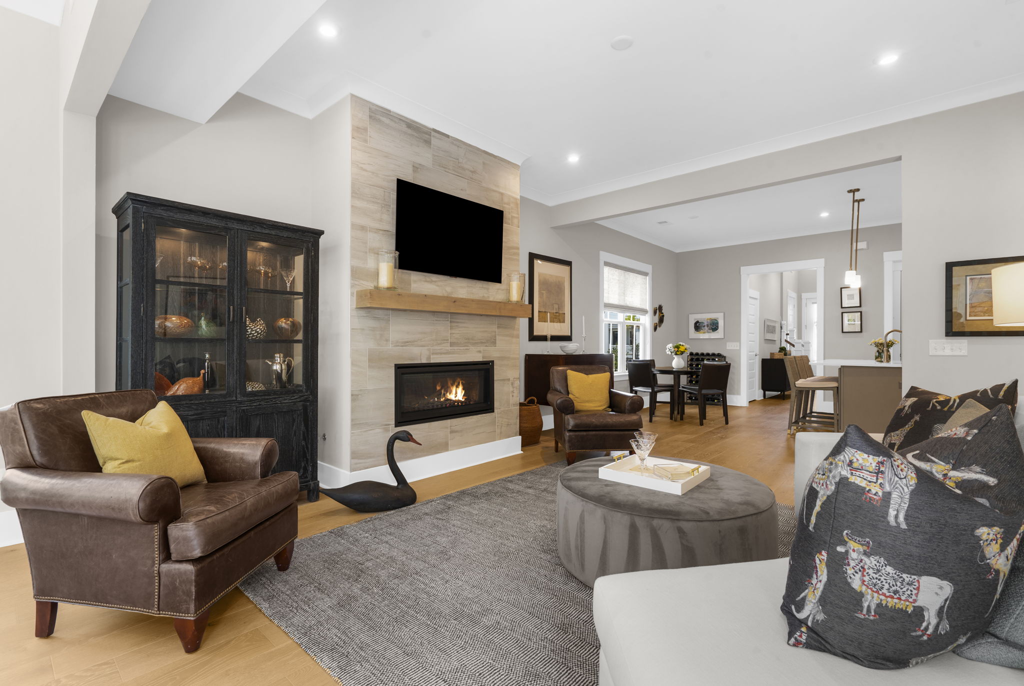 A central loft-style living area offers the perfect space for a media room, playroom, or generous home office. Thoughtfully curated builder upgrades elevate every inch of the home. The chef's kitchen is outfitted with KitchenAid appliances, including a gas cooktop, wall oven, and French door refrigerator, complemented by Calacatta Gold quartz countertops, upgraded cabinetry with soft-close features, under-cabinet lighting, and a designer backsplash. The main living area is anchored by a linear fireplace with an alder oak mantel and tile surround. Light oak hardwood flooring extends throughout the main level and continues into the upstairs loft and hallway, while crown molding and refined finishes add a cohesive, polished feel throughout. Additional enhancements include a frameless glass shower in the primary bath, Silestone quartz surfaces in all bathrooms, upgraded tile work, framed mirrors, and brushed nickel hardware throughout. The staircase features oak treads with an open rail and iron spindles, creating a striking architectural focal point. A spacious two-car garage includes an electric vehicle charging station, offering both convenience and forward-thinking functionality. Exterior upgrades such as a gas lantern, full-house gutters, upgraded garage door with windows, and an enhanced HVAC system (15 SEER, 96%) further contribute to the home's quality and efficiency. Hunter Douglas woven wood shades and custom blinds complete the interior. Amenities include access to miles of paved multi-purpose paths and sidewalks, the Riverview Pavilion, a dock, a playground, crab docks, and ponds. *Buyer/Buyer agent to verify all pertinent information.