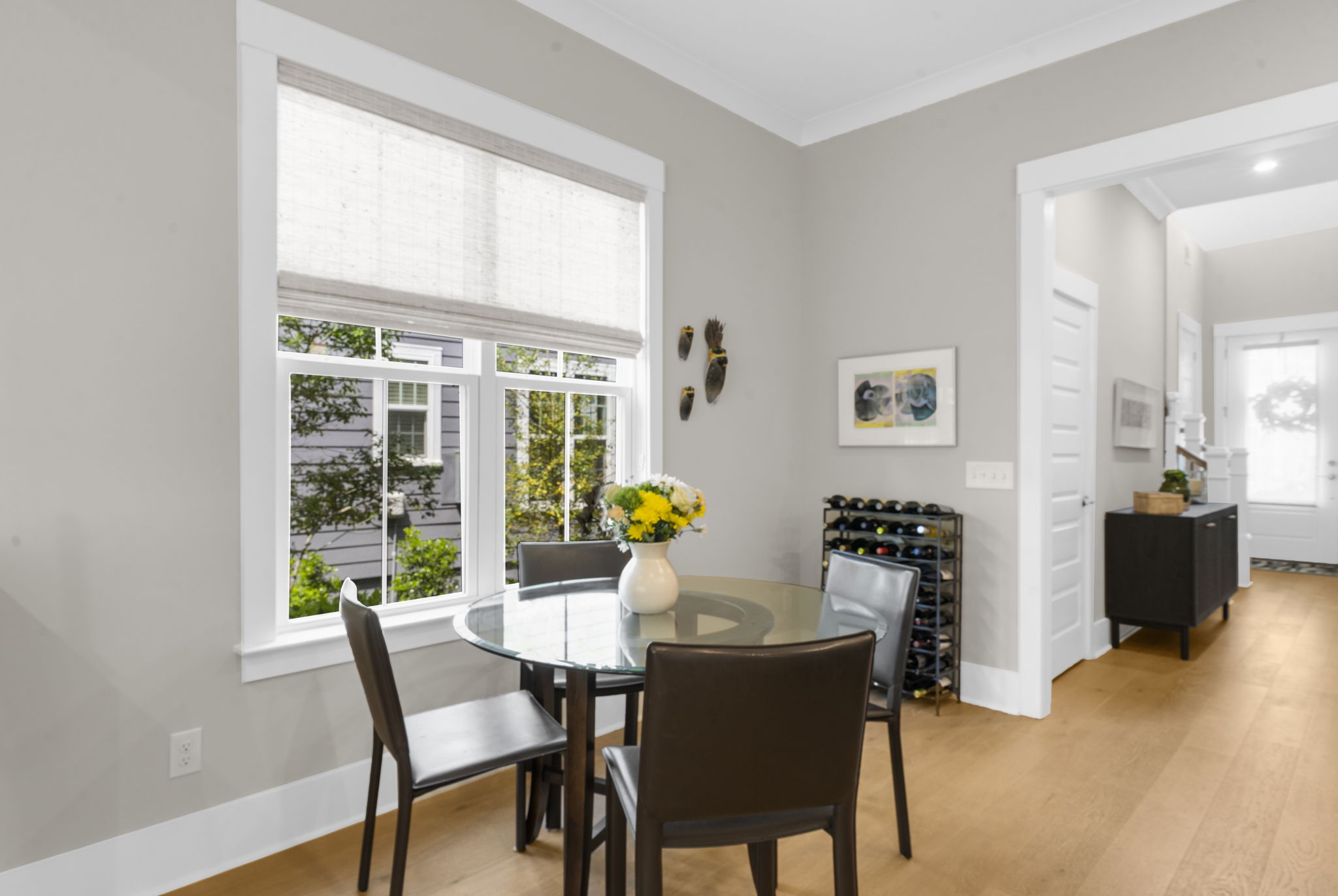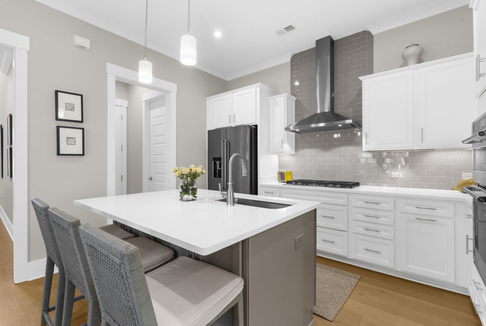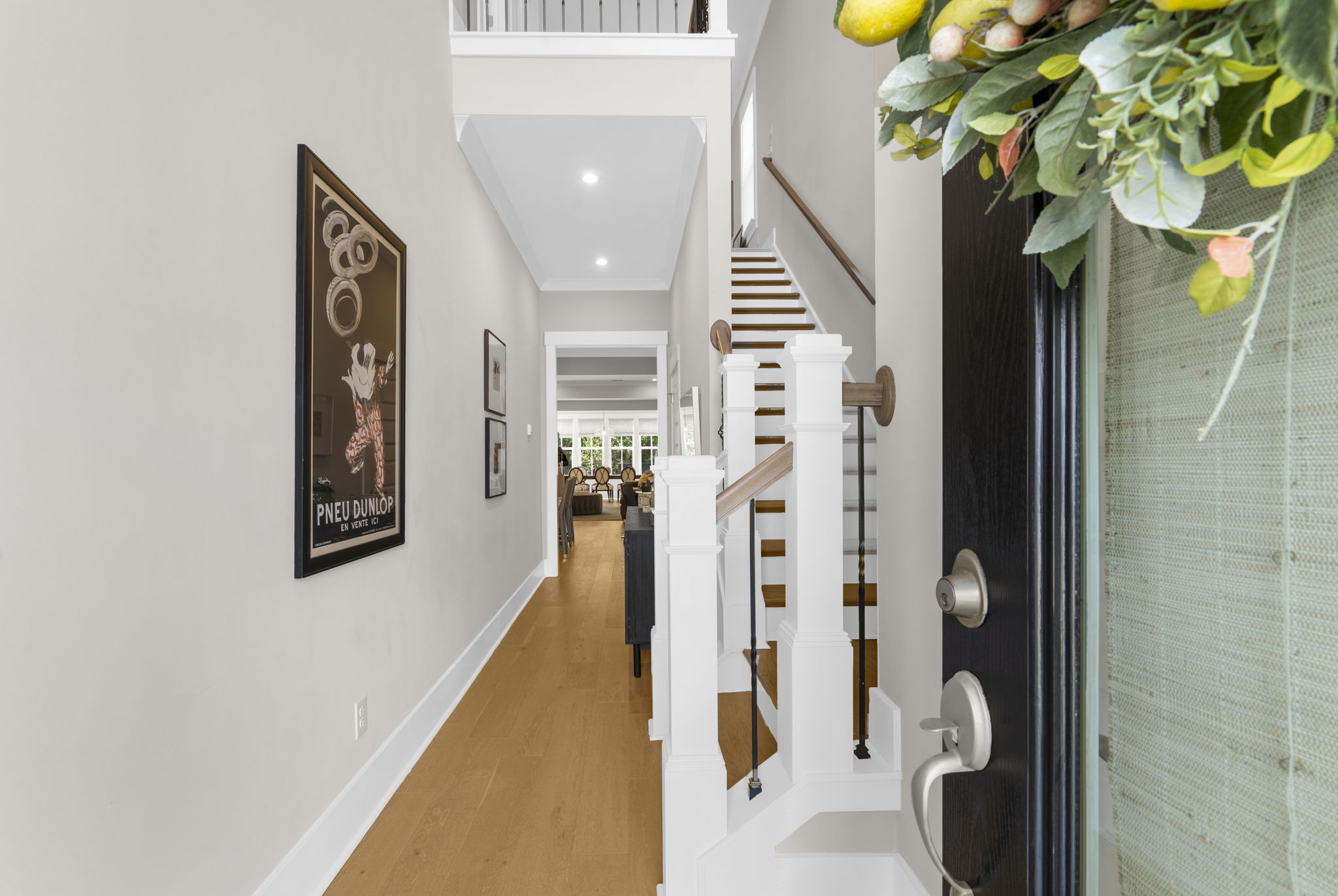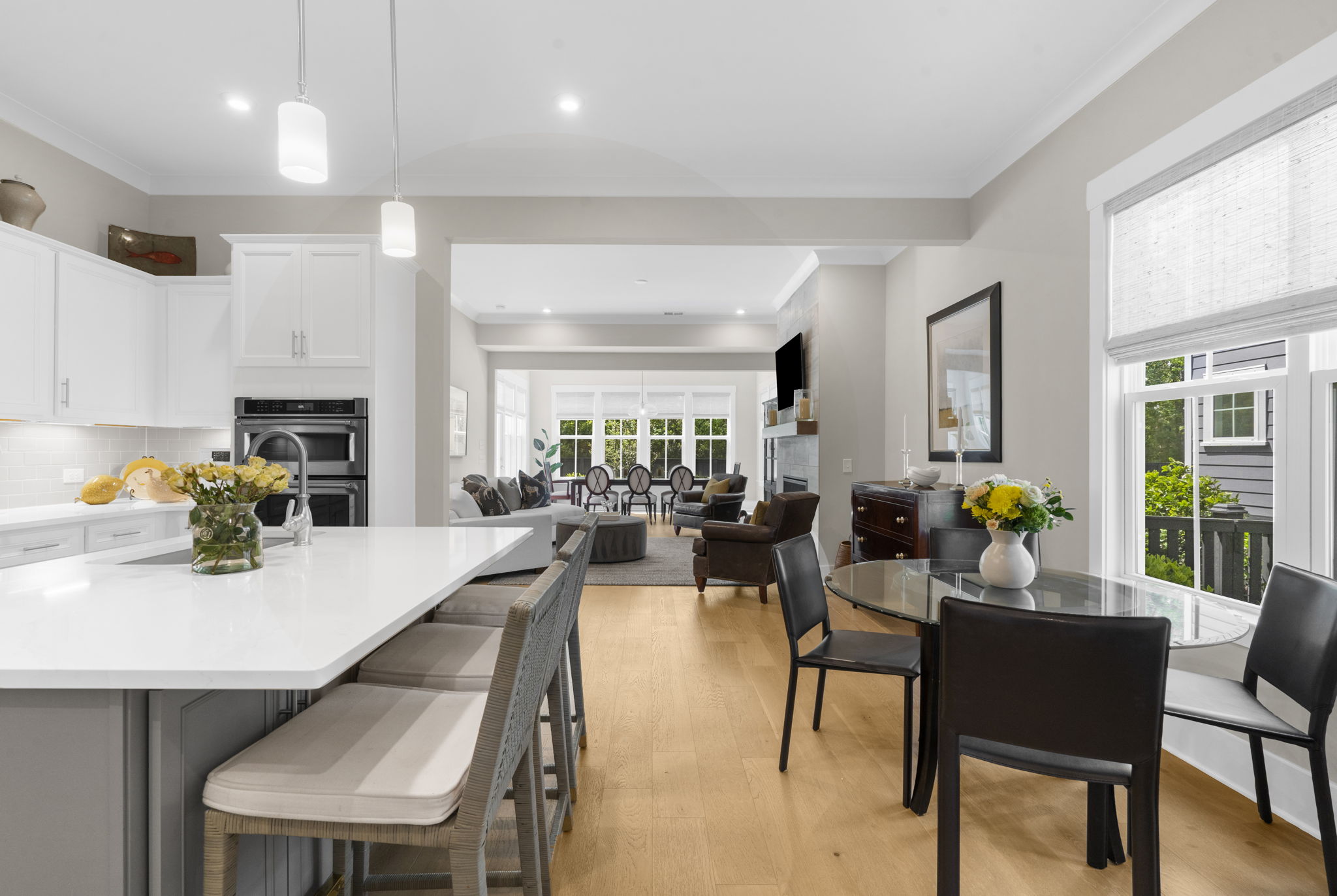A central loft-style living area offers the perfect space for a media room, playroom, or generous home office. Thoughtfully curated builder upgrades elevate every inch of the home. The chef's kitchen is outfitted with KitchenAid appliances, including a gas cooktop, wall oven, and French door refrigerator, complemented by Calacatta Gold quartz countertops, upgraded cabinetry with soft-close features, under-cabinet lighting, and a designer backsplash. The main living area is anchored by a linear fireplace with an alder oak mantel and tile surround. Light oak hardwood flooring extends throughout the main level and continues into the upstairs loft and hallway, while crown molding and refined finishes add a cohesive, polished feel throughout. Additional enhancements include a frameless glass shower in the primary bath, Silestone quartz surfaces in all bathrooms, upgraded tile work, framed mirrors, and brushed nickel hardware throughout. The staircase features oak treads with an open rail and iron spindles, creating a striking architectural focal point. A spacious two-car garage includes an electric vehicle charging station, offering both convenience and forward-thinking functionality. Exterior upgrades such as a gas lantern, full-house gutters, upgraded garage door with windows, and an enhanced HVAC system (15 SEER, 96%) further contribute to the home's quality and efficiency. Hunter Douglas woven wood shades and custom blinds complete the interior. Amenities include access to miles of paved multi-purpose paths and sidewalks, the Riverview Pavilion, a dock, a playground, crab docks, and ponds. *Buyer/Buyer agent to verify all pertinent information.
