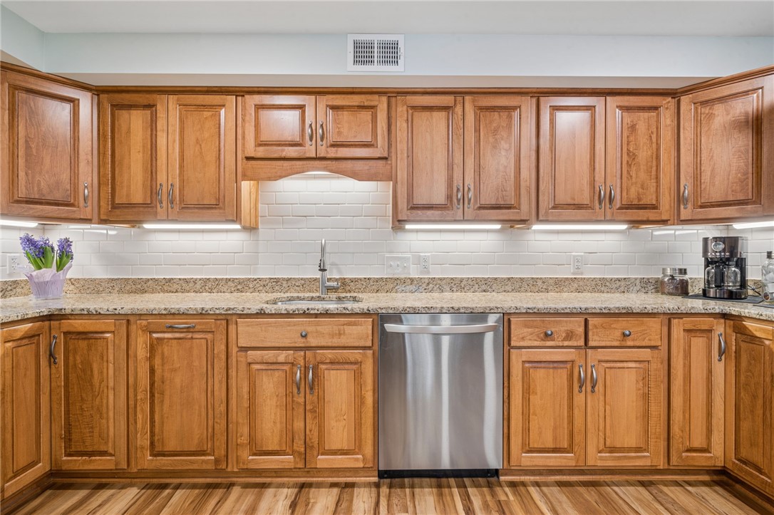 TRUE STEP FREE LIVING. Stunning 2 bedroom 2 bath FULLY RENOVATED unit. Great location within the building having lovely "more private wooded views" from covered porch. Desirable End Unit. The kitchen has been renovated and boasts beautiful cabinetry, neutral granite counters, crisp white subway tile backsplash, loads of storage, newer LG Appliance Package to include; Refrigerator with automatic icemaker, dishwasher, disposal, microwave, induction cooktop, warming burner, convection bake/roast/air fry and "air sous vide" for low and slow cooking. Beautiful neutral color pallet through out. Fully updated bathrooms with luxurious granite and ceramic tile. Light fixtures are modern and in excellent taste. Separate laundry room with laundry tub and new cabinets. NO AGE RESTRICTIONS. Rooms are generously sized with plenty of closet storage and loads of natural light pouring in. All new Anderson Windows and new sliding door that leads out to the covered balcony. The Owner's Suite is privately located with a large walk in closet. This unit has one assigned parking space in the parking garage. Additional parking spaces available in the parking lot for residents and guests. Each condo unit has its own storage room. Each resident has use of patio storage area. MONTHLY HOA FEE IS $342 This includes trash, water, sewage, use of building common areas such as pool, bocce, gym, library, rec room with kitchen, elevator, lobby, and the beautifully manicured grounds. Live in building maintenance manager keeps things in tip top shape for the residents. Building is safe and secure and is equipped with a generator that operates the elevator, garage door and hall lights. Private road fee for Lago DeVita is $470 per year. Condo assessment fee is $1,738 per year. PETS NOT ALLOWED. SERVICE DOGS ONLY.