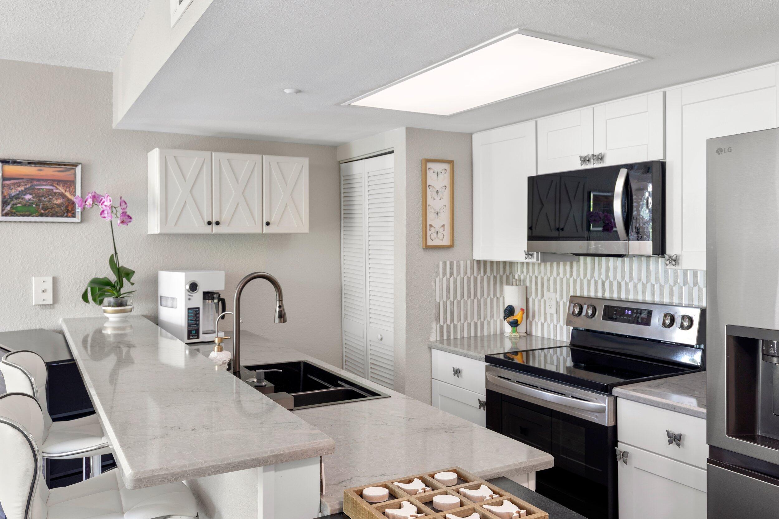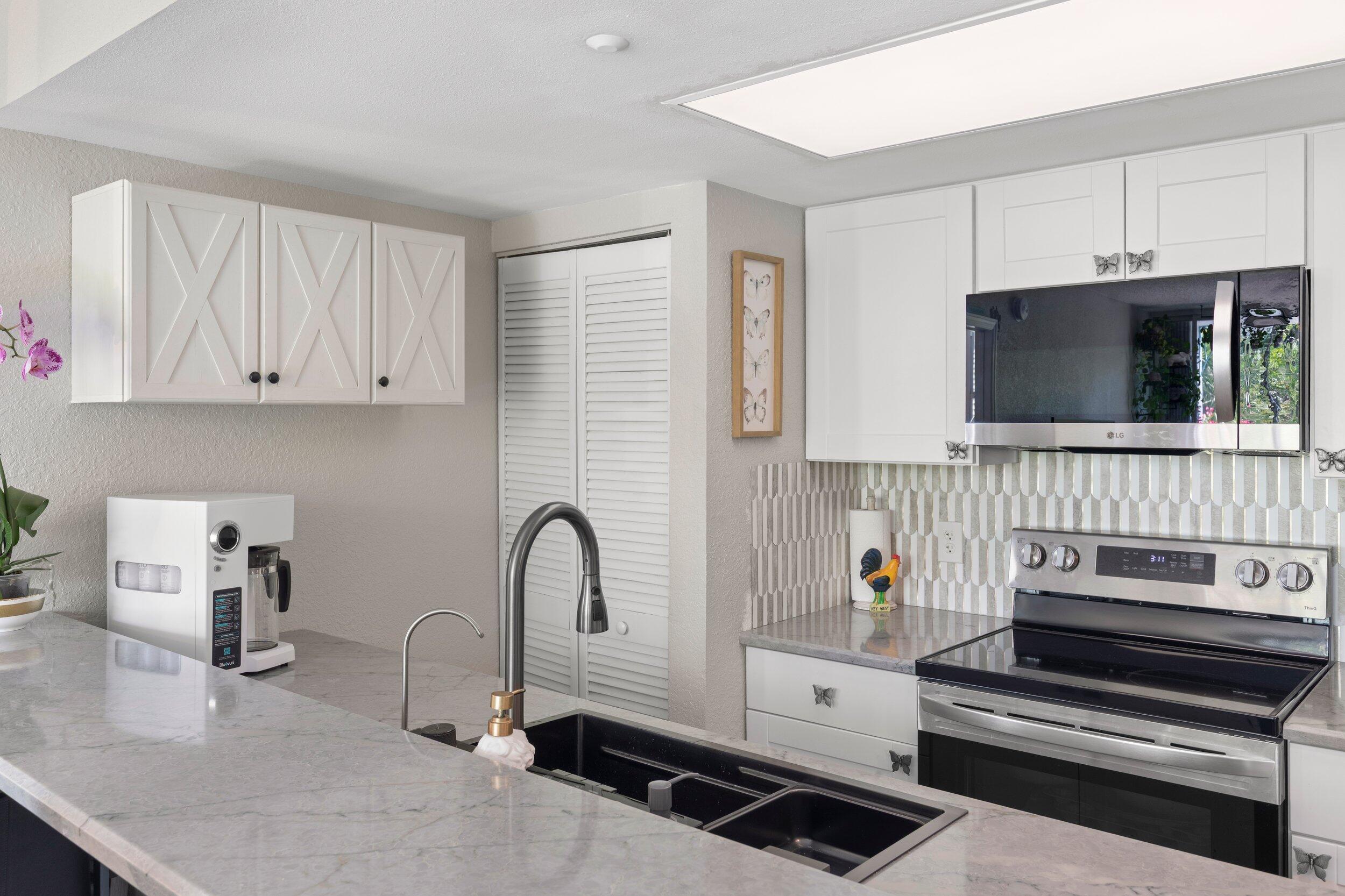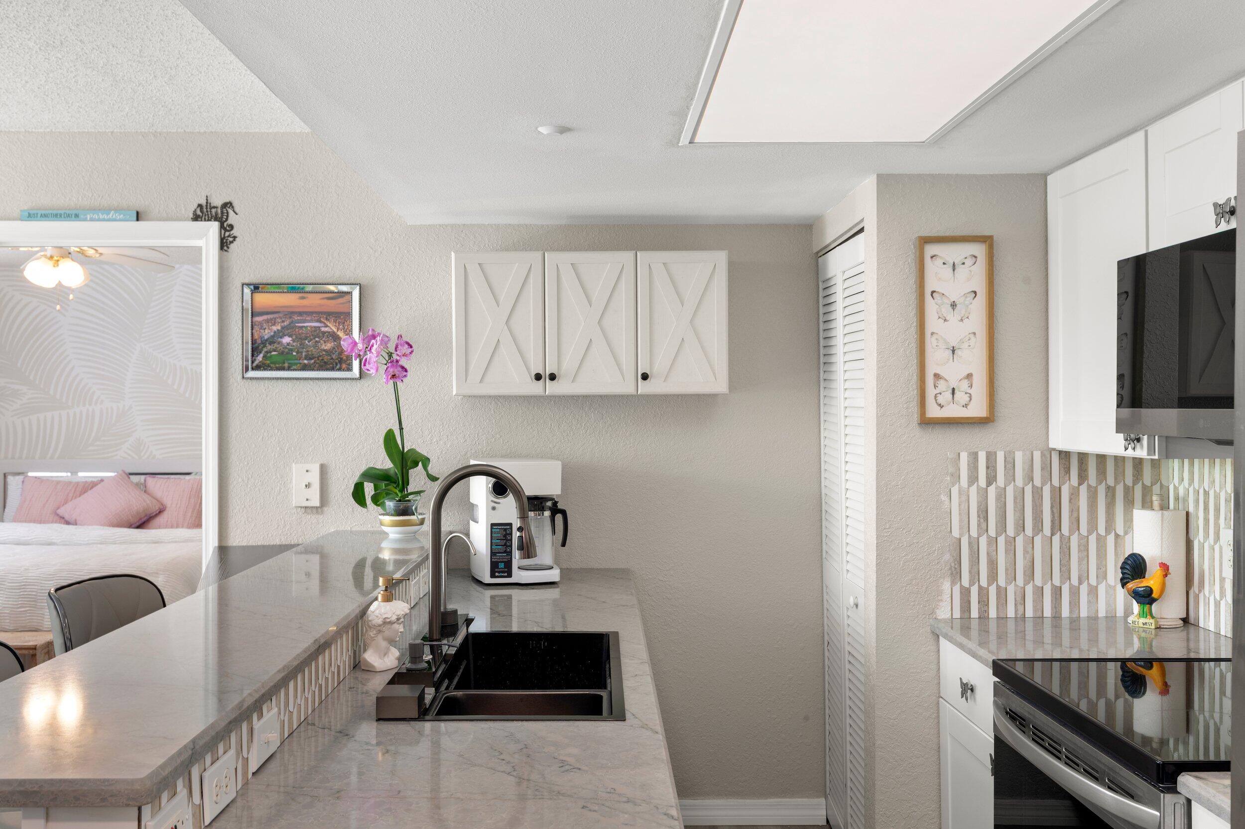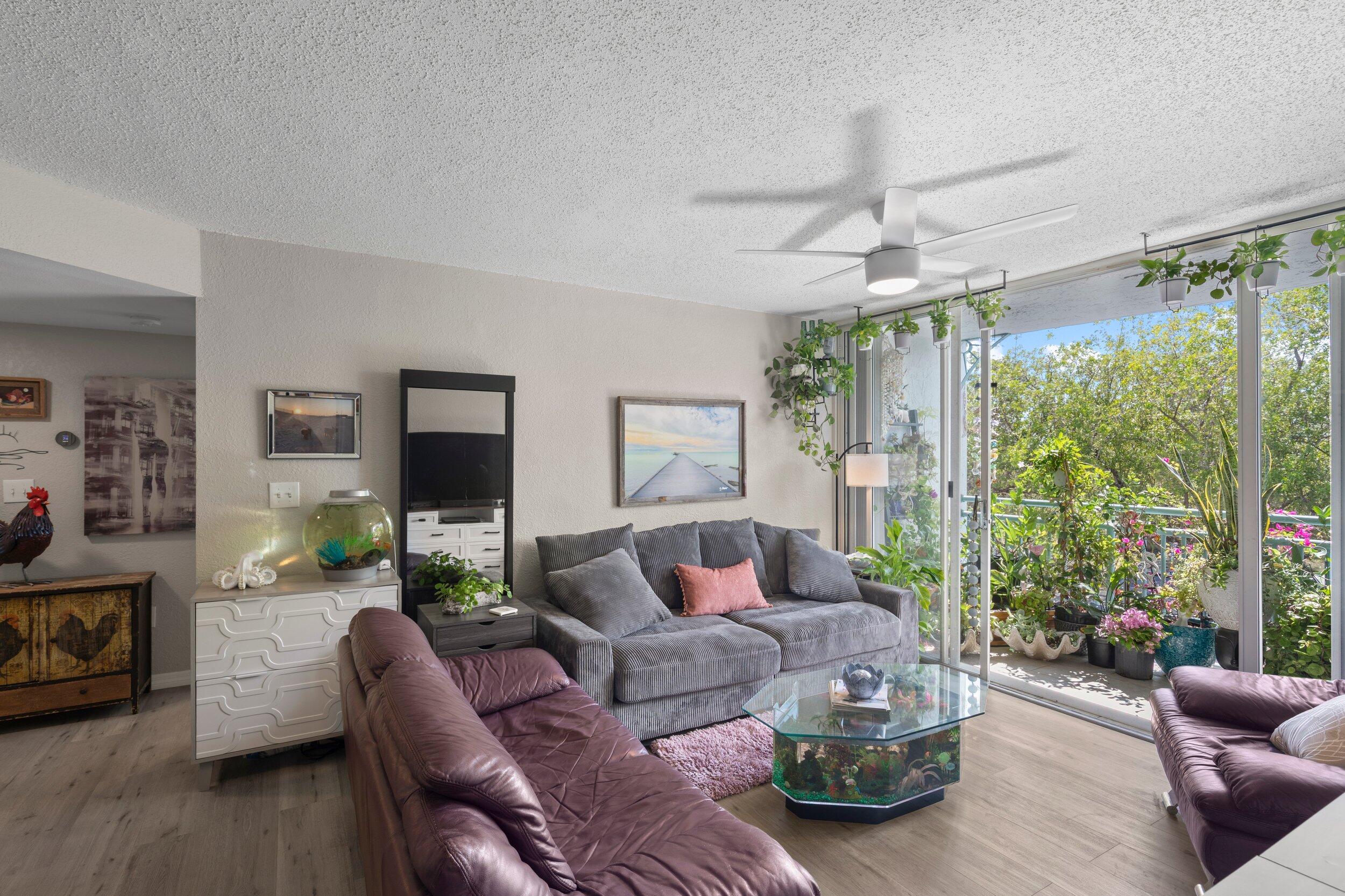 Experience stunning Key West sunsets from your private balcony, overlooking a peaceful, lush landscape filled with tropical greenery. Unlike many units, your view is completely private and serene, with nothing but nature in sight. Enjoy a lush, tropical view that occasionally transforms into a serene, reflective water landscape after rainfall.This beautifully renovated residence has been thoughtfully updated throughout. The kitchen features quartz countertops, brand-new appliances, and a clean, modern finish. Both bathrooms have been upgraded with new vanities and a fully tiled walk-in shower, complemented by fresh paint and designer wallpaper that adds warmth and character.The split floor plan offers ideal privacy, with a spacious primary suite large enough for a king bed, a walk-in closet with custom built-ins, and abundant natural light. The guest suite includes its own bathroom along with a convenient in-unit washer and dryer.Additional upgrades continue outside with a covered carport that includes electric service--perfect for charging your golf cart, a rare and valuable feature in Key West.Located in the desirable Salt Ponds community, enjoy resort-style amenities including a newly updated pool and spa, tennis courts, walking paths, and beautifully maintained grounds. Just minutes from Smathers Beach, biking trails, kayaking, and the airport, this is island living at its best.Secure your fully upgraded, move-in-ready piece of paradise today.Owner is a licensed real estate agent.