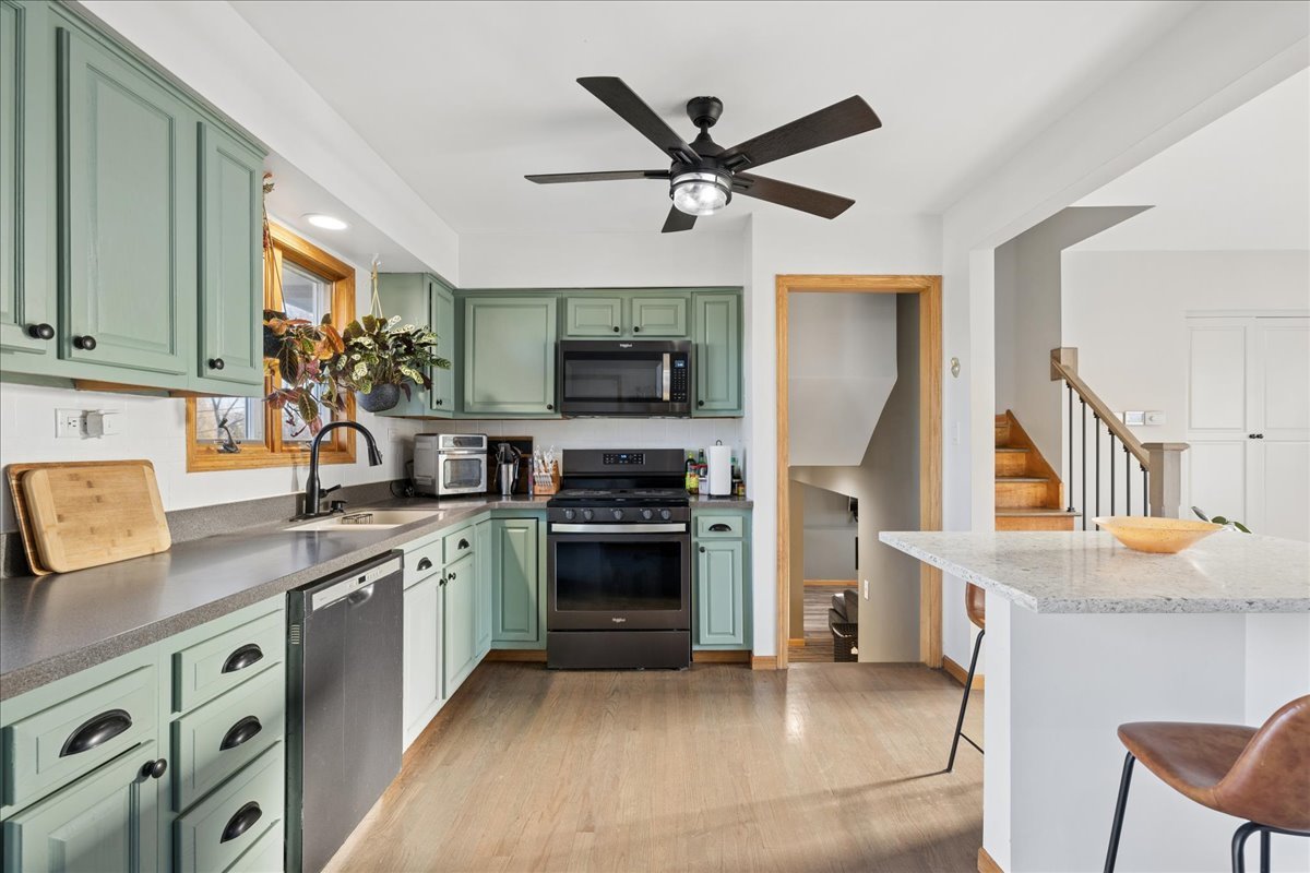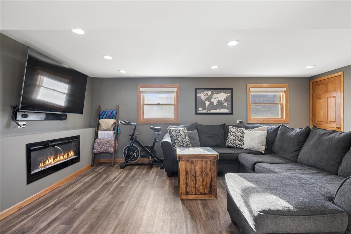 Move right in to this updated home in Glen Ellyn Countryside! Tons of natural light with Anderson windows! Main level has hardwood flooring in the kitchen and living room. Kitchen has updated stainless steel appliances, modern cabinets, island and sliders leading to a nice deck and beautiful view of the huge backyard with a shed. All 3 bedrooms have hardwood floors and plenty of closet space. Both bathrooms have been updated. Tons of space in the finished lower level with LVP flooring, built in cabinets and electric fireplace. Please exclude the vanity/cabinet system in bedroom 2 and beverage fridge. Updates include: HVAC 2020, water heater 2025, lower level bathroom remodel 2022, water softener 2020, sump pump 2024.