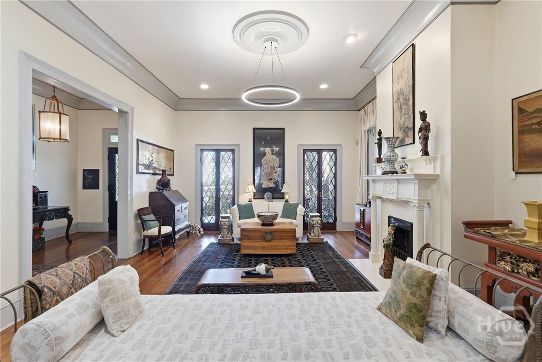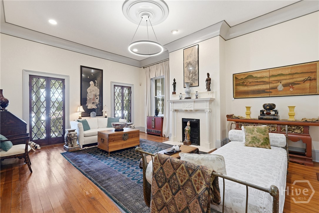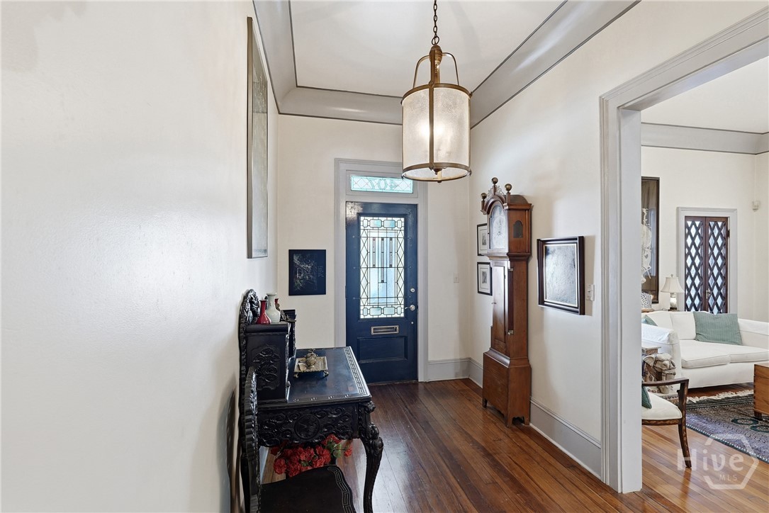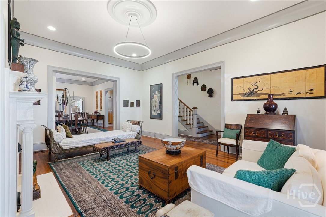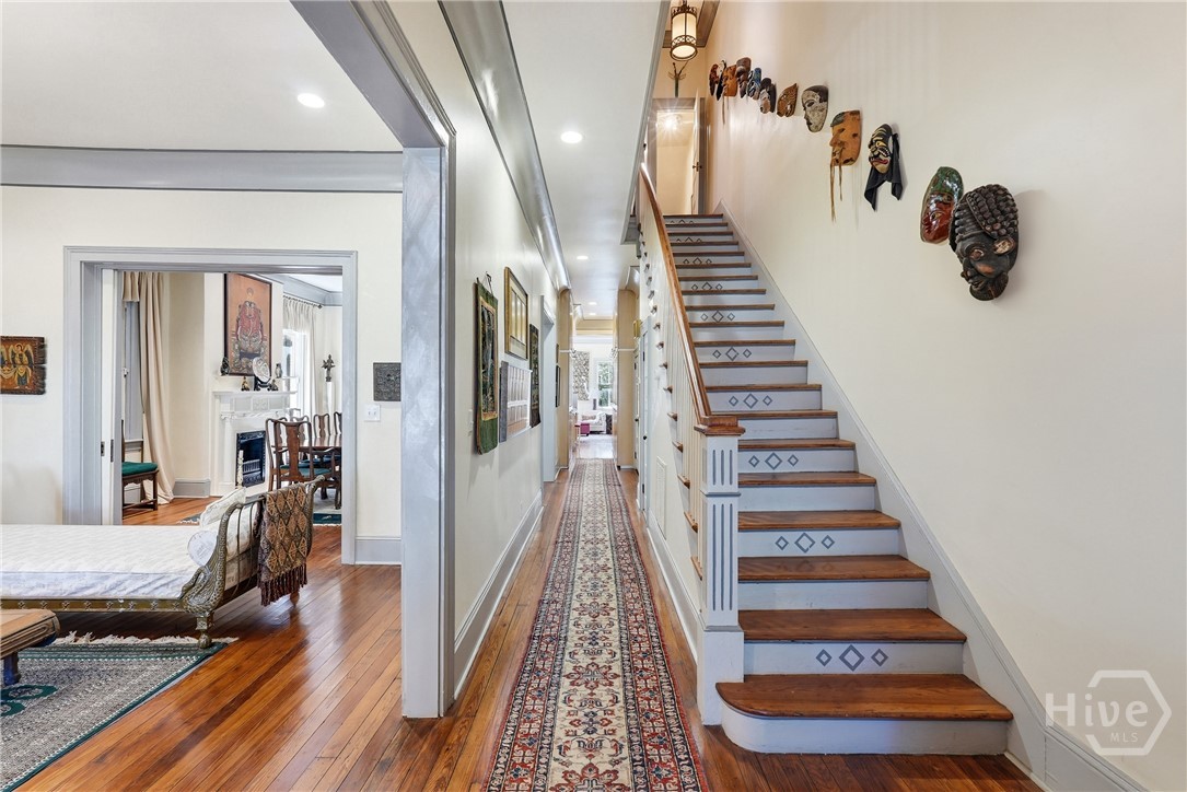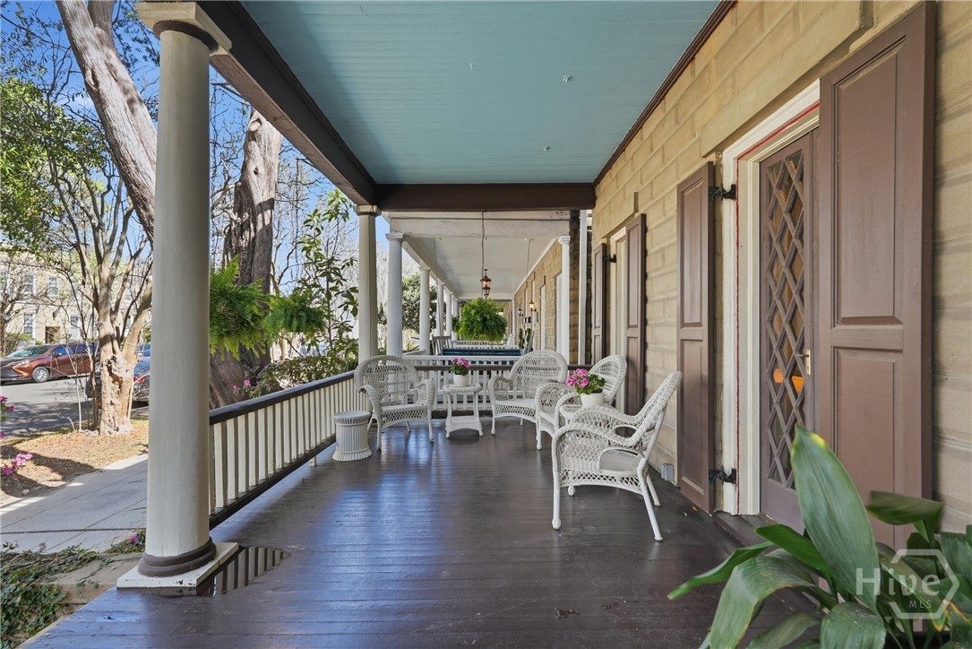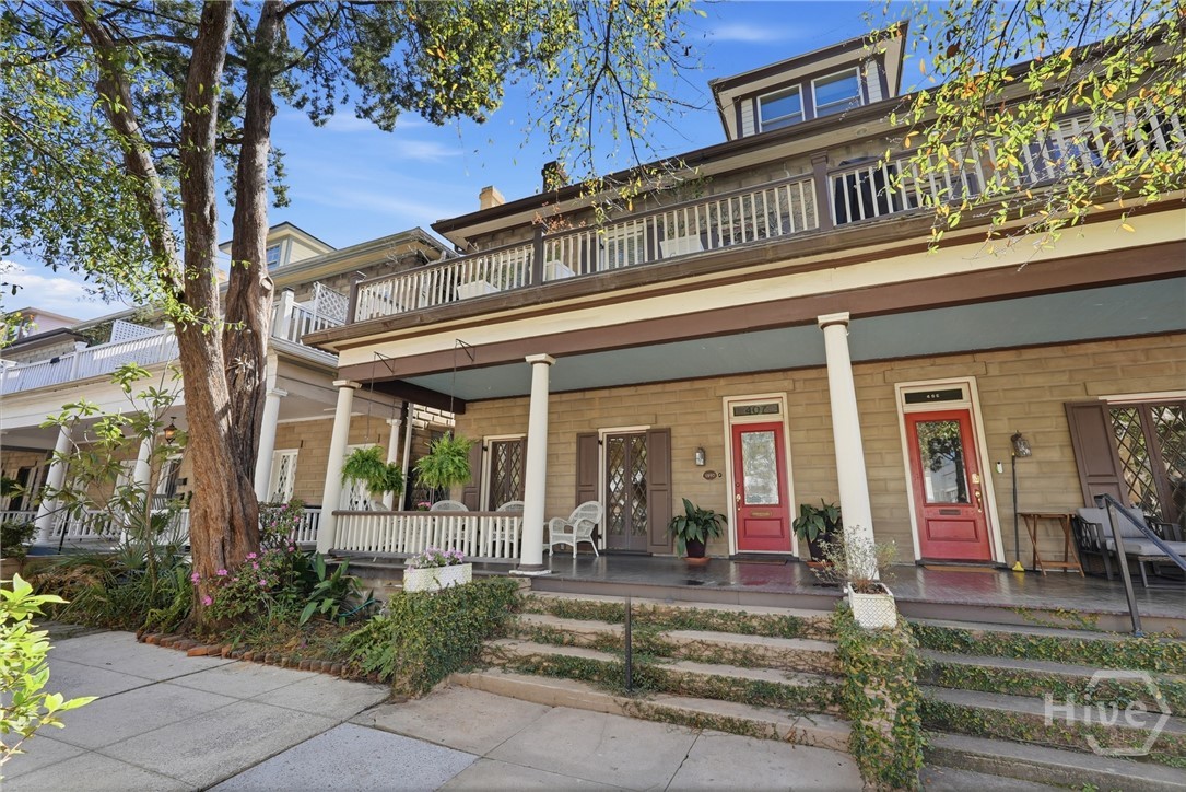 This circa 1892 Belgian block home embodies the essence of historic downtown living and has been meticulously maintained by the same owners for nearly 30 years. Step onto the inviting southern front porch and enter through a stunning glass front door into a gracious foyer. To the left, a spacious living room flows seamlessly into an elegant dining room, separated by impressive, fully functional pocket doors. Fireplaces in each room enhance the home's timeless charm. The kitchen offers abundant storage with custom built-ins and a center island, opening to a comfortable family room. Off of the family room, a large screened porch provides the perfect setting for relaxing or entertaining, overlooking a private, charming courtyard. Upstairs, the second floor features a truly one-of-a-kind office lined with built-in bookshelves and a custom ladder, along with access to a private open porch - ideal for enjoying the sun, lemon trees and views of the courtyard below. The primary suite is filled with natural light and includes a custom closet and an ensuite bath with a garden tub, separate shower, and double vanities. A second upper-level porch off the primary bedroom overlooks a beautiful magnolia tree and Hall Street. An additional bedroom and full bath complete this level. The third floor has been thoughtfully transformed into additional living space, featuring a bedroom, full bath, and a flexible living area with a Murphy bed. A two-car garage accessed from the courtyard or lane includes a 675-square-foot carriage house above - perfect for guests or as an income-producing rental. Tucked on a quiet residential street just moments from Forsyth Park, shopping, and all that downtown has to offer, this home is rich in character - from its original floors to its inviting outdoor spaces and historic windows. A rare opportunity and truly a must-see.