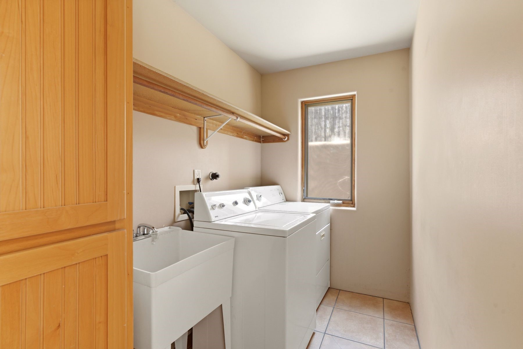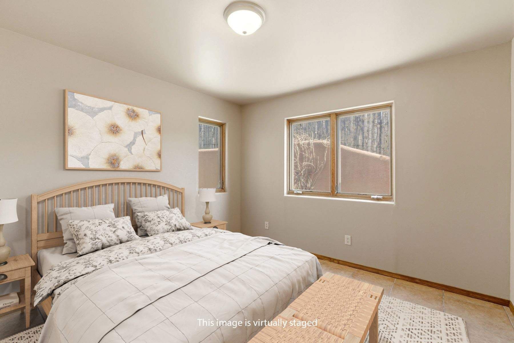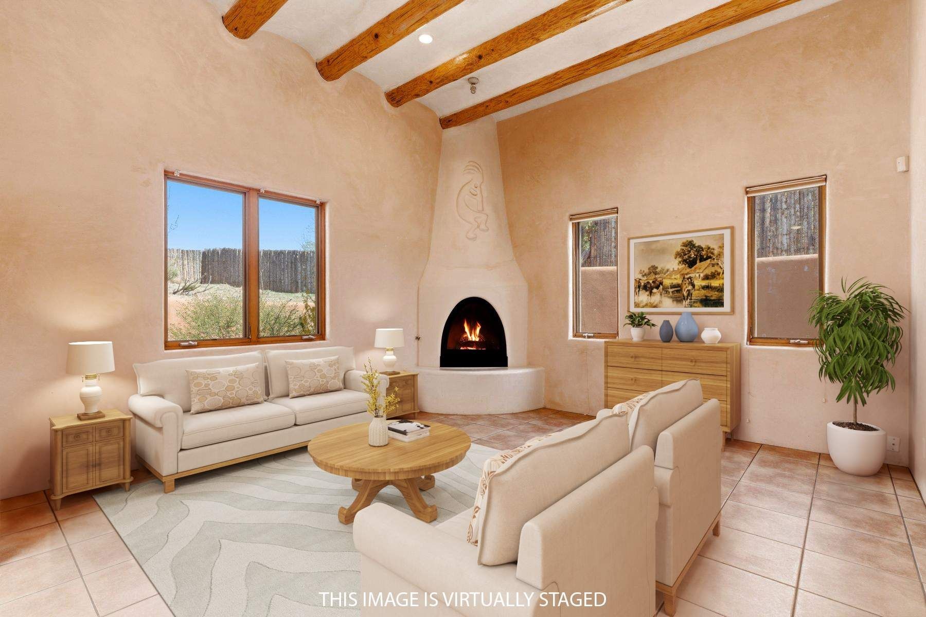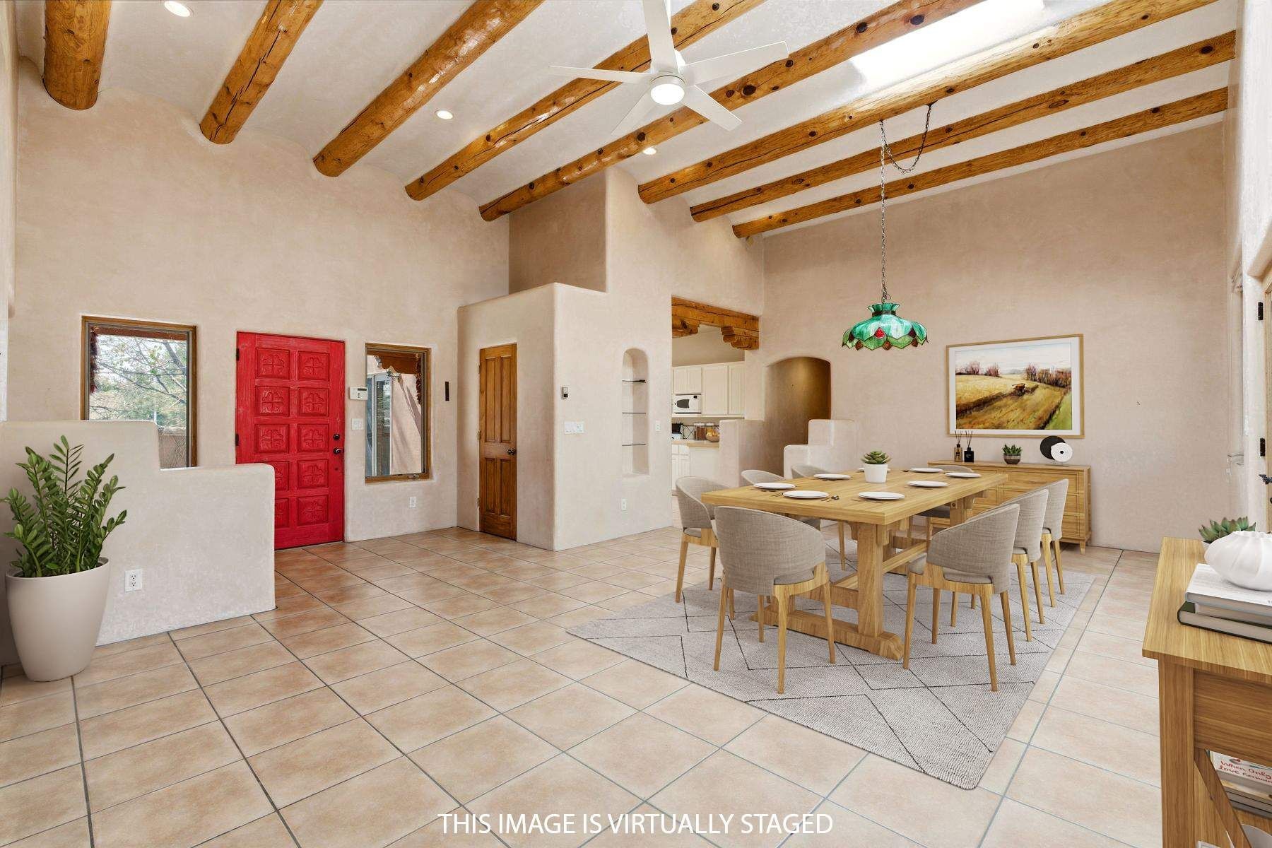 On a quiet, convenient in-town cul-de-sac, this light-filled three-bedroom Pueblo-style residence is a delightful oasis close to numerous services and conveniences. Coved ceilings, vigas and beams, decorative corbels, numerous skylights and casement windows, plaster walls, tile floors, serene earthy hues, and a kiva fireplace accented with a whimsical kokopelli contribute to the modern Southwestern ambience. The heart of the home is an expansive open-plan living and dining room with a soaring ceiling, built-in shelves, and double glass doors to the rear portal and patio. Nearby is a bright, cheerful kitchen with a sunny breakfast area that opens through sliding glass doors to an enchanting entry courtyard paved in flagstone. The owner’s suite—which opens to the backyard and includes dual closets and a spacious bath with a soaking tub and a shower—is well separated from the two guest bedrooms and their shared bath, creating welcome peace and privacy. One bedroom benefits from a private entrance, making it ideal for use as a home office. In the backyard, an alluring brick portal and multilevel patio encourage outdoor relaxation in the fresh Santa Fe air, with traditional coyote fencing providing welcome seclusion. Hunter Douglas blinds, a security system, in-floor radiant heating, evaporative cooling, a large laundry room with a sink and storage, and an insulated two-car garage are among the contemporary amenities.