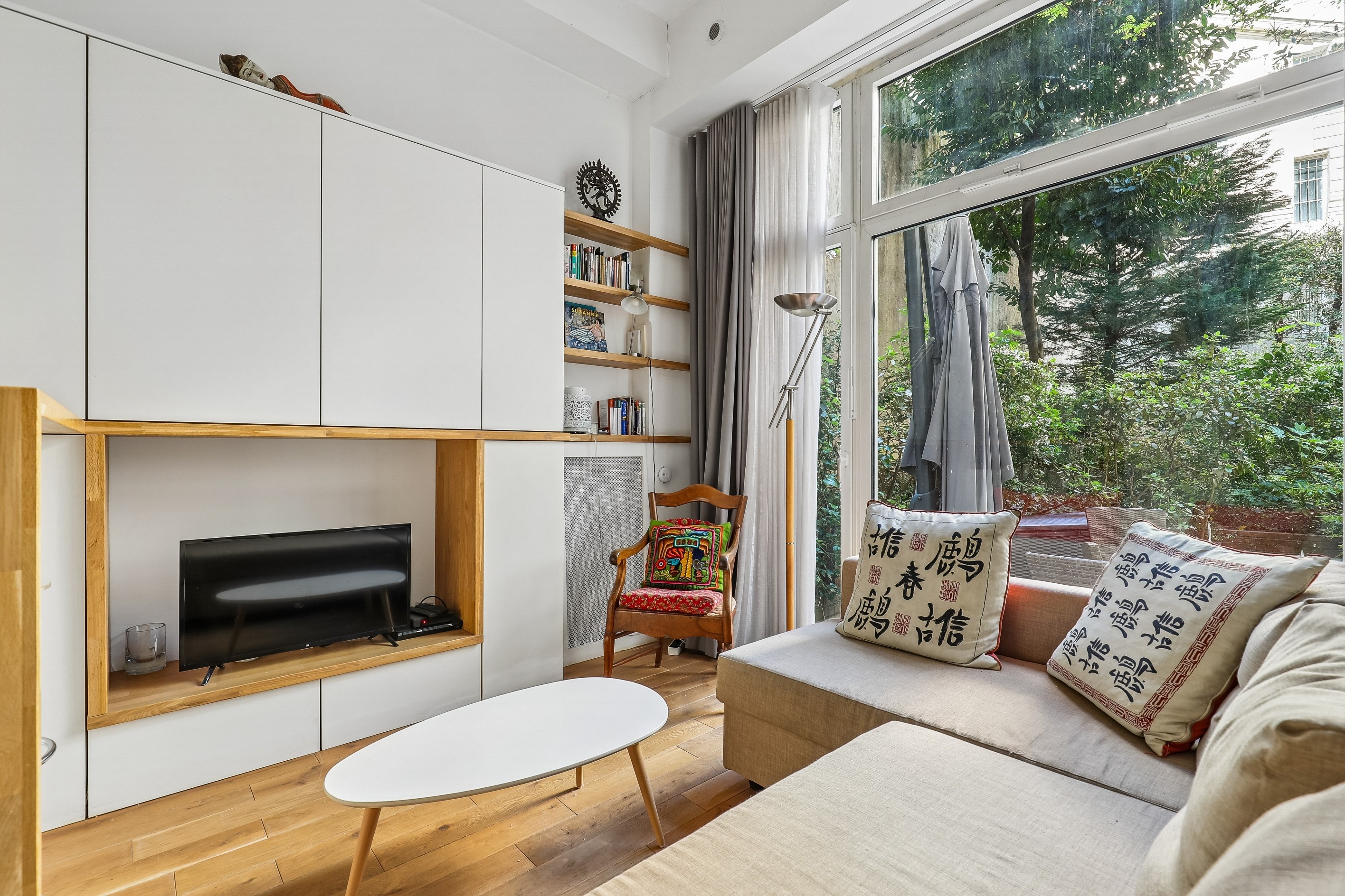 With a surface area of 30.92 sqm (Carrez law) and 43.70 sqm total floor space, this beautifully renovated loft opens seamlessly onto a 23 sqm private garden, offering absolute tranquility. The living area, enhanced by a 3.50-meter ceiling height, features a fully equipped open kitchen and a light-filled reception space with a large west-facing bay window. An elegant shower room with WC and ample built-in storage complete this level. Upstairs, a comfortable mezzanine hosts a perfectly optimized sleeping area. Cellar. A unique, private and luminous property, designed for a discerning clientele seeking refinement and serenity in the heart of Paris.