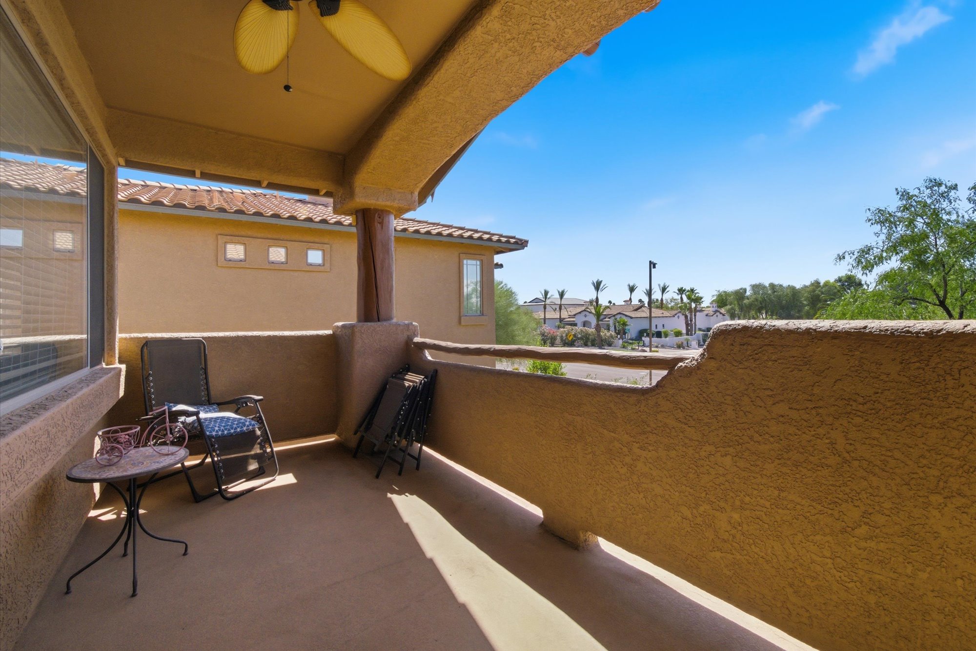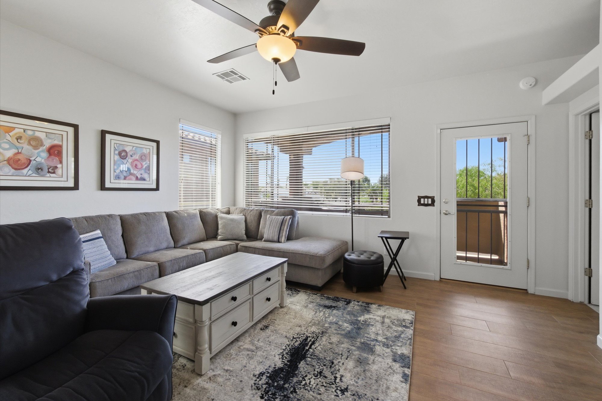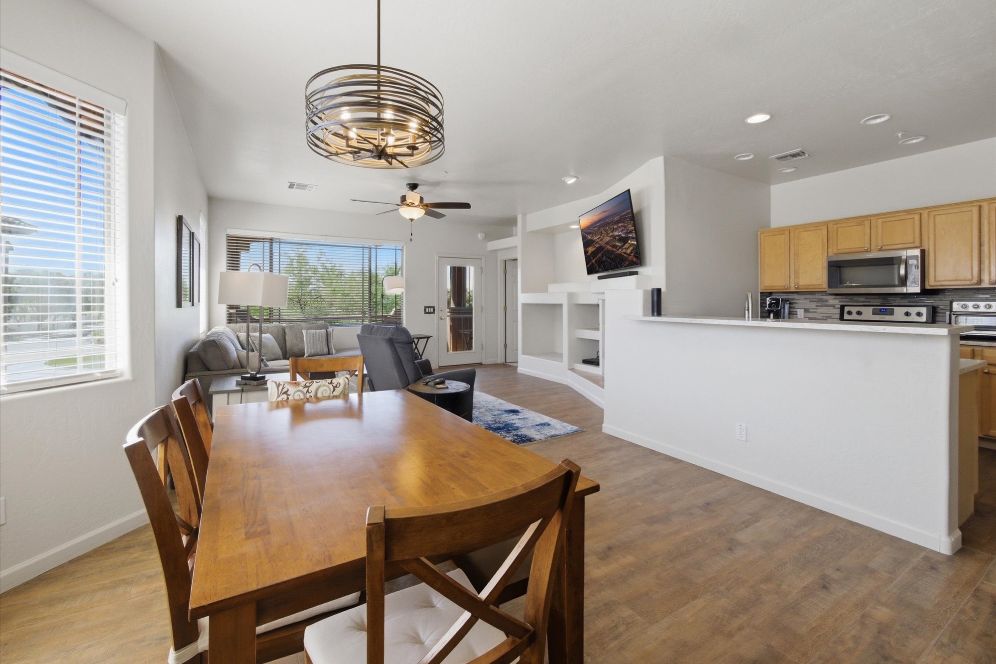 Enjoy a vibrant resort lifestyle in this beautifully appointed end unit home that comes fully furnished, offering an effortless move-in experience. Step inside to discover an inviting open-concept layout featuring a spacious living room with a cozy fireplace, a dedicated dining area, and a well-equipped kitchen boasting light wood cabinetry, stainless steel appliances, and a stylish tiled backsplash. Enjoy modern finishes throughout, including elegant wood-look flooring, updated bathrooms and contemporary lighting. Relax and take in the stunning mountain views from your private balcony, perfect for enjoying the Arizona sunshine. The Spanish architectural style adds to the charm, complementing the picturesque surroundings. Residents also enjoy access to the refreshing community pool & spaThe community has a small fitness center, a clubhouse. The clubhouse can be used for small gatherings. There are many grills throughout the complex.