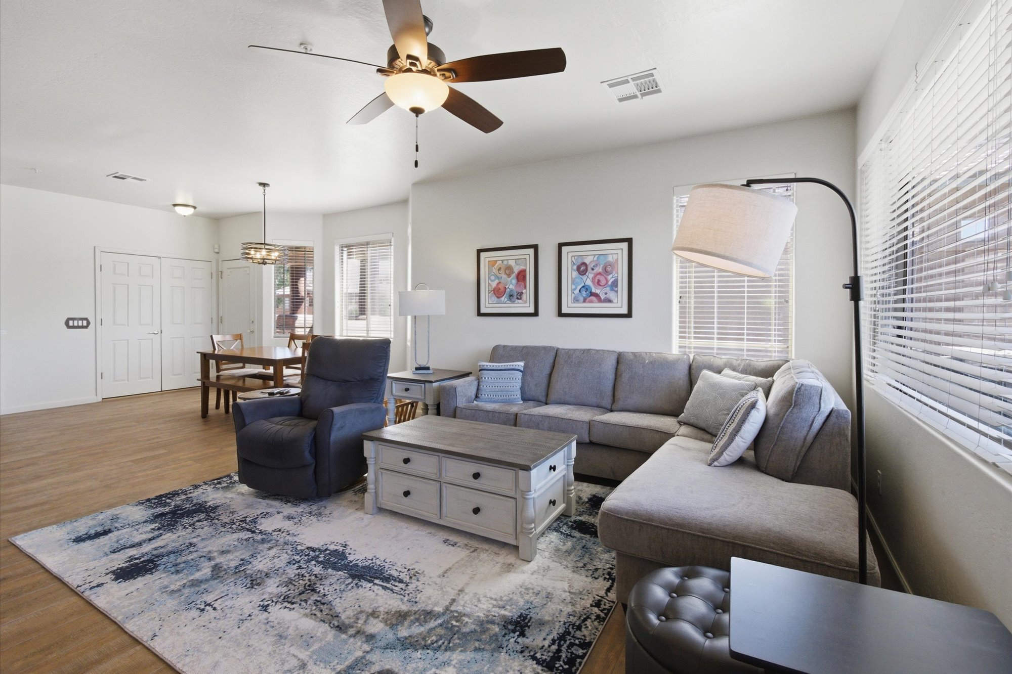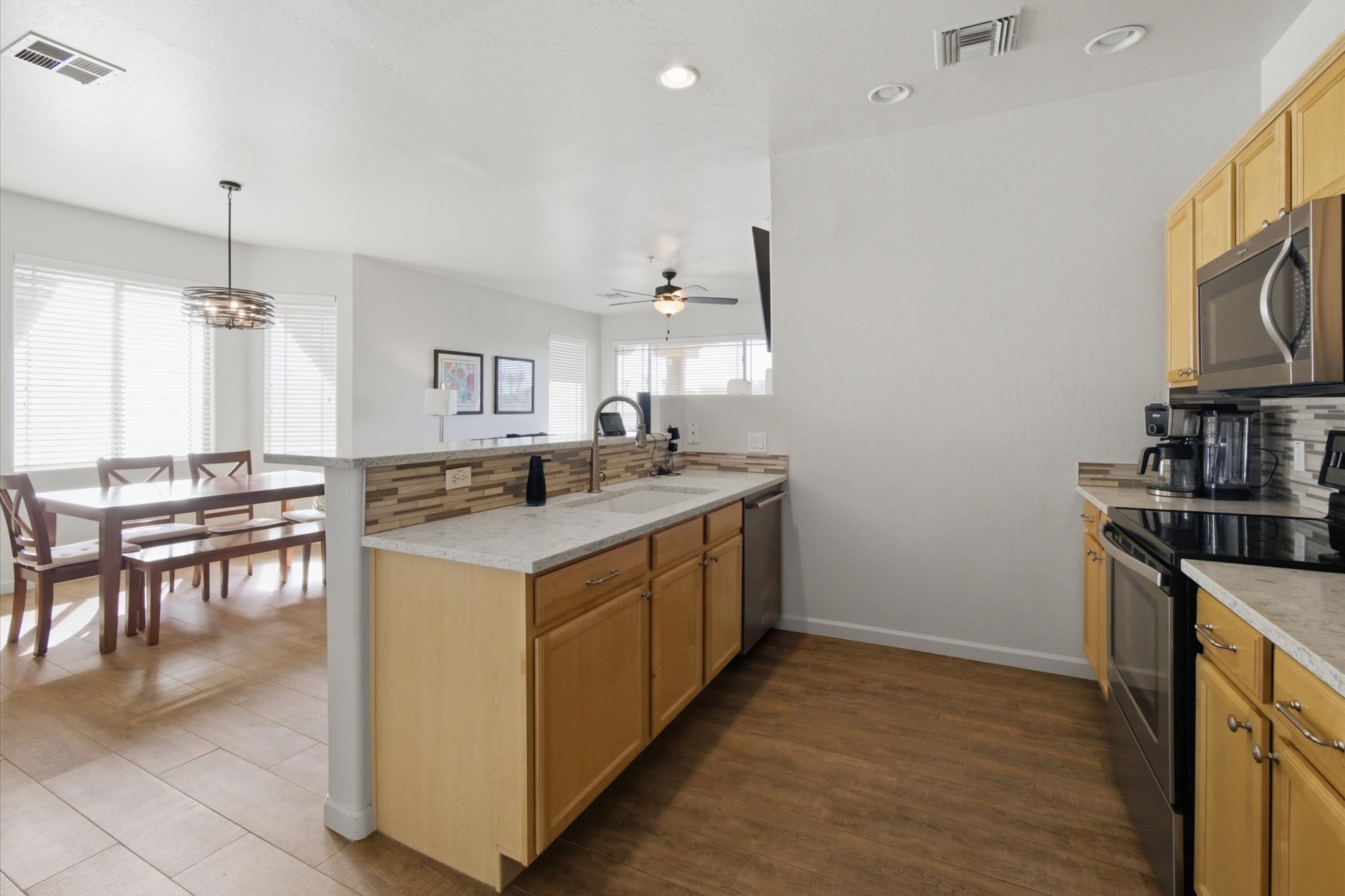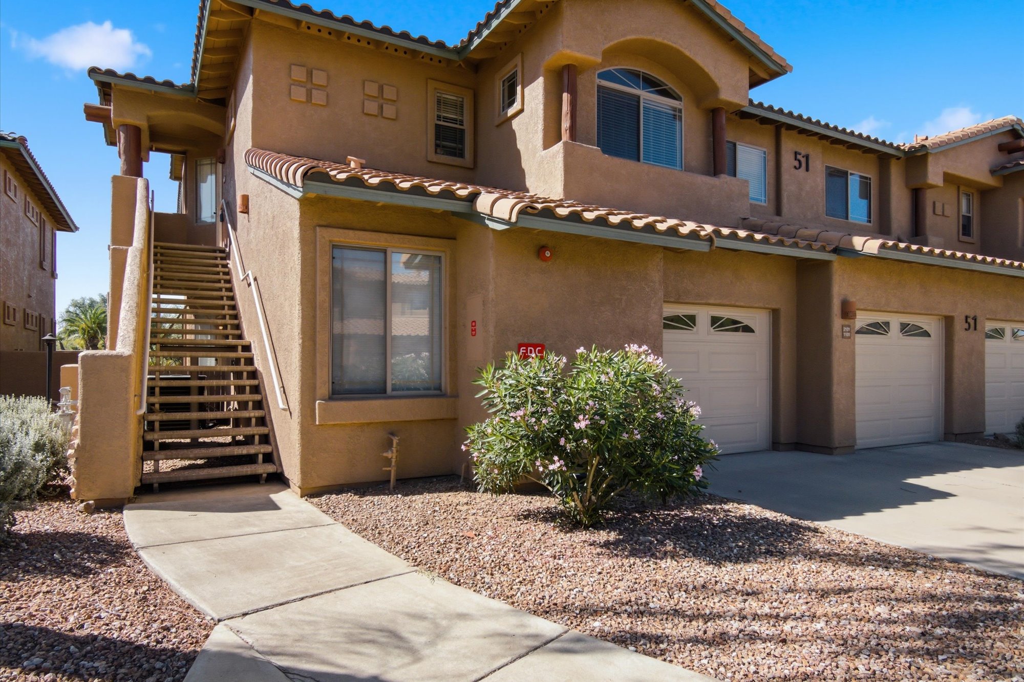 Enjoy a vibrant resort lifestyle in this beautifully appointed end unit home that comes fully furnished, offering an effortless move-in experience. Step inside to discover an inviting open-concept layout featuring a spacious living room with a cozy fireplace, a dedicated dining area, and a well-equipped kitchen boasting light wood cabinetry, stainless steel appliances, and a stylish tiled backsplash. Enjoy modern finishes throughout, including elegant wood-look flooring, updated bathrooms and contemporary lighting. Relax and take in the stunning mountain views from your private balcony, perfect for enjoying the Arizona sunshine. The Spanish architectural style adds to the charm, complementing the picturesque surroundings. Residents also enjoy access to the refreshing community pool & spaThe community has a small fitness center, a clubhouse. The clubhouse can be used for small gatherings. There are many grills throughout the complex.