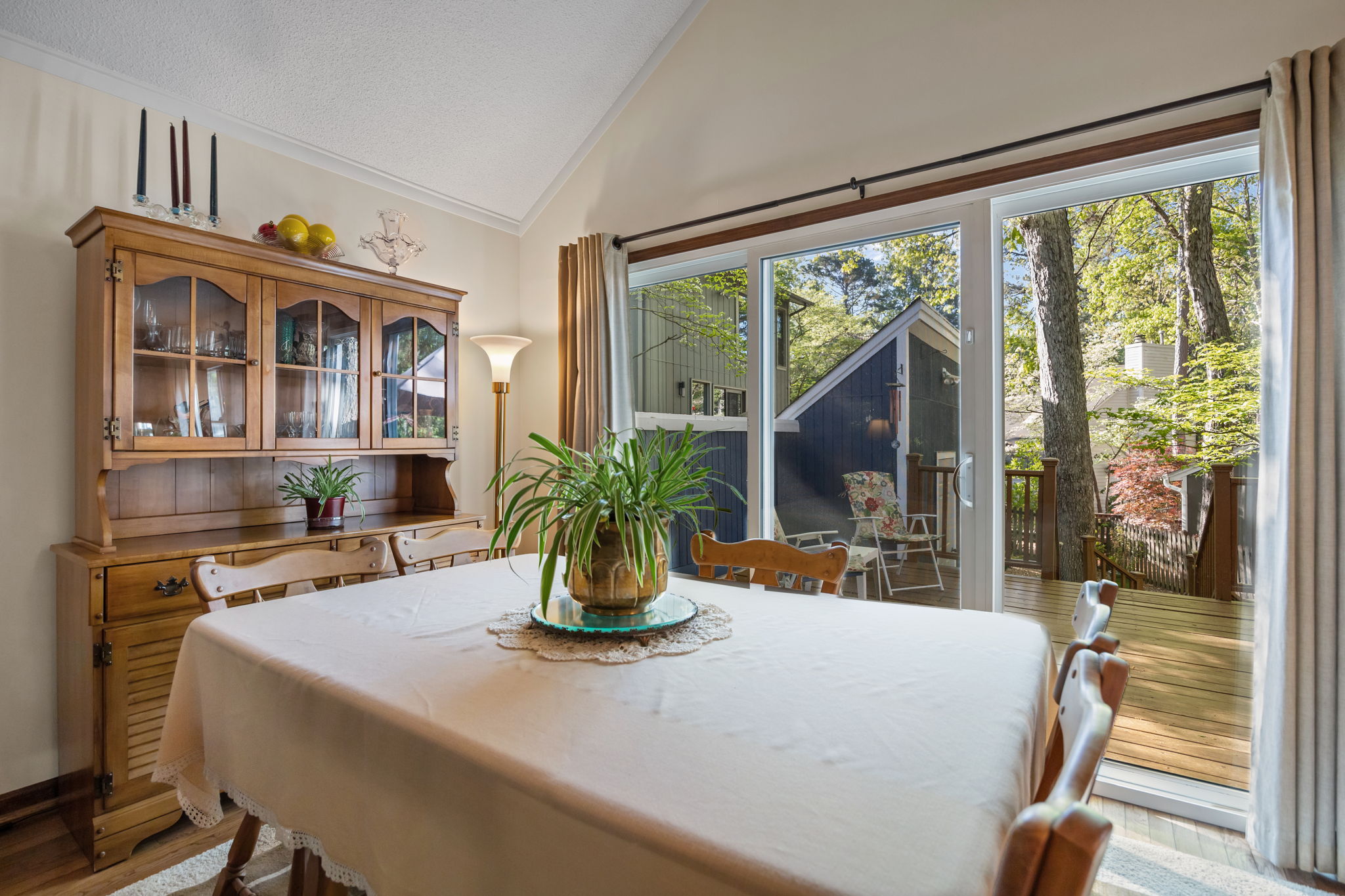 This two-bedroom, two-and-a-half-bath home features a spacious main-level primary bedroom designed for easy everyday living. Tucked away in the Rue Sans Famille neighborhood, it offers a private feel while staying close to it all. The fenced backyard includes a deck and storage shed, extending your living space outdoors. An unfinished walk-in floored attic provides excellent storage. The location offers quick access to Lake Boone Road, with shopping, dining, and daily conveniences just minutes away.