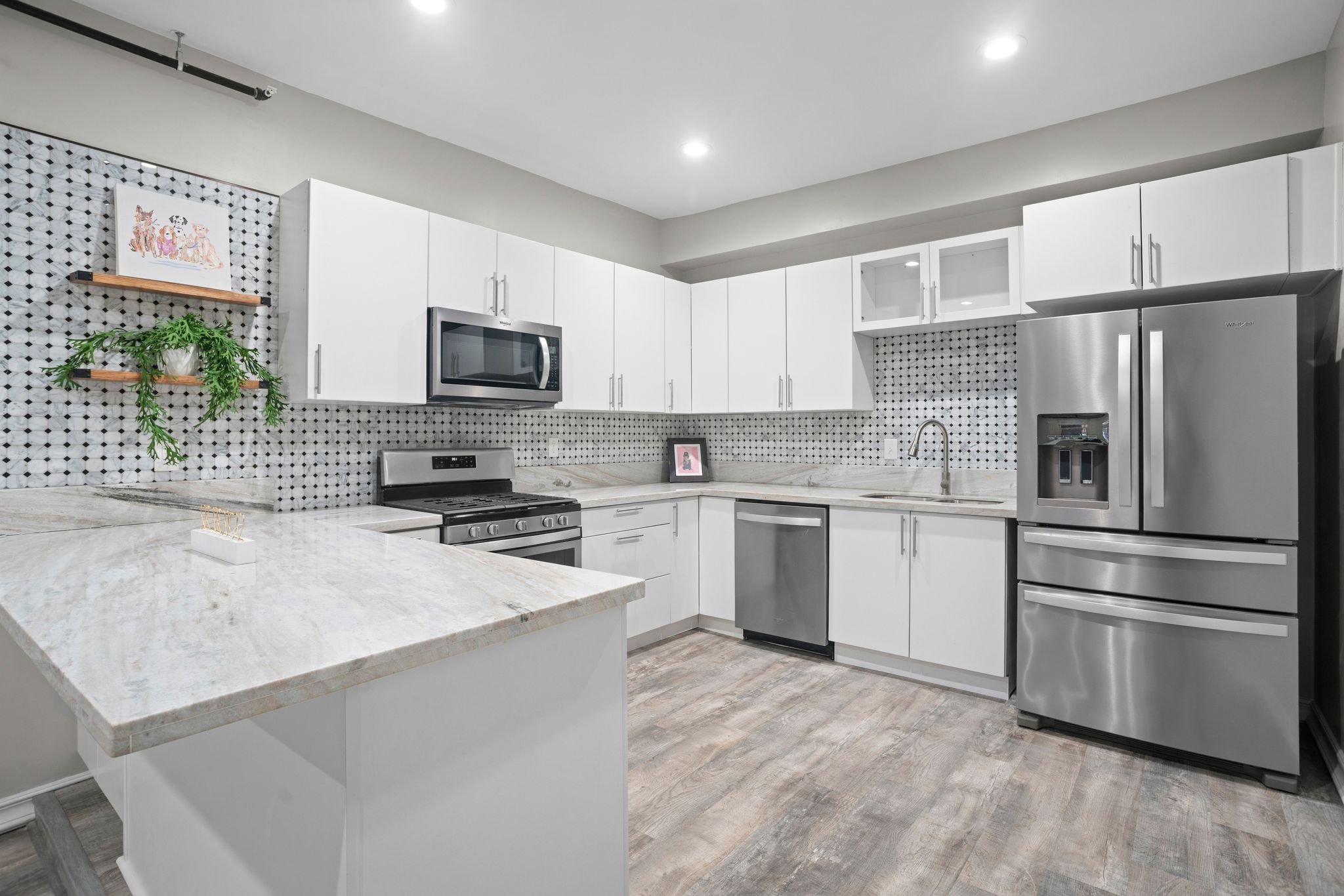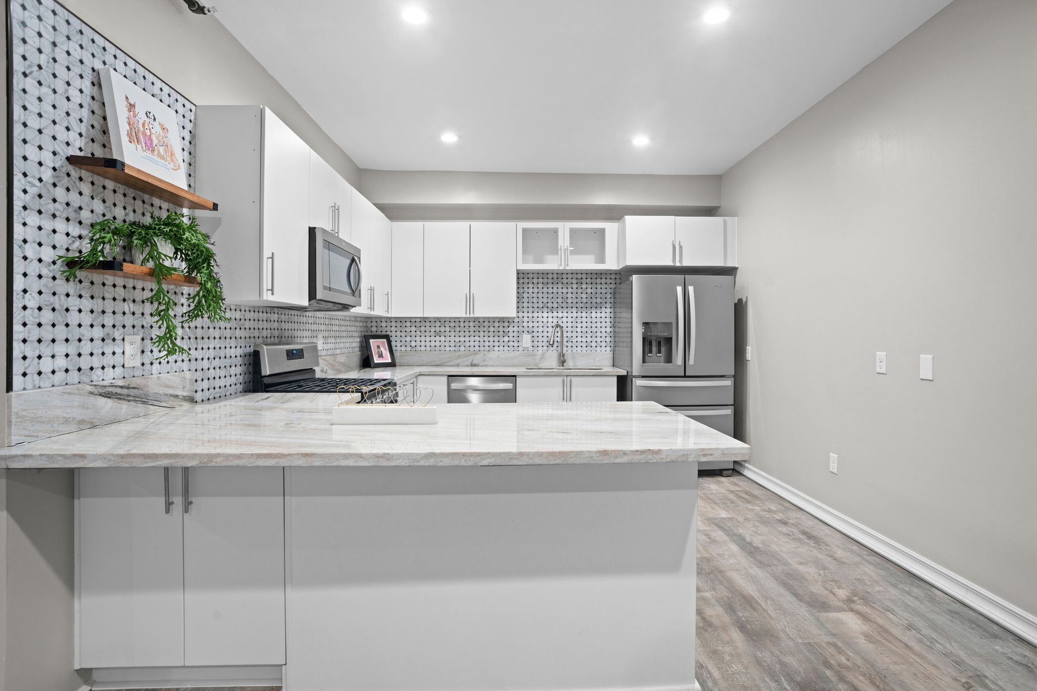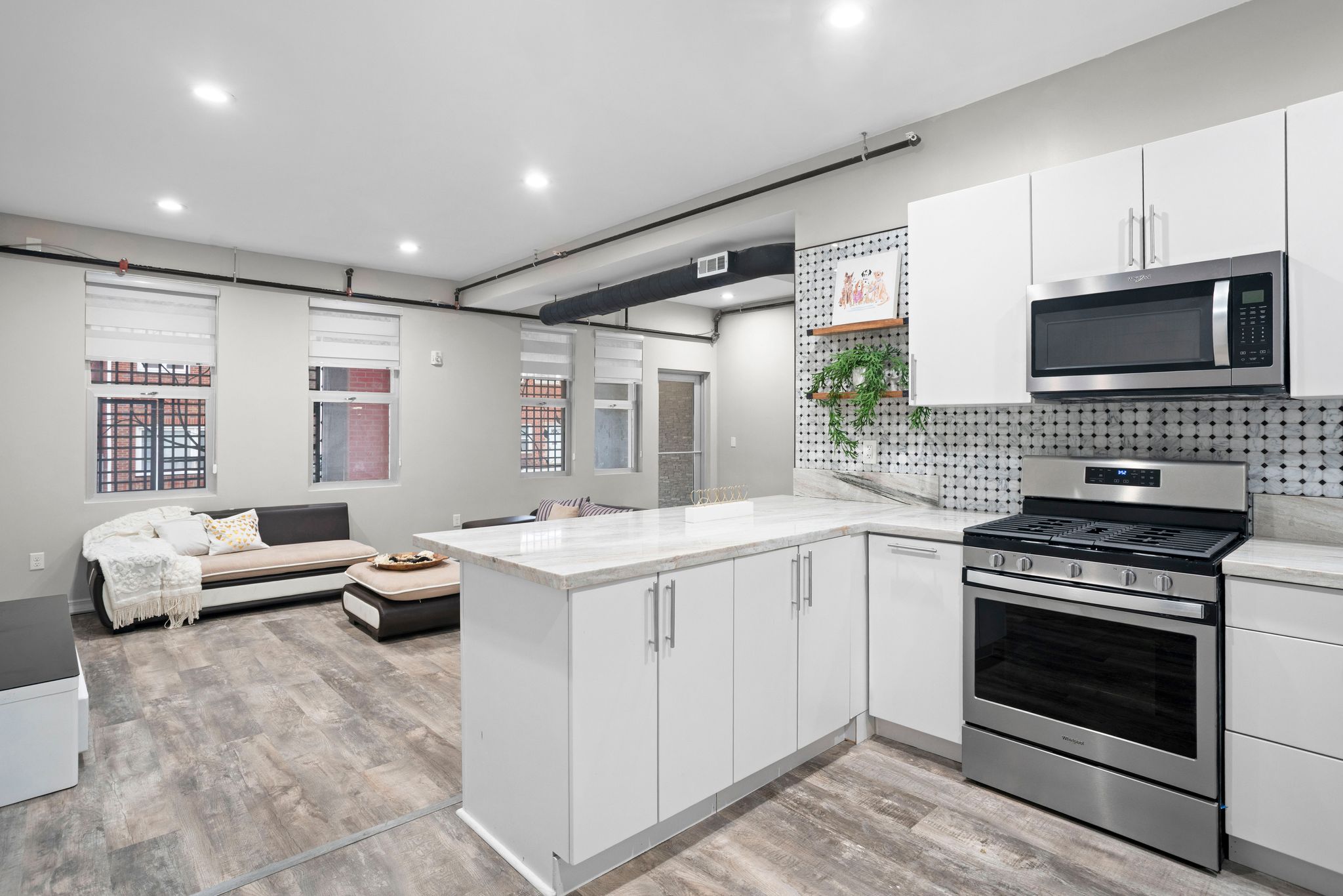 Welcome to this beautifully renovated one-bedroom, one-bath condo in Pittsburgh’s vibrant South Side neighborhood. This stylish unit features a bright, open-concept layout with modern industrial touches, including exposed 10-ft ceilings, recessed lighting, and sleek luxury vinyl plank flooring throughout. The contemporary kitchen is a true highlight, offering ample cabinetry, stainless steel appliances, quartz-style countertops, a custom backsplash, and seating—perfect for entertaining or casual dining. The spacious living area flows seamlessly from the kitchen and is filled with natural light from oversized windows. The bedroom is generously sized with ample closet space and room for a king bed and a sitting area. The spa-inspired bathroom boasts a glass-enclosed walk-in shower with a marble tiled bench seat, modern fixtures, and an LED mirror above the vanity. Additional features include in-unit laundry and a private gated porch to enjoy the outdoors. Located just steps from South Side’s restaurants, shops, nightlife, and riverfront trails, with easy access to downtown and major roadways. Move-in ready and full of style—this is urban living at its best.