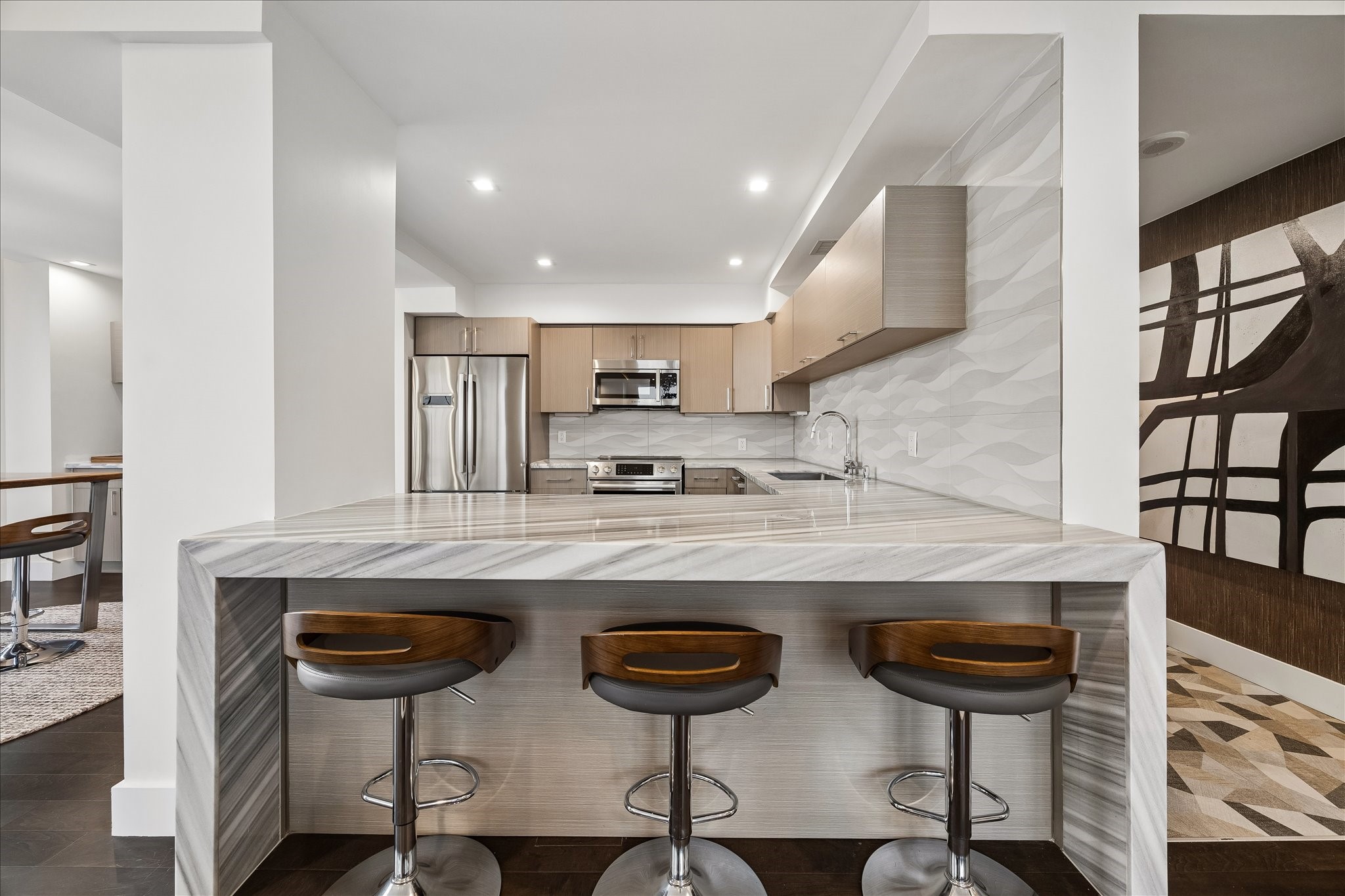 Fully renovated and spacious corner residence with designer finishes offering open concept living. Floor to ceiling windows, recessed and cove lighting, hardwood floors. Gourmet kitchen with marble counters, custom cabinetry and stainless appliances. Primary suite with walk-in closet and luxurious bathroom with double sinks, vanity and oversized seamless glass shower. Spacious second bedroom and hall bathroom with designer tile, custom cabinetry and marble counters. Walk-in laundry room with generous storage. Private balcony with panoramic Southeast views of Greenway Plaza and the Texas Medical Center skyline. Full service high rise living with doorman, valet, porter, 24 hour security and heated pool. Convenient location within close proximity to shopping, dining, the Texas Medical Center, Downtown and the Galleria.