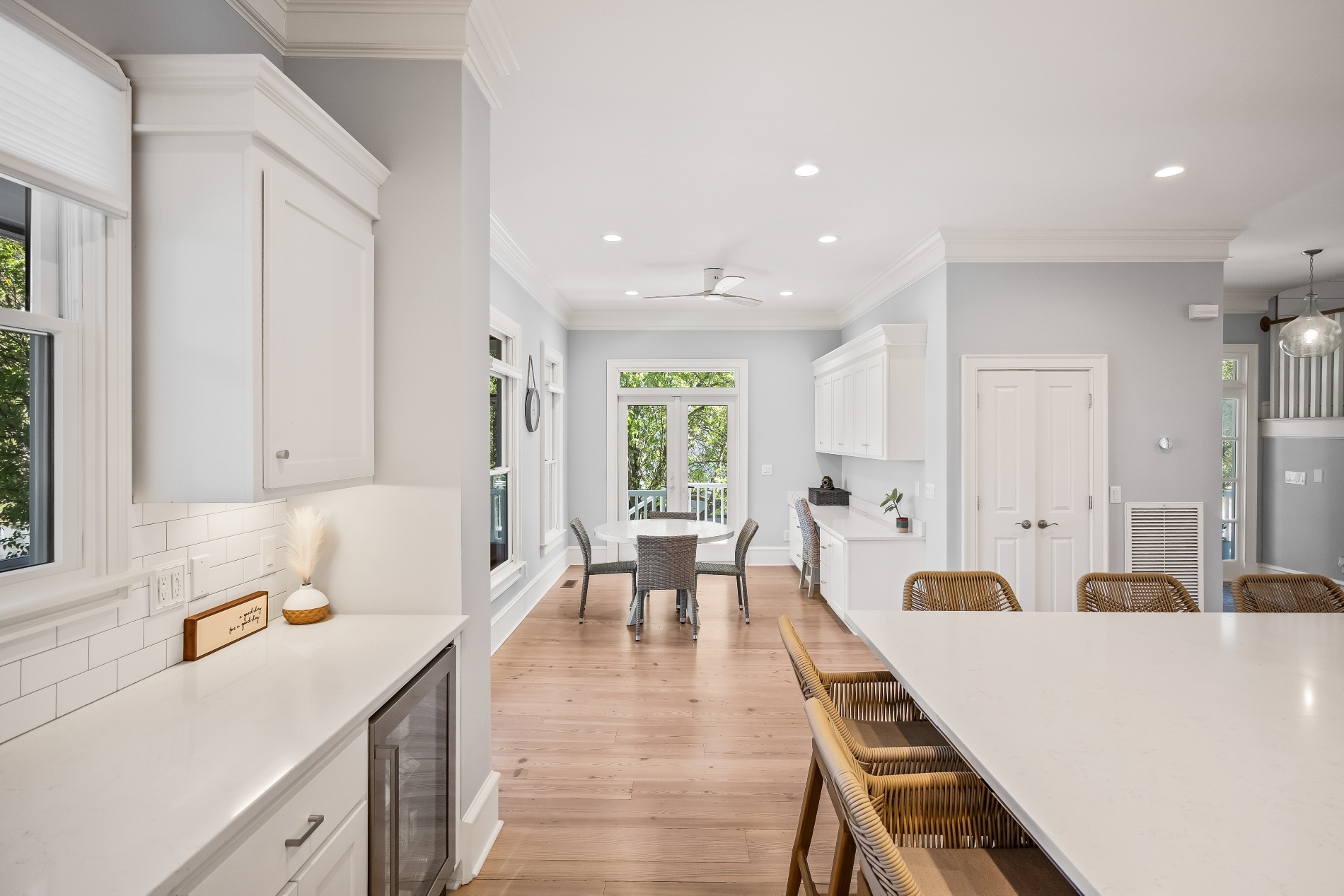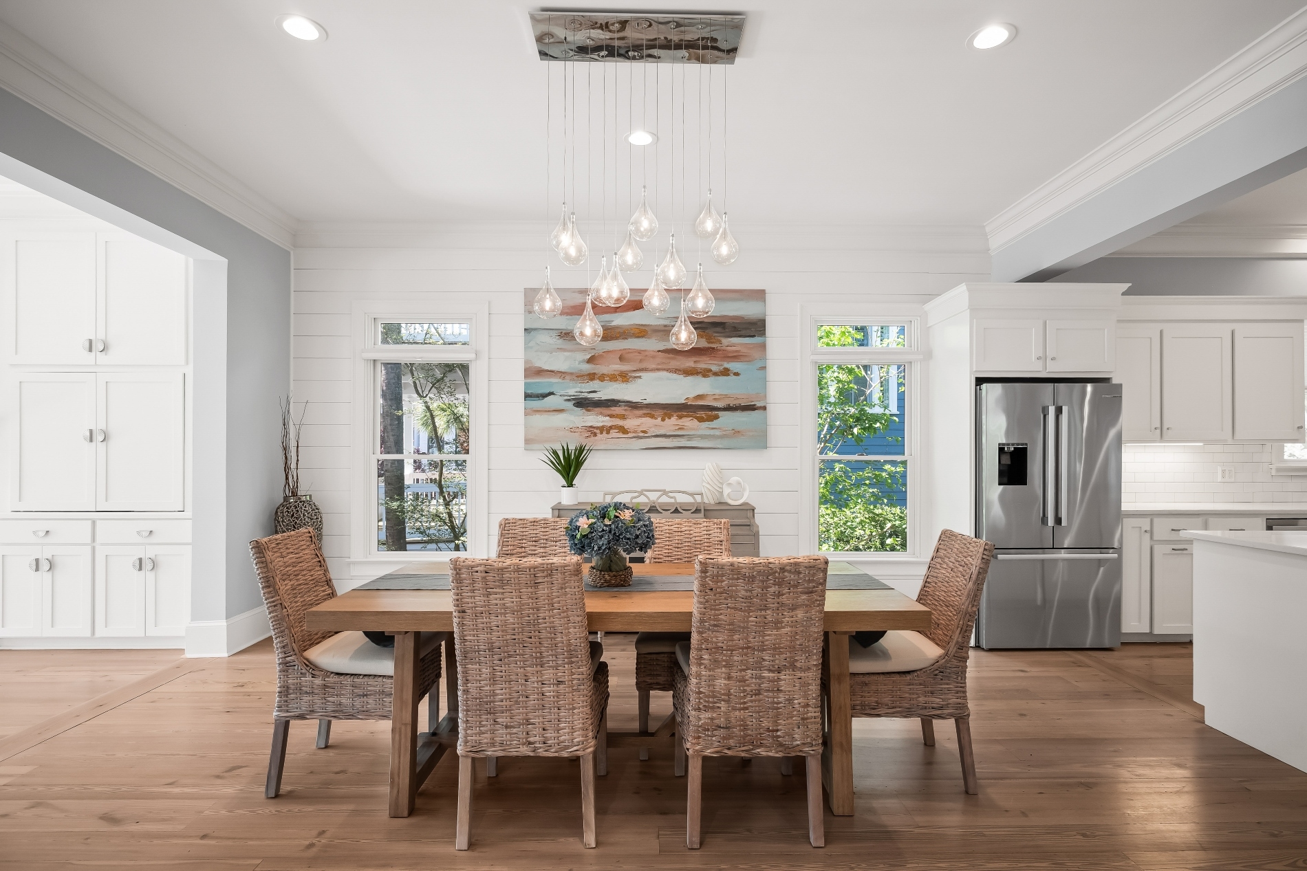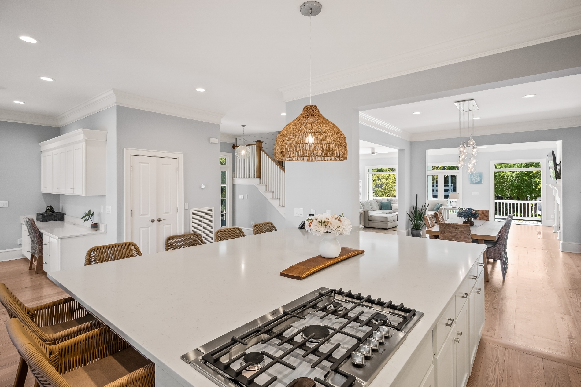 Since 2022, the owners have completed significant improvements. Walls were removed and beams installed to create a seamless connection between the kitchen, dining, and living areas, where natural light pours in through the large windows, highlighting the elegant heart pine flooring and shiplap accents. The result is a main floor that feels open and cohesive. A wood-burning fireplace, surrounded by built-in bookshelves, anchors the living room, creating a natural gathering point suited for both quiet evenings and larger gatherings. French doors line the room and open onto the wrap-around porches - the kind of detail that makes this home feel distinctly Lowcountry. The kitchen was remodeled with an oversized custom island, quartz countertops, and additional cabinetry (including a secret hideaway for the kids). While everything flows together, the space is thoughtfully defined - a breakfast nook with a built-in desk supports everyday living, while the formal dining area provides a refined setting. Just off the kitchen, a large screened-in porch overlooks the pool, hot tub, and tranquil pond.