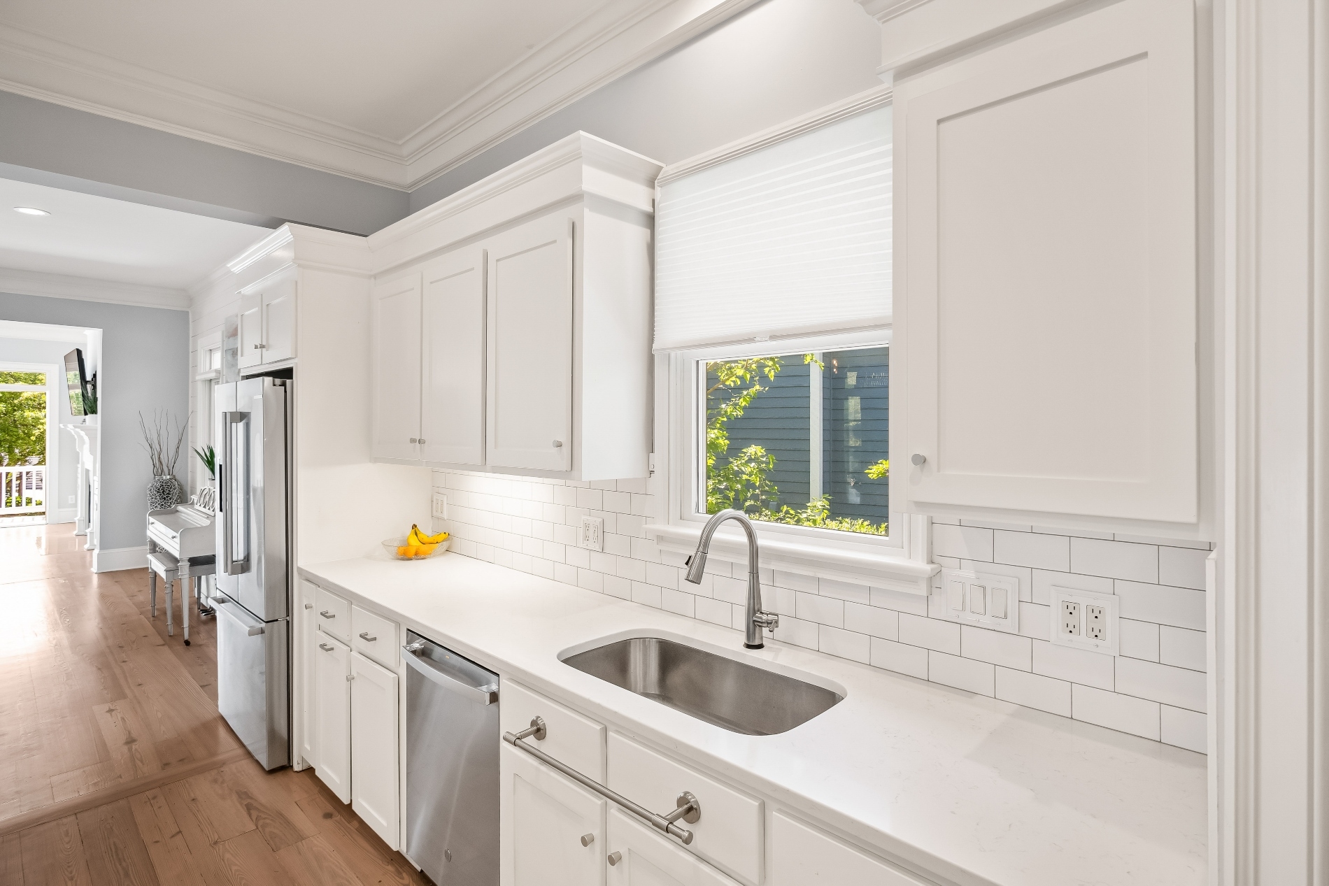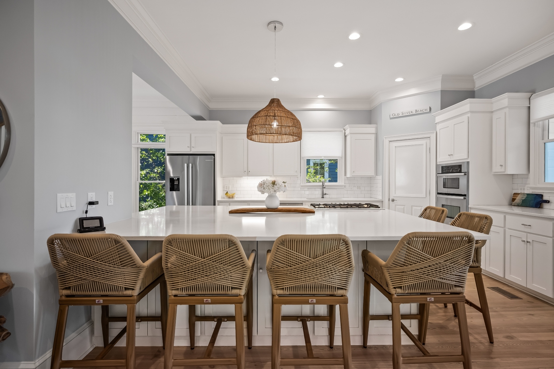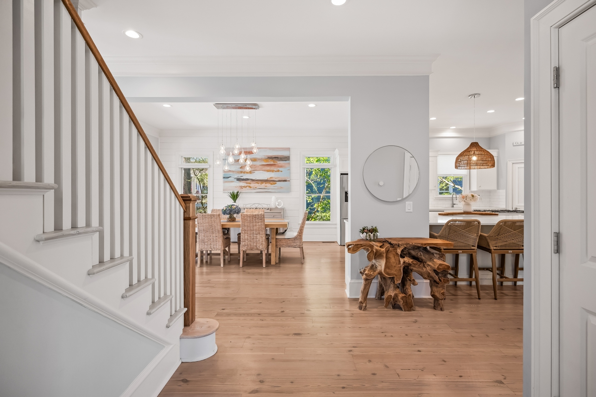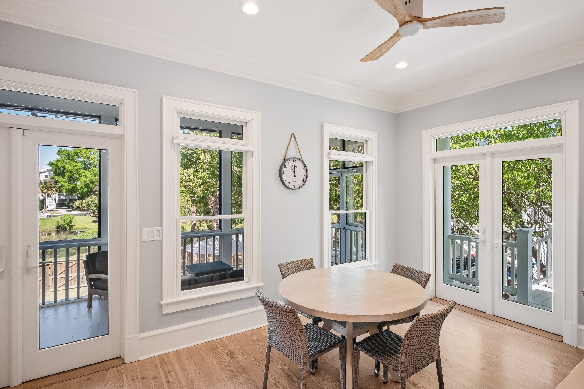 Since 2022, the owners have completed significant improvements. Walls were removed and beams installed to create a seamless connection between the kitchen, dining, and living areas, where natural light pours in through the large windows, highlighting the elegant heart pine flooring and shiplap accents. The result is a main floor that feels open and cohesive. A wood-burning fireplace, surrounded by built-in bookshelves, anchors the living room, creating a natural gathering point suited for both quiet evenings and larger gatherings. French doors line the room and open onto the wrap-around porches - the kind of detail that makes this home feel distinctly Lowcountry. The kitchen was remodeled with an oversized custom island, quartz countertops, and additional cabinetry (including a secret hideaway for the kids). While everything flows together, the space is thoughtfully defined - a breakfast nook with a built-in desk supports everyday living, while the formal dining area provides a refined setting. Just off the kitchen, a large screened-in porch overlooks the pool, hot tub, and tranquil pond.