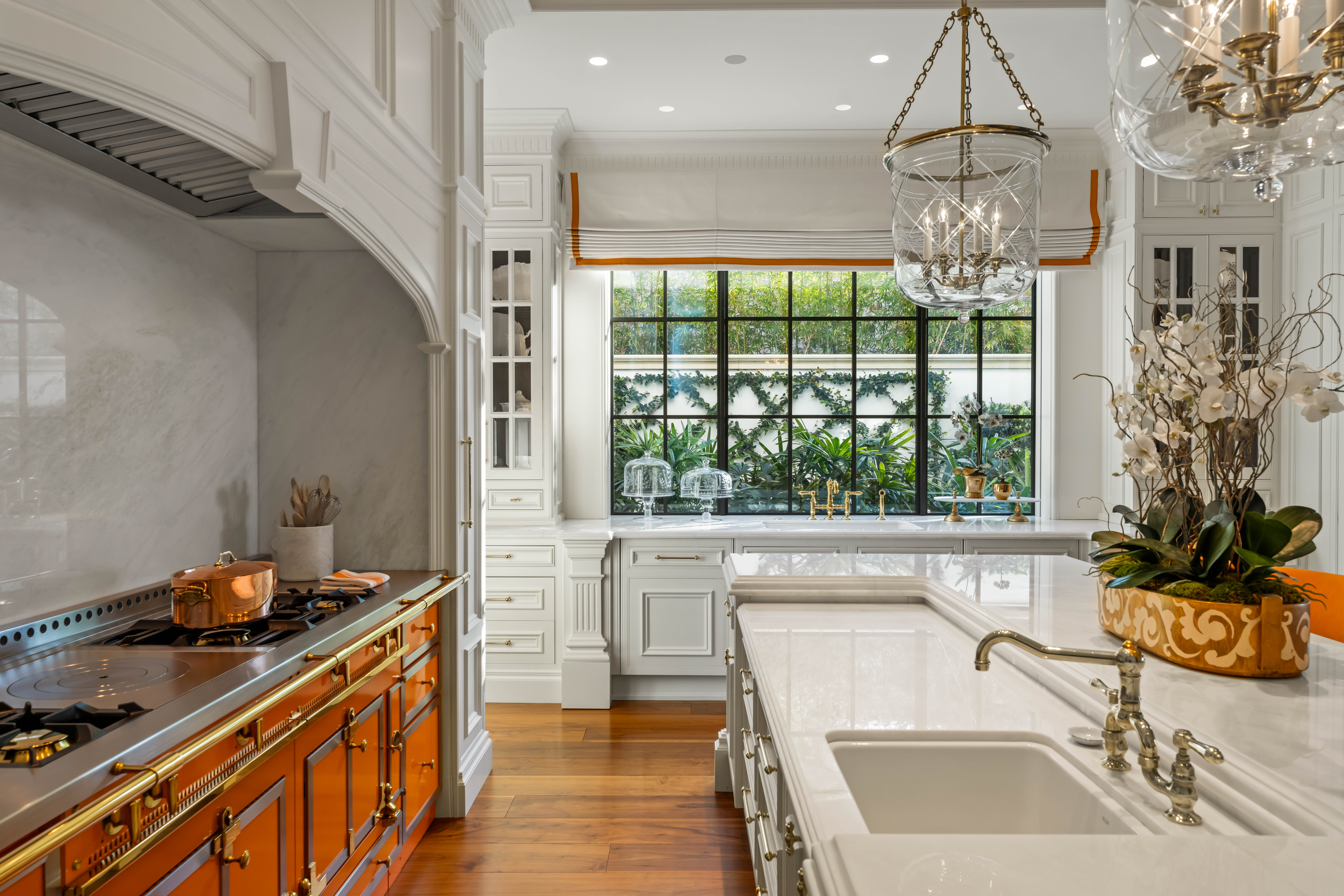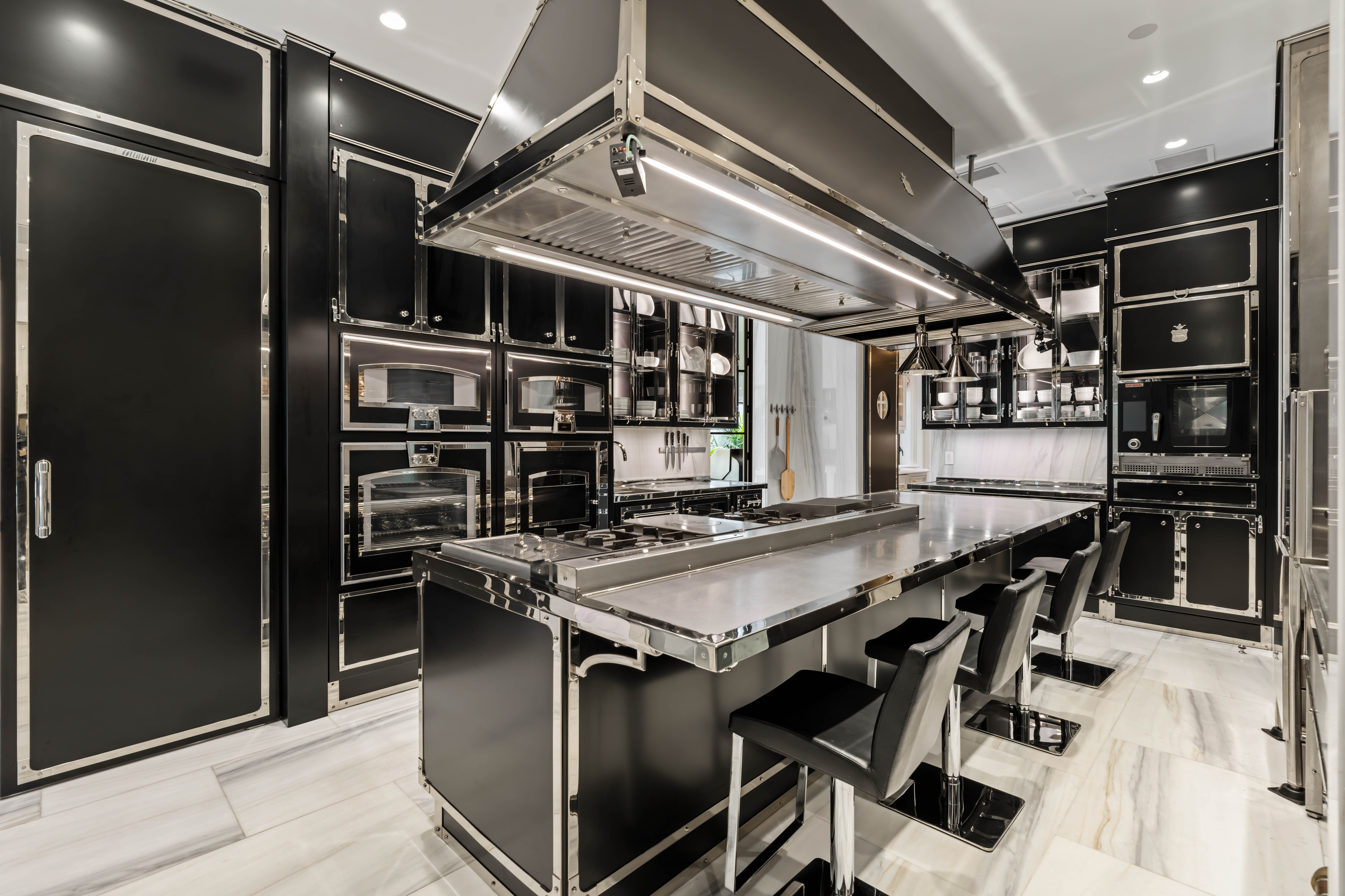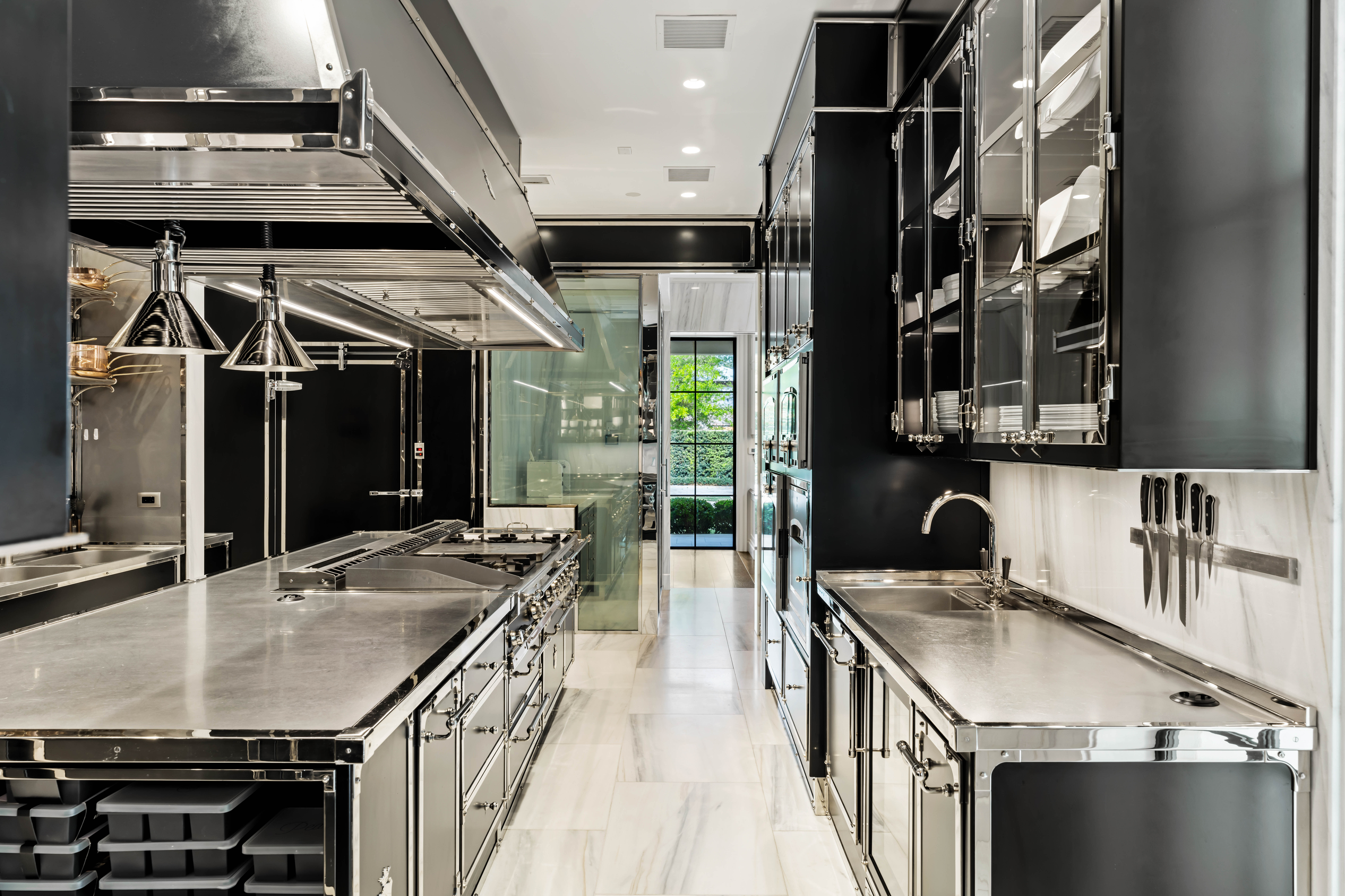 The primary kitchen is anchored by a La Cornue range and complemented by a professional-grade chef’s kitchen by Officine Gullo, custom-built on site with walk-in refrigeration, dedicated prep areas, and an adjacent chef’s office.