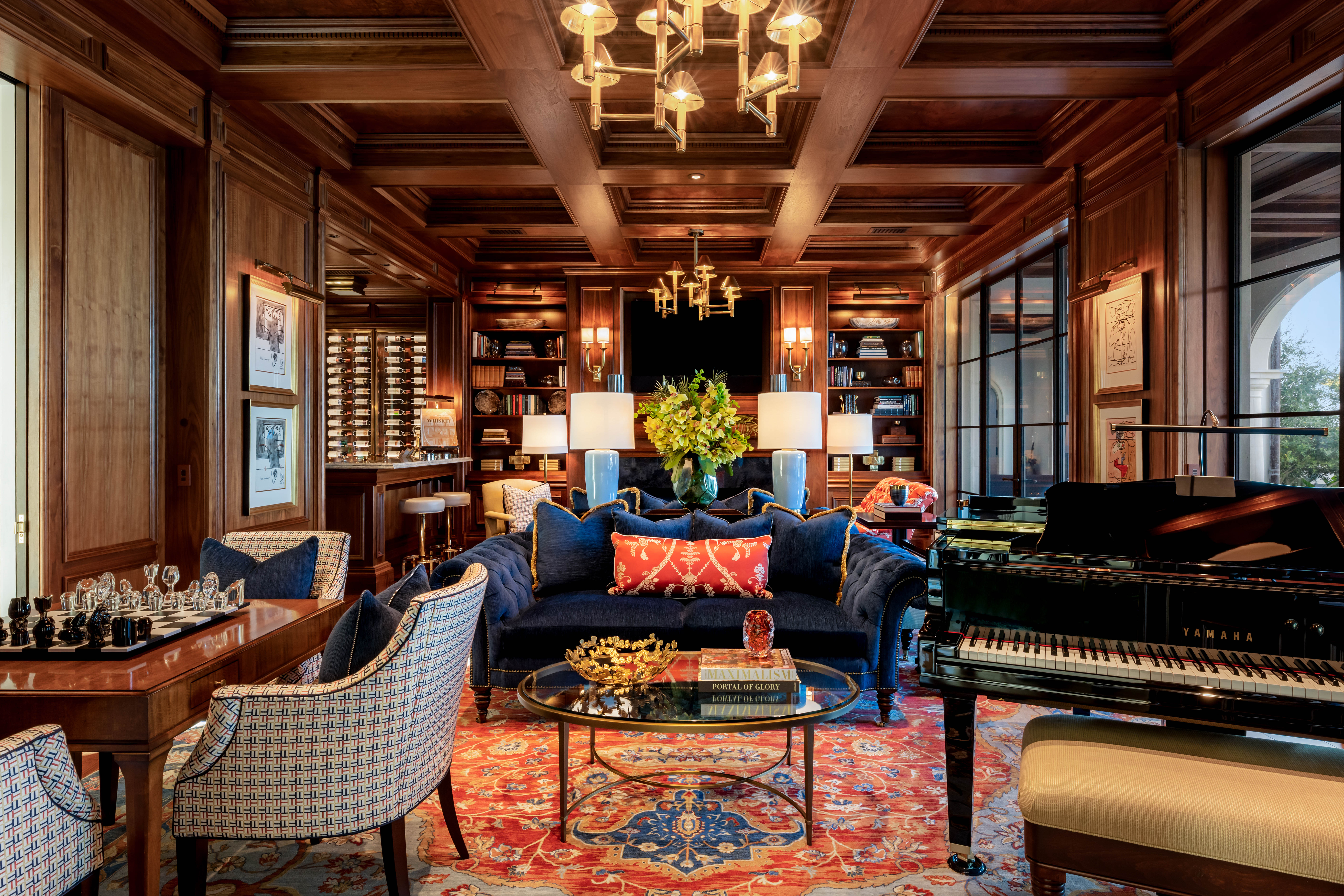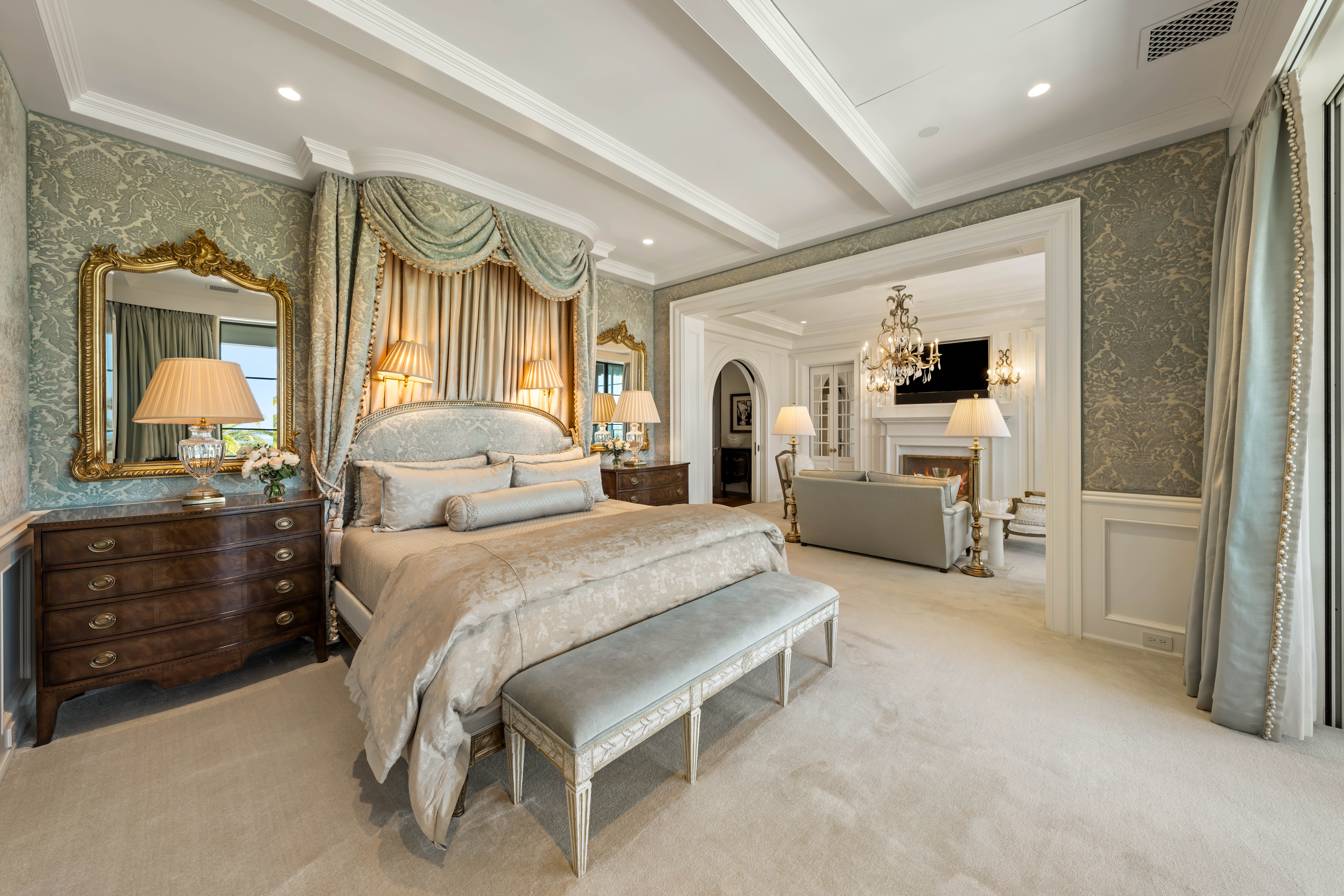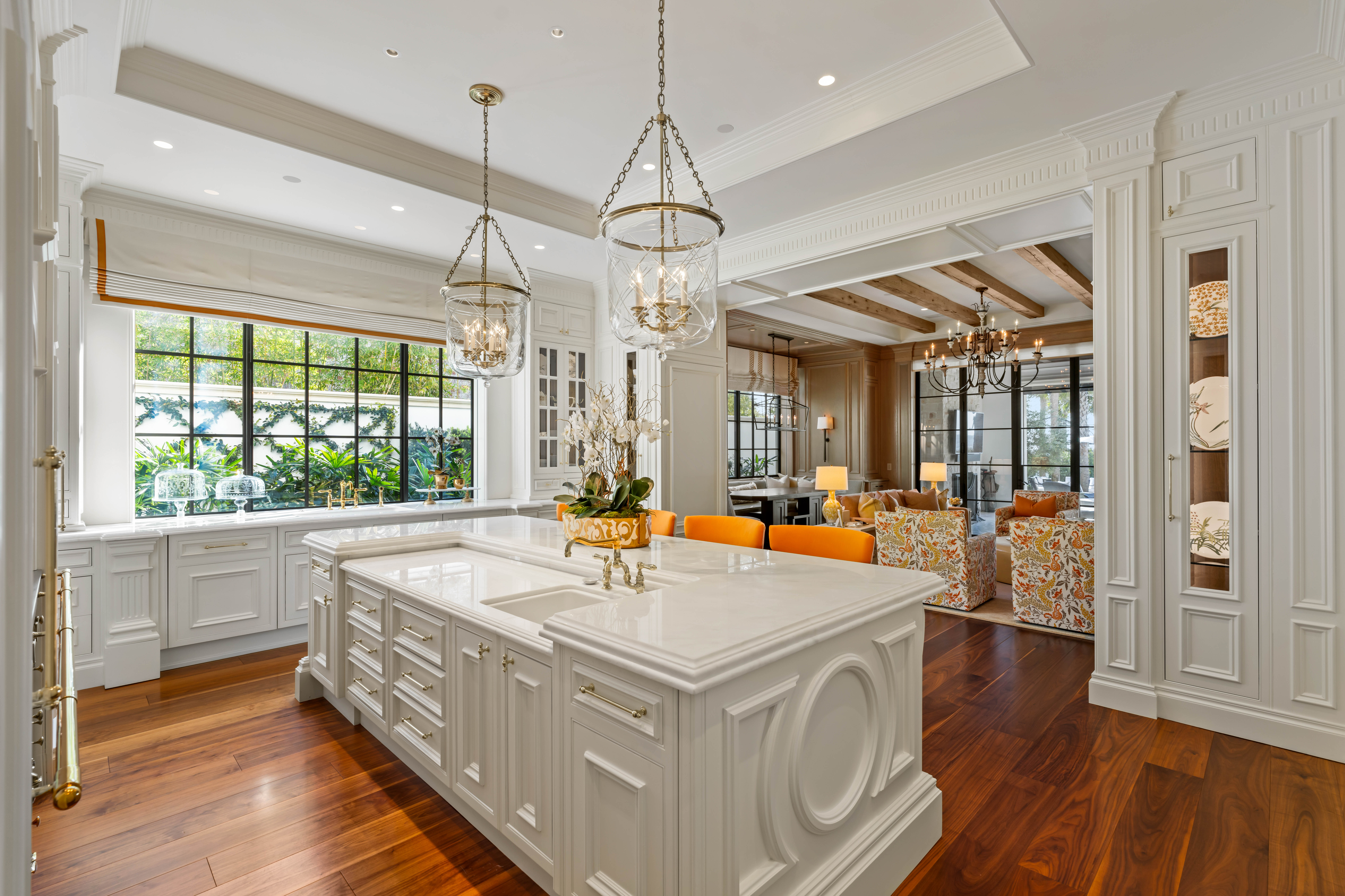 Spanning over 11,000 square feet, the residence unfolds as a series of refined living environments where scale, proportion, and materiality are meticulously considered. Interiors evoke a distinguished European private estate, featuring hand-carved moldings by J.P. Weaver, museum-quality St. Louis crystal lighting, custom hardware by P.E. Guerin, and bespoke cabinetry by Clive Christian.