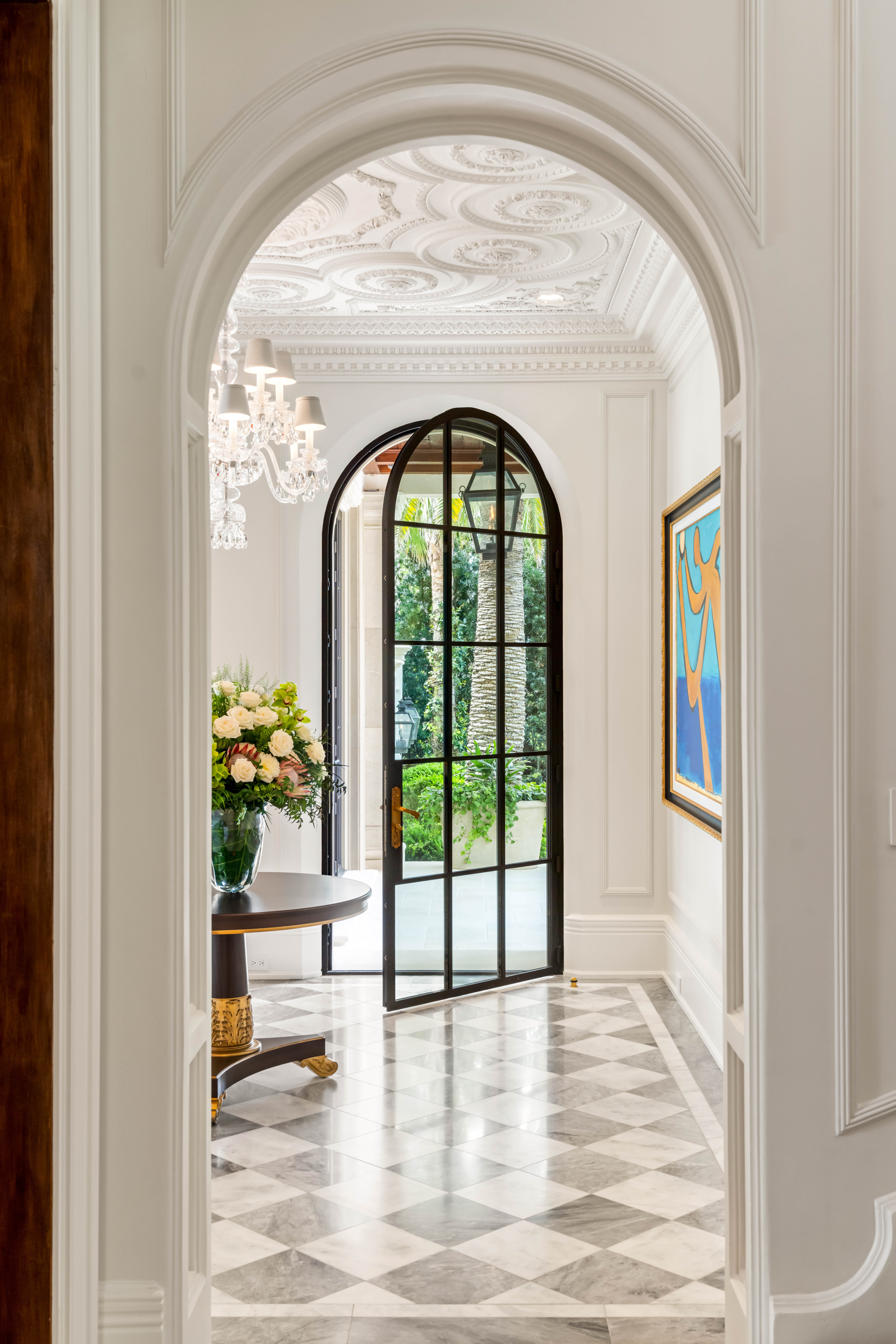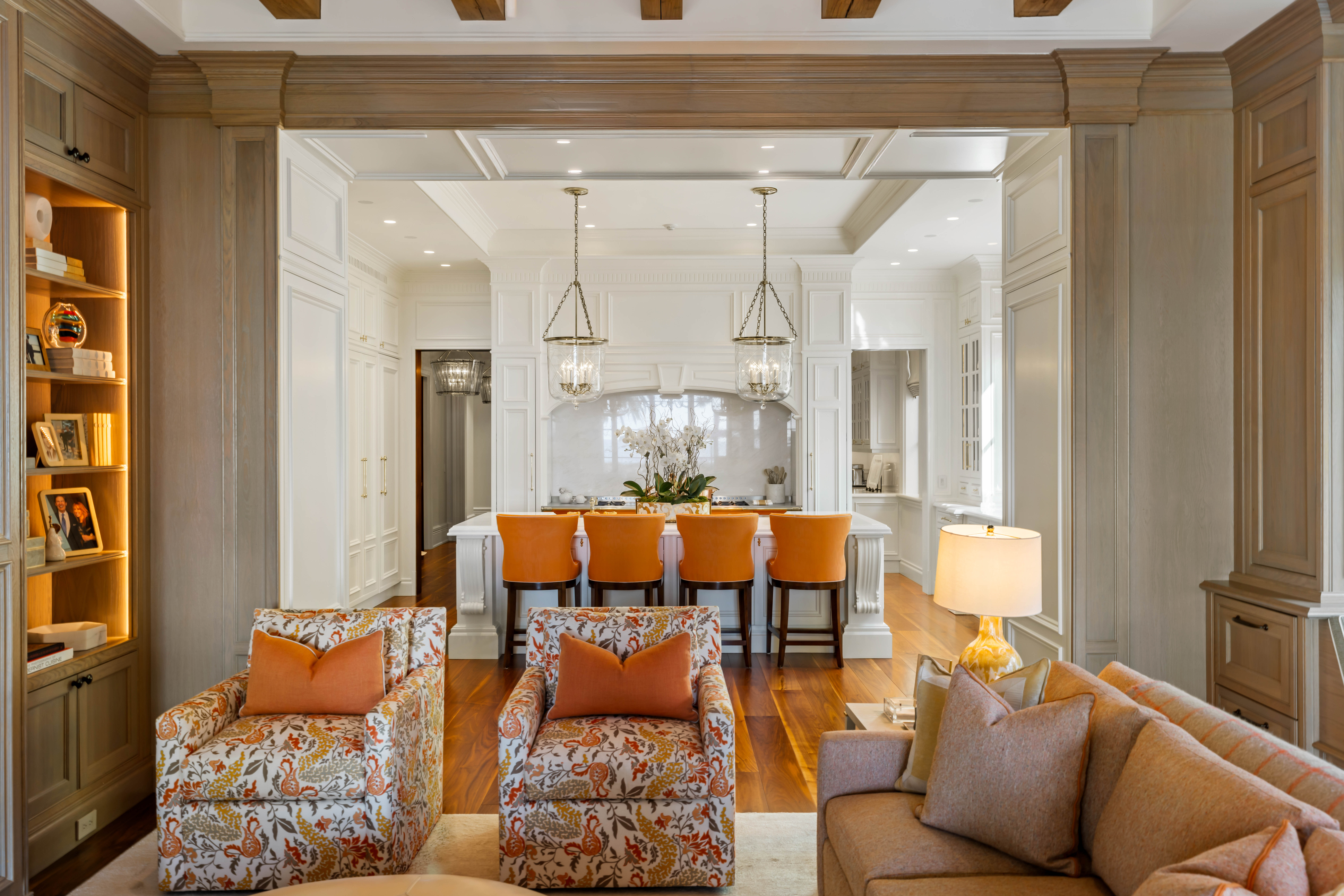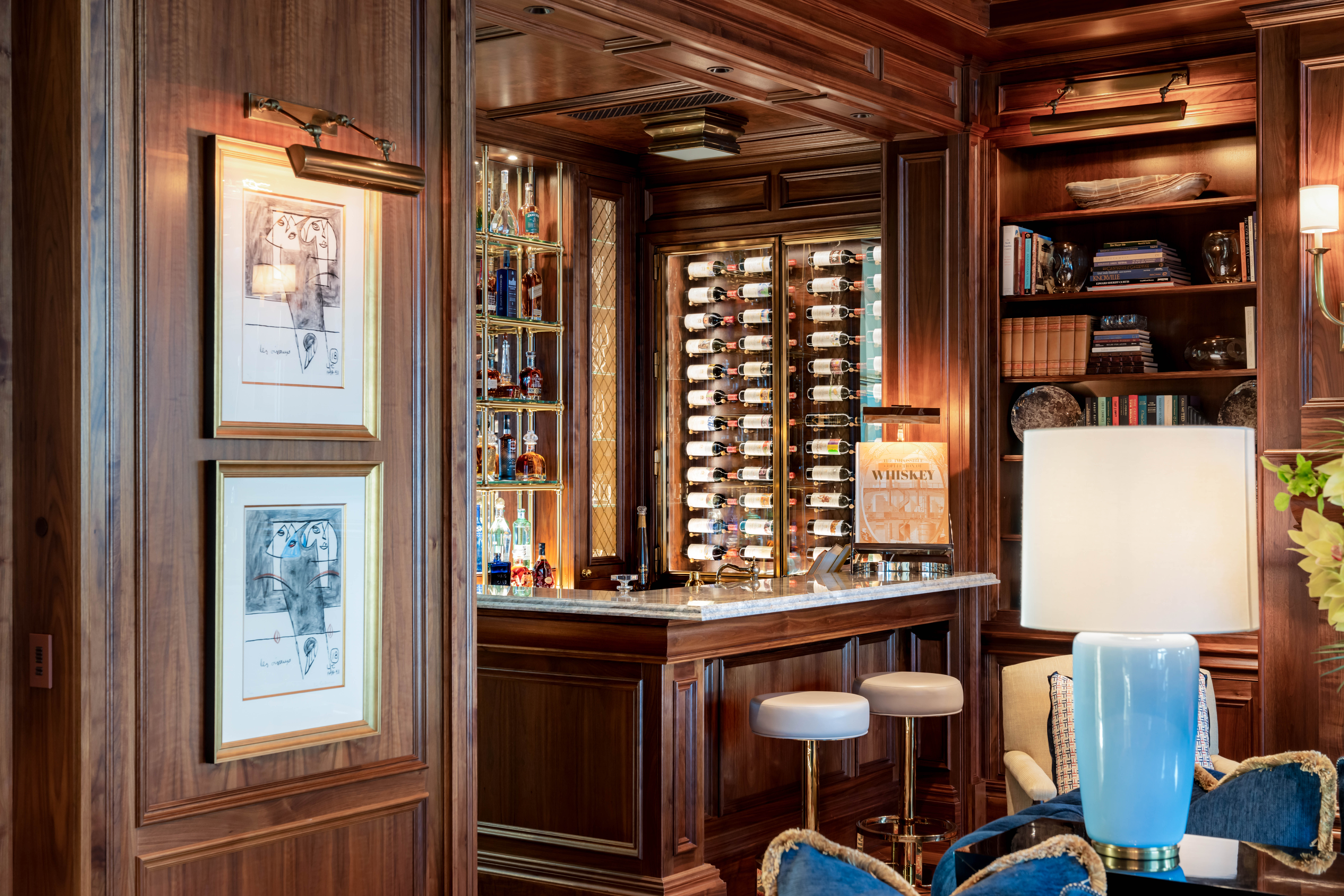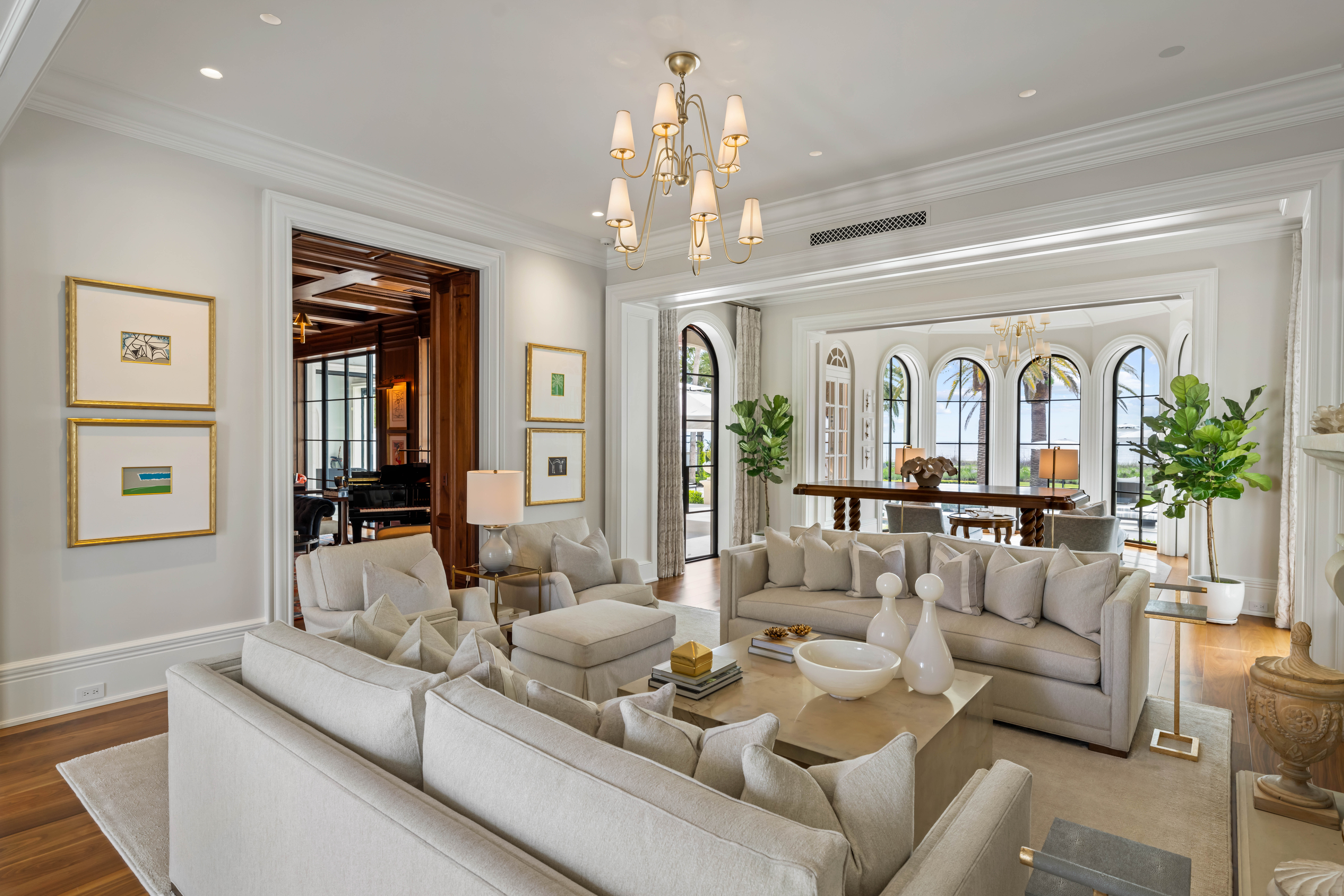 Spanning over 11,000 square feet, the residence unfolds as a series of refined living environments where scale, proportion, and materiality are meticulously considered. Interiors evoke a distinguished European private estate, featuring hand-carved moldings by J.P. Weaver, museum-quality St. Louis crystal lighting, custom hardware by P.E. Guerin, and bespoke cabinetry by Clive Christian.