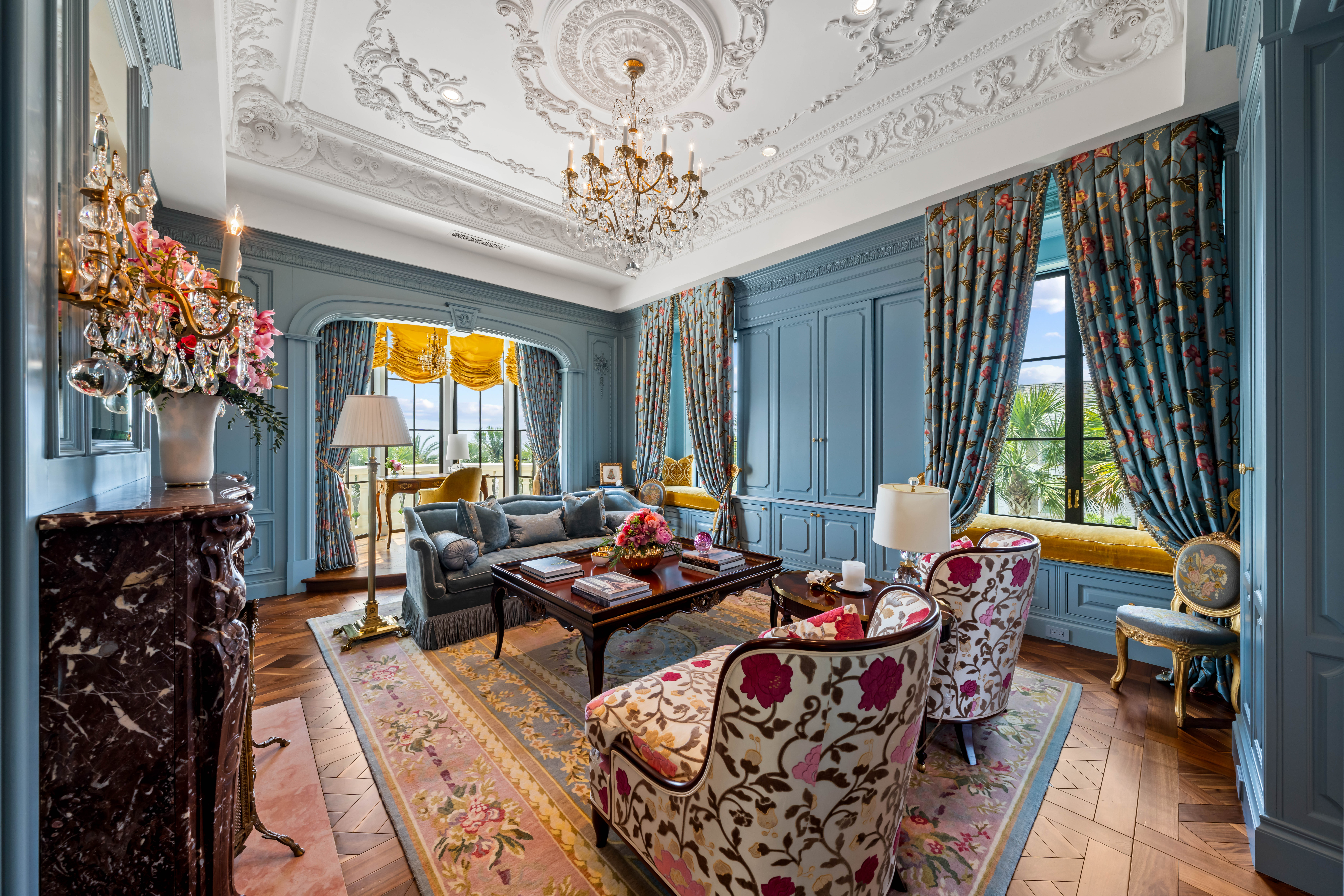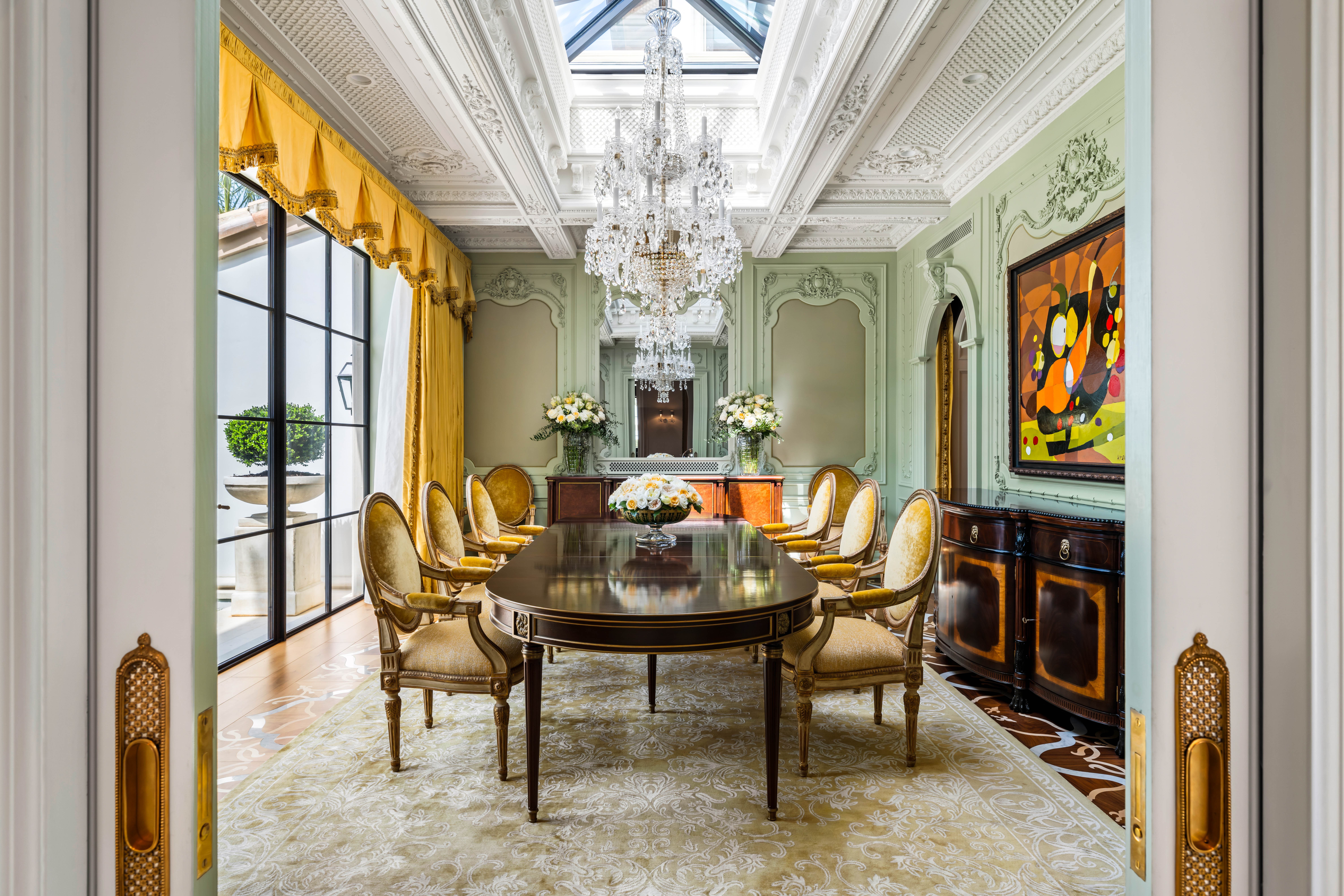 Formal and informal spaces transition seamlessly—from a Parisian-inspired dining room beneath a skylight to a richly paneled library and bar. The primary suite serves as a private sanctuary with dual studies, bespoke dressing rooms, and marble-clad baths. Guest accommodations offer ensuite privacy throughout, including a third-floor suite with elevator access.