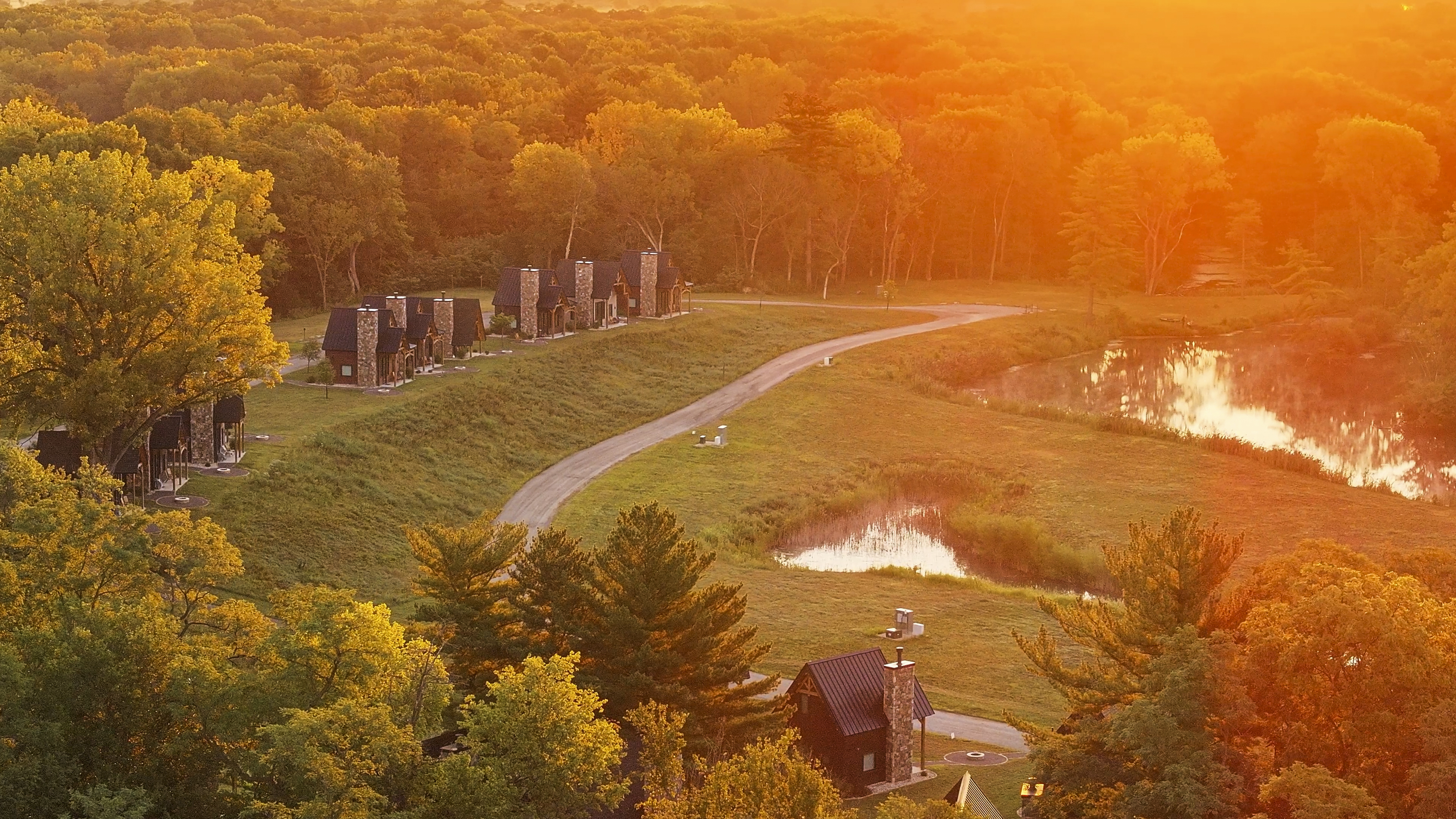 Set on approximately 213 acres of scenic lakes and mature timber in Knox County, just moments from the Oak Run Lake community, Dragonfly Lakes is a one-of-a-kind luxury resort that blends rustic charm with a deep connection to nature. This thoughtfully designed retreat features 20 beautifully crafted timber-frame cabins, each fully furnished and equipped with high-speed internet, wood-burning fireplaces, and private outdoor fire pits. Every cabin is perfectly positioned to capture serene water views, overlooking one of the property's large, stocked lakes. The expansive grounds include two sizable lakes along with several smaller bodies of water, creating a stunning landscape with ample opportunity for future expansion. A central stretch of land below the existing cabins offers an picture-perfect setting for a wedding venue or event space, further enhancing the property's income potential. Infrastructure is already in place, with water and high-speed internet servicing the development, and public sewer under consideration. A striking custom timber-frame gatehouse welcomes guests upon arrival and presents an opportunity for additional amenities such as laundry services, retail, or fishing outfitting. Guests can enjoy kayaking on each lake or explore miles of scenic trails winding through the wooded terrain. Bordering the highly sought-after Oak Run Resort, a premier vacation destination featuring a 600-acre lake and 18-hole golf course. Dragonfly Lakes is ideally positioned as a complementary luxury offering. Whether envisioned as a private retreat, wedding destination, hunting club, duck club, or income-generating resort, this exceptional property delivers a rare combination of natural beauty, modern comfort, and future potential.