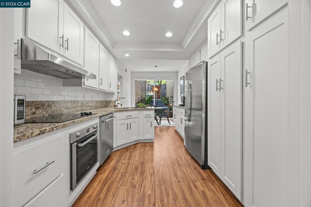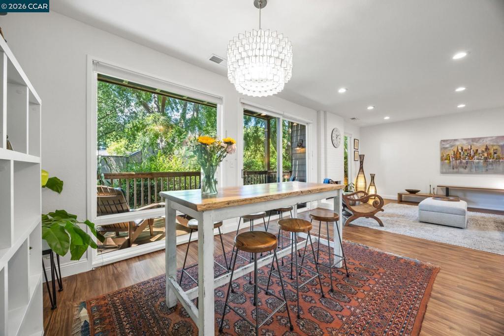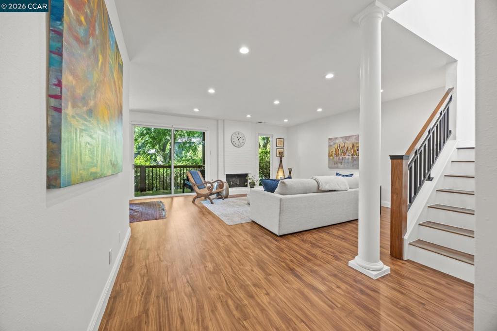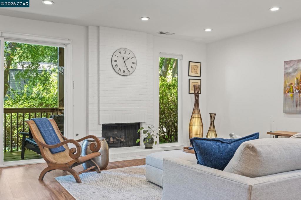 Turnkey living in coveted Summit Ridge! This light-filled 2,433 sq ft townhome is ideally located on a peaceful cul-de-sac, surrounded by open space and scenic hiking trails. A thoughtfully designed floor plan offers seamless flow for everyday living and entertaining. The updated kitchen features refreshed cabinetry (2025), white subway tile backsplash, stone countertops, stainless steel appliances, and a sunny dining area. The formal dining room opens to a private, tree-lined deck, while the spacious living room impresses with soaring ceilings, a fireplace, and abundant natural light. The expansive primary suite is a true retreat with a private balcony, fireplace, spa-like bath, and custom walk-in closet. A versatile bonus space off the suite is perfect for a home office, gym, or den. Two additional bedrooms share a dual-vanity hall bath. Approximately $77K in upgrades include a heat pump HVAC (2023), EV charger (2023), kitchen updates (2025), interior paint (2026), and a new roof scheduled for installation. The community also features modern fiber cement siding (2022) for enhanced curb appeal and fire resistance. Additional highlights include hardwood floors, dual-pane windows, laundry room, and attached 2-car garage. Enjoy pool, clubhouse, greenbelt, and top-rated Lafayette schools - just minutes to BART, freeways, and downtown Lafayette and Walnut Creek.