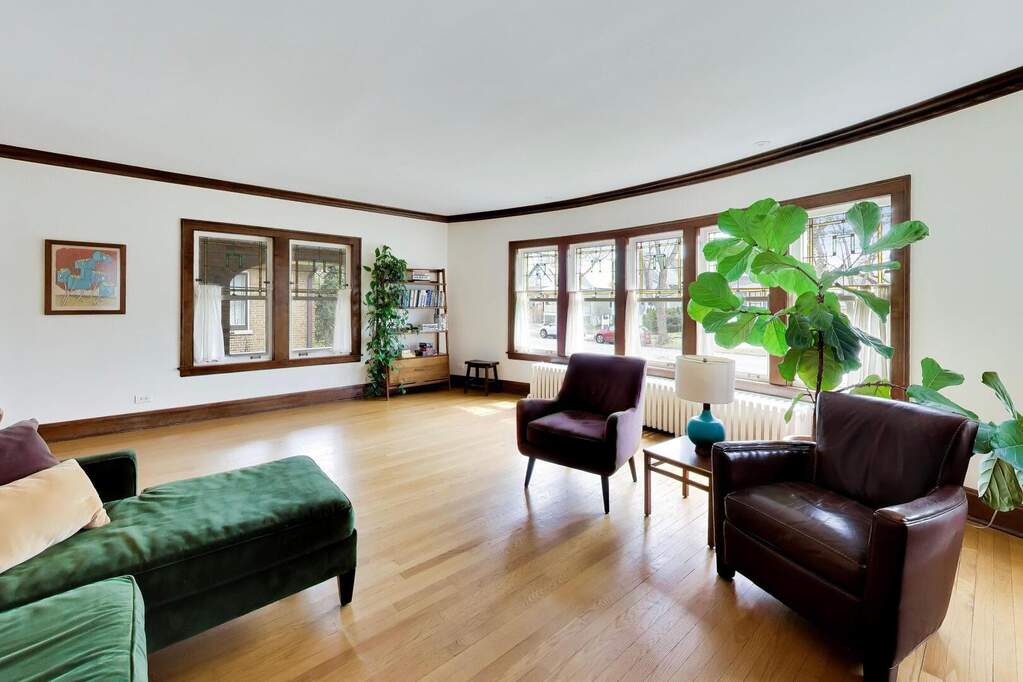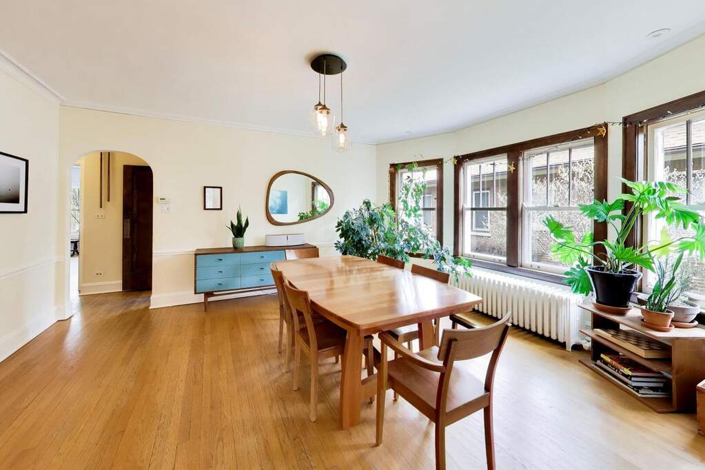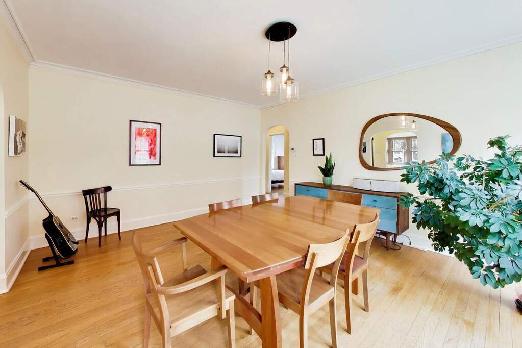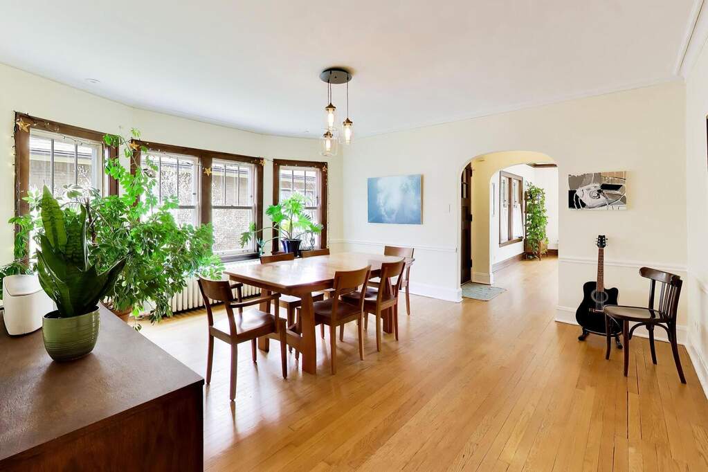 Beautiful JUMBO brick BUNGALOW in the sought-after DEWEY neighborhood. This is a very special home! Large rooms, great light, lovely vintage details--all carefully maintained & thoughtfully UPDATED. Admire the bow front as you walk up the steps onto the COVERED FRONT PORCH which has arched openings, a wooden ceiling, & roses climbing the walls outside. HUGE LIVING ROOM with three exposures, curving leaded glass windows & a WOOD-BURNING FIREPLACE (with a restored & lined chimney). SEPARATE DINING ROOM has bay windows and again gets GREAT LIGHT because the house next door (a near twin) is set a good distance away. Two WELL-SIZED BEDROOMS with great closet space & a carefully RESTORED SUBWAY TILE BATHROOM on this level. SPACIOUS KITCHEN with butcher block counters & a pantry. Heated SUNROOM leads out onto the DECK overlooking the LOVELY BACK YARD. Fantastic 2nd level can be used as an ENORMOUS PRIMARY SUITE or (as it is now) FLEX SPACE for a family room, office, & sitting room. Very large full bath with DOUBLE VANITY on 2nd floor. Kitchenette with sink & under-counter fridge. CENTRAL AIR (SpacePak) cools 1st & 2nd floors. HARDWOOD FLOORS throughout. Enormous, almost 1,700sf BASEMENT has HIGH CEILINGS and LARGE WINDOWS. Great for storage, ping pong & roller skating as it is, but also offers ENORMOUS POTENTIAL as a finished space. You could easily add 2 bedrooms, a bathroom & a family room down here. Fully FENCED YARD with ornamental trees (red buds, serviceberry, Japanese maple, dogwood), perennial flowers & fruits (blackberries, red currants, black currants & more), raised beds & a patio. One and a half car garage. FANTASTIC WALKABLE LOCATION just 2 blocks from PENNY PARK, 3 from Cherry Preschool, 4 from DEWEY ELEMENTARY & less than a mile to downtown Evanston & the Metra / El. The very best of urban-suburban living!