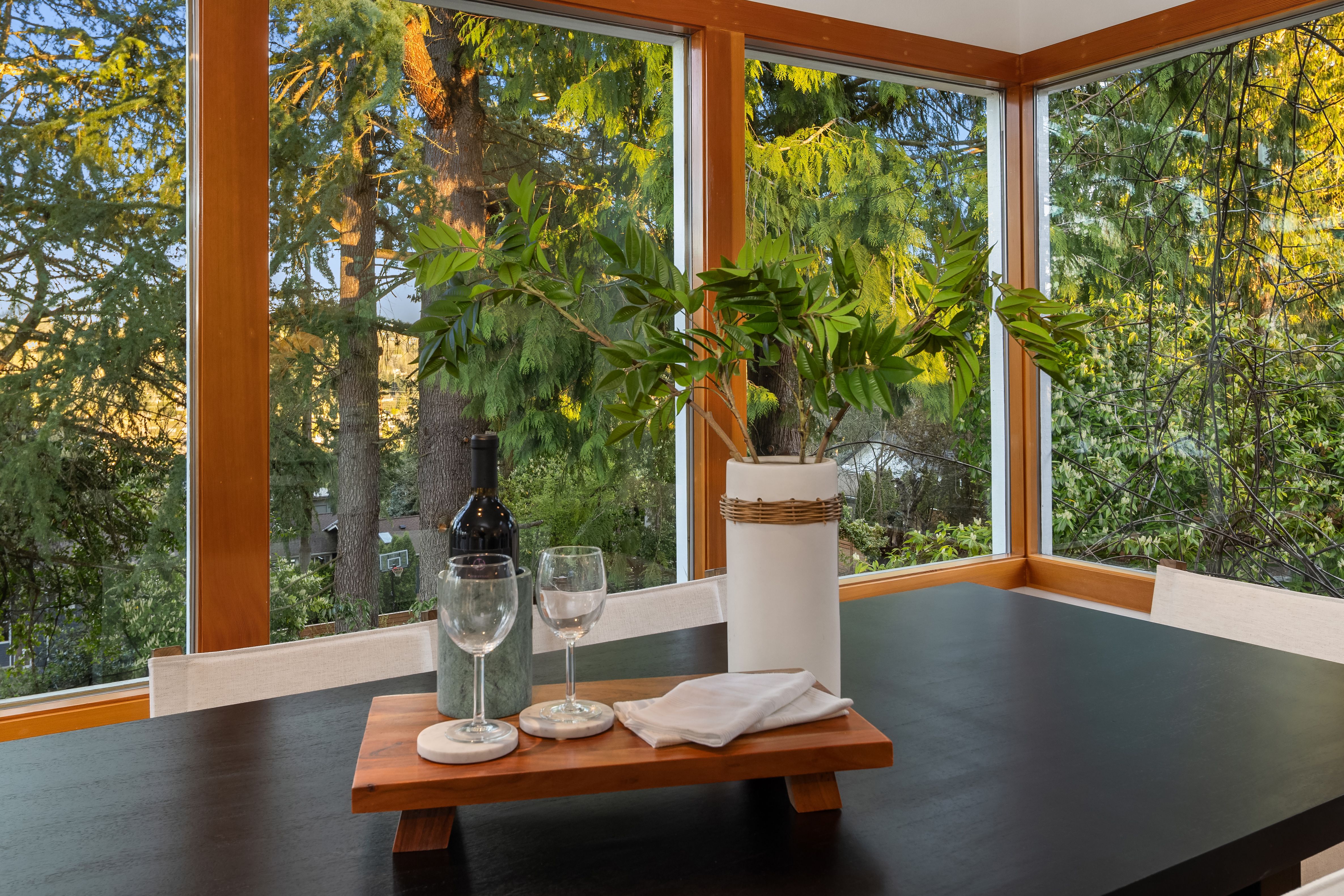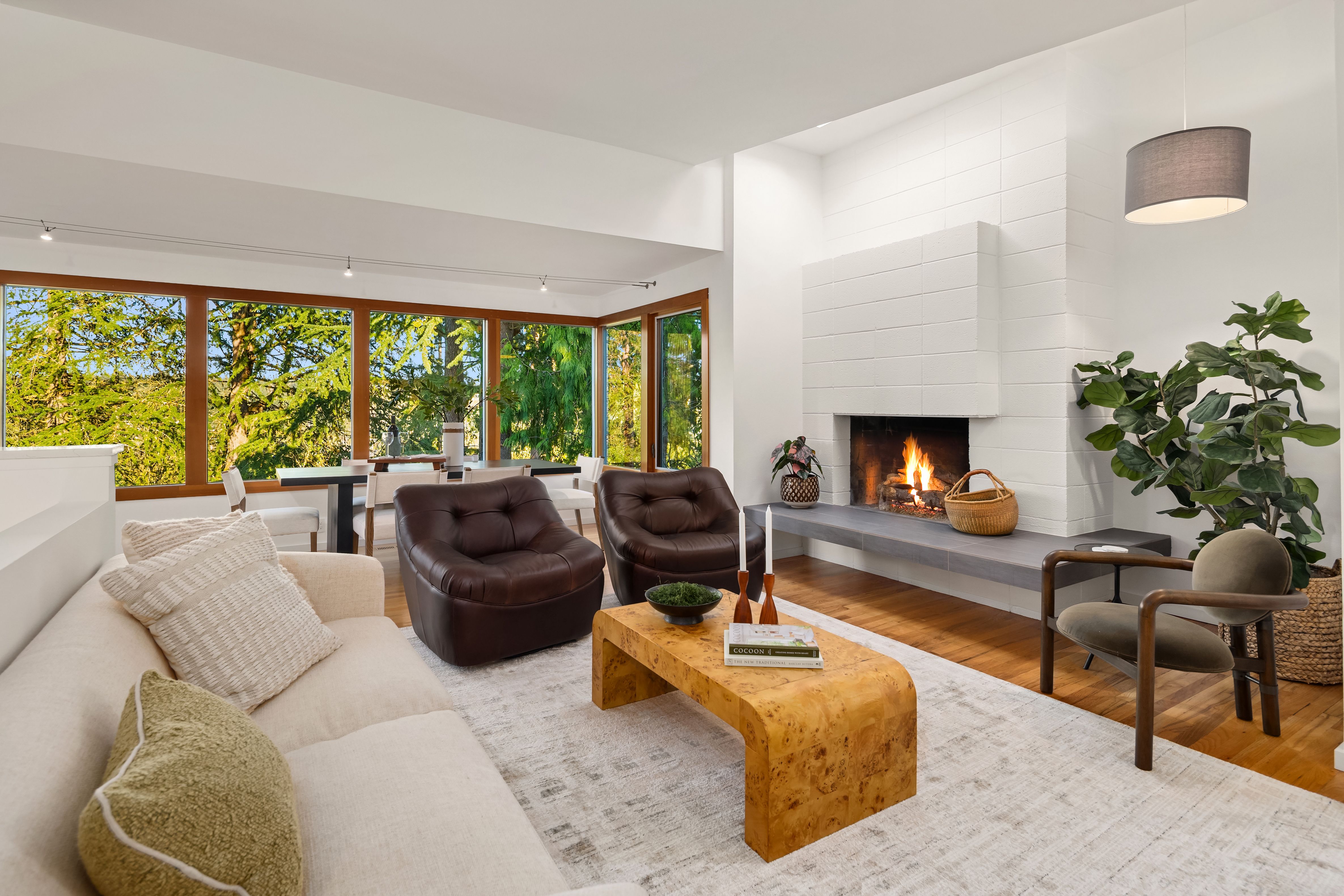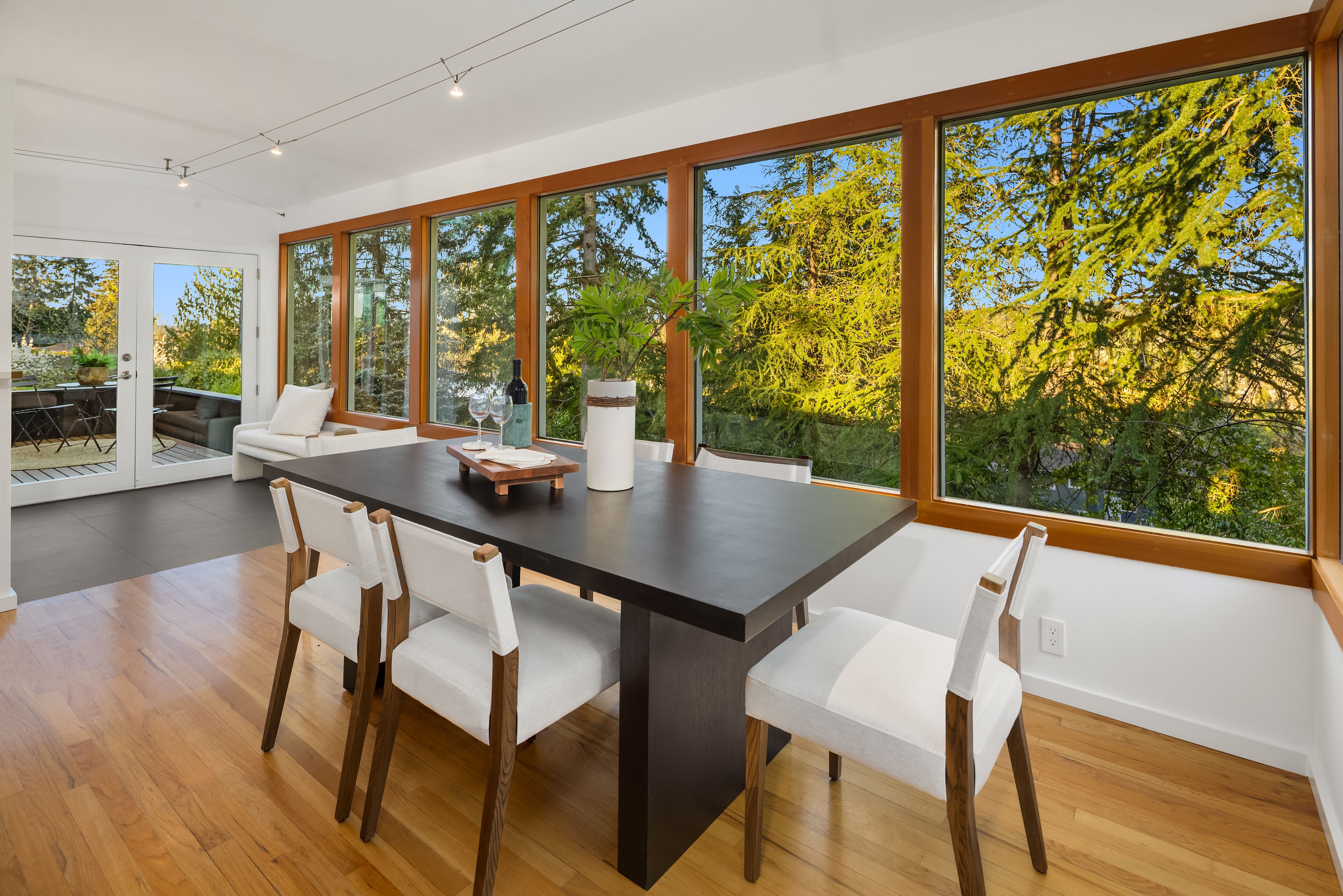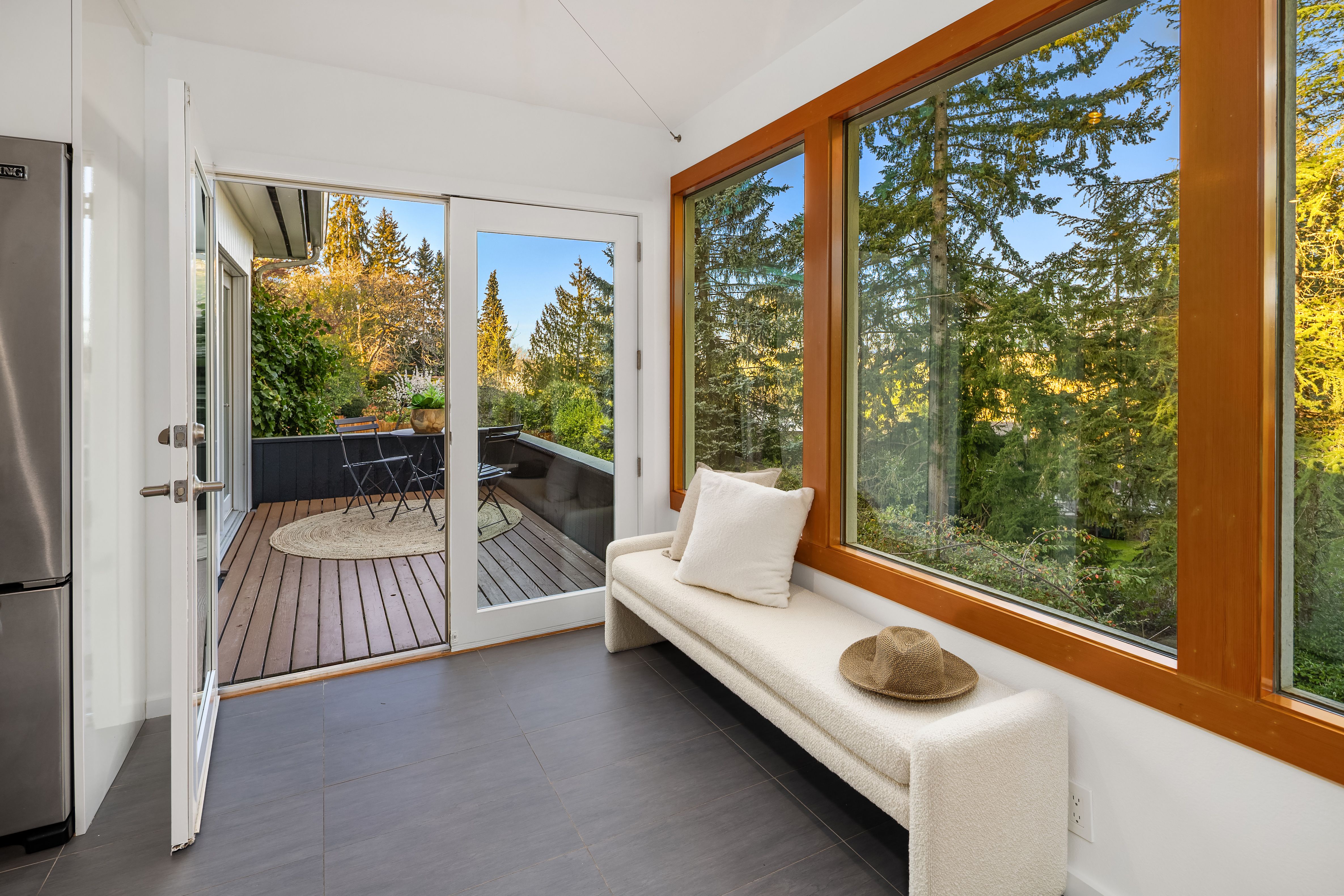 A rare offering in the heart of Norwood Village, this exquisitely restored mid-century jewel box blends timeless architecture with sophisticated modern living. Thoughtfully reimagined, the home showcases elevated finishes throughout—from heated floors underfoot to a state-of-the-art chef’s kitchen designed for both beauty and performance. Walls of glass frame serene, private gardens, creating a seamless connection between indoor and outdoor living. Dual fireplaces anchor each level with warmth and elegance, while the lower level presents a luxurious retreat-ideal as a primary suite, executive office, or private guest quarters. Freshly curated inside and out, the home features new paint, refined landscaping, expansive decks designed for effortless entertaining. A striking grape arbor crowns the main deck, overlooking a tranquil setting of hot tub, manicured lawn, and mature trees that offer exceptional privacy. Vaulted ceilings and skylights bathe the main living spaces in natural light, enhancing the home’s architectural character and airy ambiance. Perfectly positioned at the intersection of Norwood Village and Woodridge, this residence offers unparalleled access to community amenities including pools, tennis and basketball courts, and Woodridge Elementary—all just moments away. Enjoy the rare combination of peaceful neighborhood living with immediate proximity to downtown Bellevue, major freeways, and transit. This is a refined expression of Eastside living—private, connected, and effortlessly elegant.