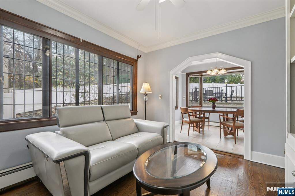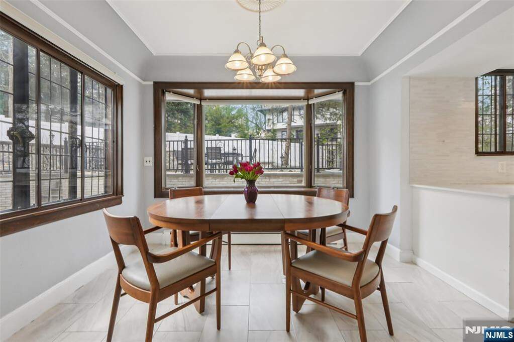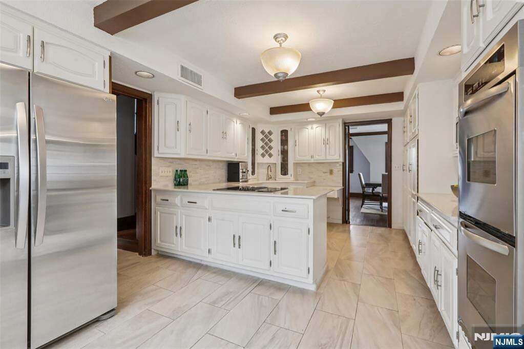 Nestled on prestigious Heights Road, just moments from Ridgewood's iconic Manhattan skyline overlook, this immaculately restored 4,300 SF Tudor masterfully blends old-world elegance with modern luxury. The grand center-hall foyer introduces a sophisticated main level, featuring an expansive front-to-back family room anchored by a stunning coffered ceiling and wood-burning fireplace, and a banquet-sized dining room that flows seamlessly into a charming three-season porch and private bluestone patio. A rejuvenated kitchen with a window-lined breakfast nook and new porcelain tile flooring, a sun-drenched den, and a powder room complete the first floor. Upstairs offers a spacious Primary Suite with a walk-in closet and an ensuite full bath, 3 additional bedrooms, a spa-like hallway bath, and a third level with 2 more bedrooms and a full bath. The lower level adds significant value with a recreation room, laundry, new half bath, and access to a 2-story attached 2-car garage with new epoxy floors. Boasting a remodeled fenced backyard with a two-tier patio and shed, a 4-year-young slate roof and gutters, bluestone walkways, and designer lighting, this turnkey residence offers a rare combination of architectural integrity and contemporary comfort in one of Bergen County's most coveted locations.